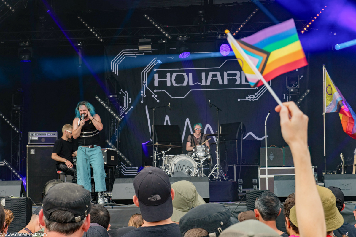 Pour lancer les hostilités sur la Valley, le trio parisien démarre son set en toute décontraction, soufflant dans ce que nous appellerons un biniouotron (soit une pipe électronique qui fonctionne sur le principe du kazoo) avant d’allumer le feu sur les planches. Howard, qui a réduit la place du clavier dans sa musique, évolue entre différents styles qu’il est difficile de répertorier ici. Le chanteur JM fait l’annonce de sa non binarité et entraîne le public derrière lui dans un circle pit de tendresse et un fier wall of Love. On ressort de là sans la certitude d’avoir réellement vu un concert de metal, mais qu’importe car la foule nombreuse repart avec le sourire aux lèvres et des arcs en ciel dans les yeux.