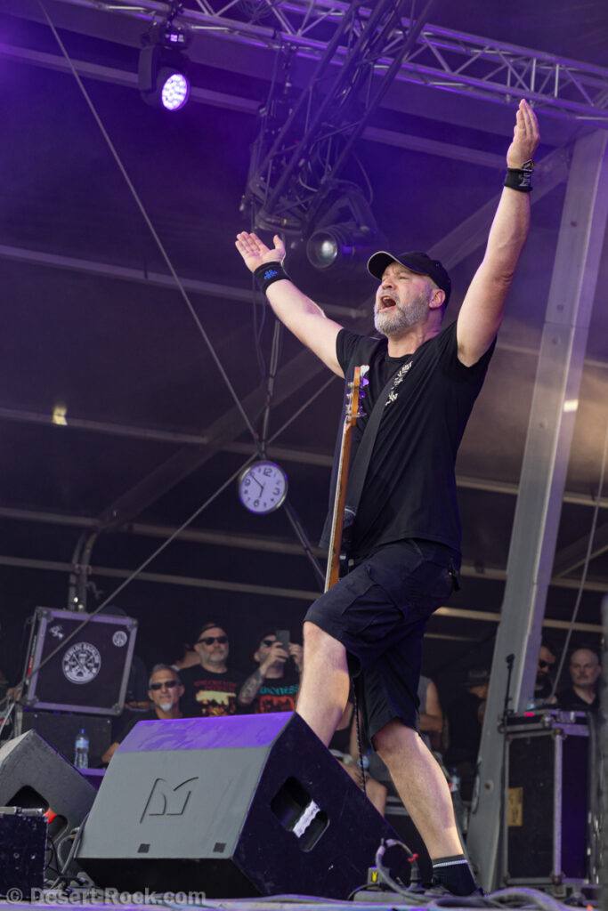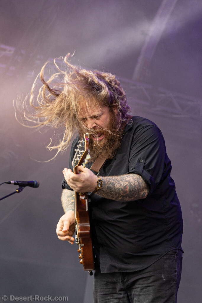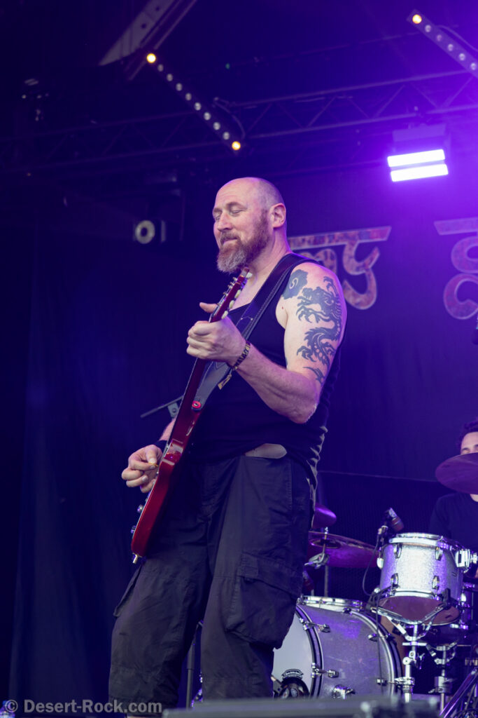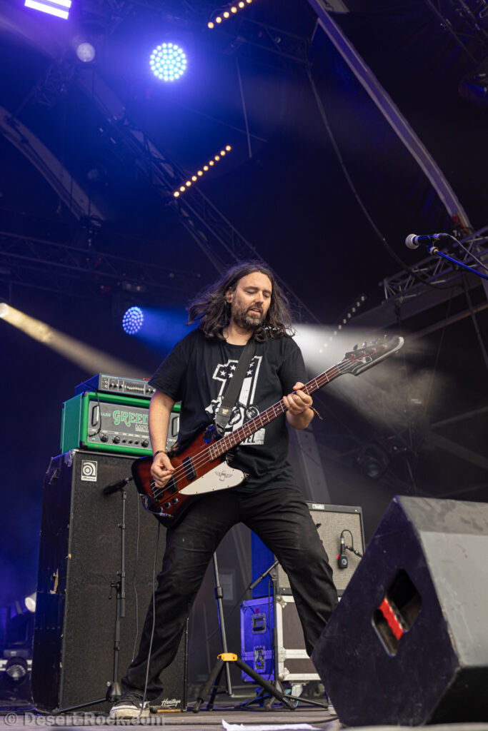 S’il y a un groupe à la carrière chaotique, c’est bien The Midnight Ghost Train. Depuis une dizaine d’années, le groupe a connu diverses pauses (voire des arrêts “définitifs”), des mini tournées ou concerts ici ou là, évidemment des changements de personnel autour de Steve Moss, etc… Et pour 2025, cette mini-tournée européenne autour du Hellfest est annoncée comme (probablement) la dernière du groupe ! A l’heure du concert, Steve Moss arrive avec le sourire, mais… repart en coulisses immédiatement. Une corde cassée apparemment… Moins de deux minutes plus tard, il revient, sans impact donc, et nous aurons mis à profit ce temps de pause pour découvrir que la composition du groupe avait complètement changé, nouveau batteur et nouveau bassiste – ce dernier étant en fait Chuy Smit, le guitariste de Sons of Node, le groupe néérlandais qui accompagne TMGT sur cette tournée ! Bref, Moss fait vrombir le fuzz obèse de sa guitare et lance un furieux “Along the Chasm”. Enchaîné à ce rageur “Gladstone” cher à nos cœurs puis à ce glorieux “BC Trucker”, on comprend vite que cette tournée hommage à l’album Cold Was the Ground qui fête ses 10 ans ne fait pas les choses à moitié, et toutes les compos originales du groupe aujourd’hui en seront issues ! Pas de quoi se plaindre, cet album étant probablement leur plus abouti et réussi. Les premières minutes nous font re-découvrir ce son de guitare glaireux et saturé emblématique qui porte des riffs taillés pour décorner des bœufs, le chant guttural et hargneux de Moss, et un sourire mi-satisfait, mi-nostalgique nous gagne. La section rythmique s’en sort avec les honneurs, et même si l’on regrette un peu les gigues de pachydermes qu’échangeaient Moss et Mike Boyne en faisant vibrer les planches à coups de pieds sur le sol, le trio sous sa forme du jour ne manque pas d’énergie. Pour finir sur une note un peu mitigée, le groupe bouffe complètement son créneau, empiétant de presque 10 minutes sur l’horaire de fin prévu (nos hommages aux techniciens qui doivent rattraper le retard ensuite…). Globalement toutefois, un retour gagnant de TMGT, et un vrai plaisir pour les spectateurs.
