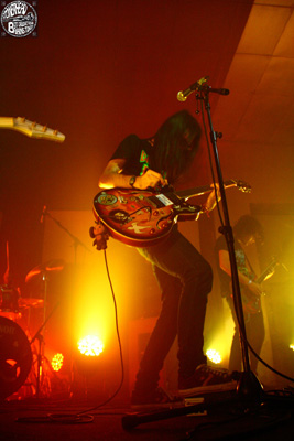 Après plusieurs passages sous la Valley ces dernières années, il apparaissait plus que légitime de voir le quatuor anglais parvenir à la tête d’affiche. Un honneur mérité pour un groupe qui ces dernières années n’a pas ménagé ses efforts. Grisé par cette perspective, on imaginait bien le groupe tendu, crispé par la pression. Ce fut tout le contraire ! Et il n’a pas fallu longtemps pour le constater. Voir le père Ben Ward et ses collègues débouler sur scène (après avoir passé la journée à regarder les autres groupes depuis le bord de la scène) avec le sourire jusqu’aux oreilles aurait dû nous mettre la puce à l’oreille… Ils rentrent dans le lard direct avec un « Scorpionica » toujours efficace, qui prend très vite une tournure électrique. Mais dès le pourtant moyen (sur album) « Devil’s Whip », c’est le public qui devient électrique. Et à partir de là, c’est l’escalade : le groupe s’éclate de plus en plus, gagnant en confiance et en puissance, et le public prend son pied. Deux mondes qui communiquent : sur scène, papa Ward arpente la scène dans tous les sens, s’adresse au public en beuglant, Joe Hoare n’a jamais été aussi souriant et frondeur, Millard est toujours noyé sous cette masse de cheveux blonds, tournoyants non stop, et Chris Turner, dont le set de batterie pas trop loin de la scène le rend enfin visible, participe au show sans réserve. De l’autre côté des barrières, le public, sans trop que l’on comprenne exactement quelle en est la cause (mais on s’en fout), est incandescent, déchaîné : ça slamme, ça gueule, ça chante le poing levé… et le premier rang a la banane, lui aussi. Niveau set list, les gaillards se font plaisir, avec notamment une version de « Saruman’s Wish » qui ne fait même pas redescendre l’ambiance, et quelques petites friandises tel le punkisant « Your World Will Hate This » (issu du sous-estimé Coup de Grâce) ou le vieux « Blue Snow » (Time Traveling Blues). La fin, bien que très traditionnelle (« Quincy The Pigboy » et « Red Tide Rising »… surprise !) ne fait que sonner le glas fatidique d’un set qui aura laissé des traces, sur les corps et dans les têtes. Avouons-le, on a beau adorer Orange Goblin, on ne les pensait pas capables de décrocher ainsi la timbale. Grand.