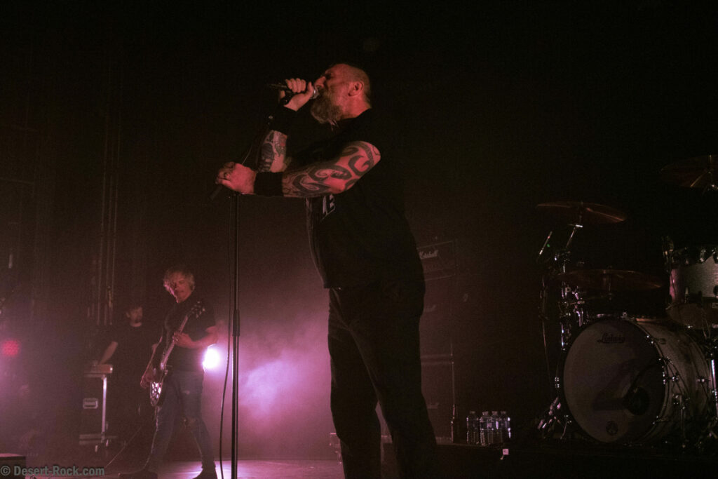 Évidemment, “The Filthy and the Few” déchaîne le pit en cercles furieux et pogos à tout-va. Le plus récent “(Not) Rocket Science”, suivi de “Made of Rats”, ne calme en rien la furie, et “Blue Snow” vient se rappeler à nous et faire monter les pensées déjà les plus nostalgiques de ce qui bientôt ne sera plus Orange Goblin. Un tour de “Devil’s Whip”, et les plus courageux prennent d’assaut la scène pour un stage diving assez rare dans les sets que nous couvrons, que pour être relevé.