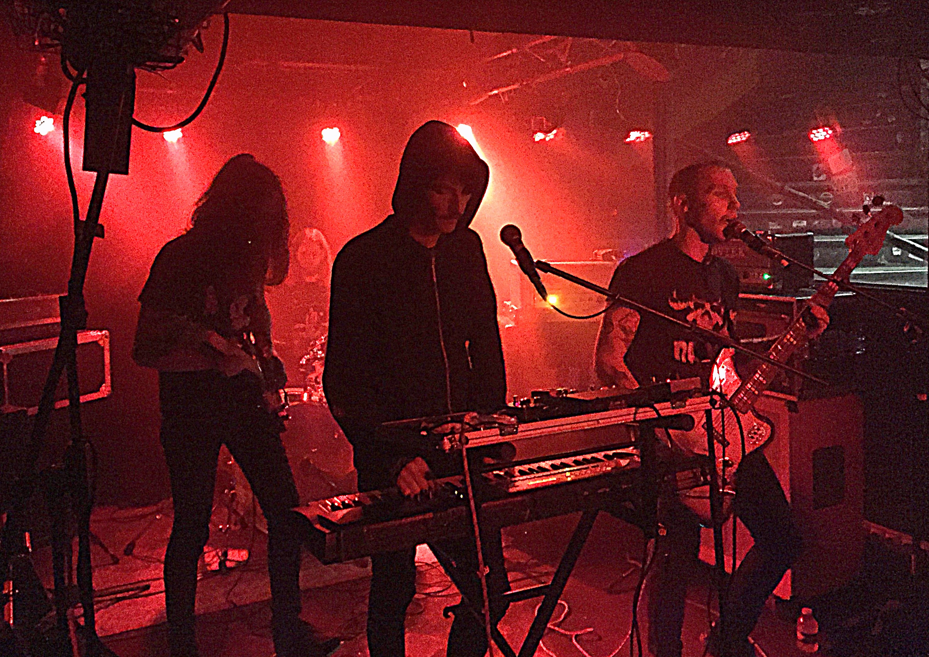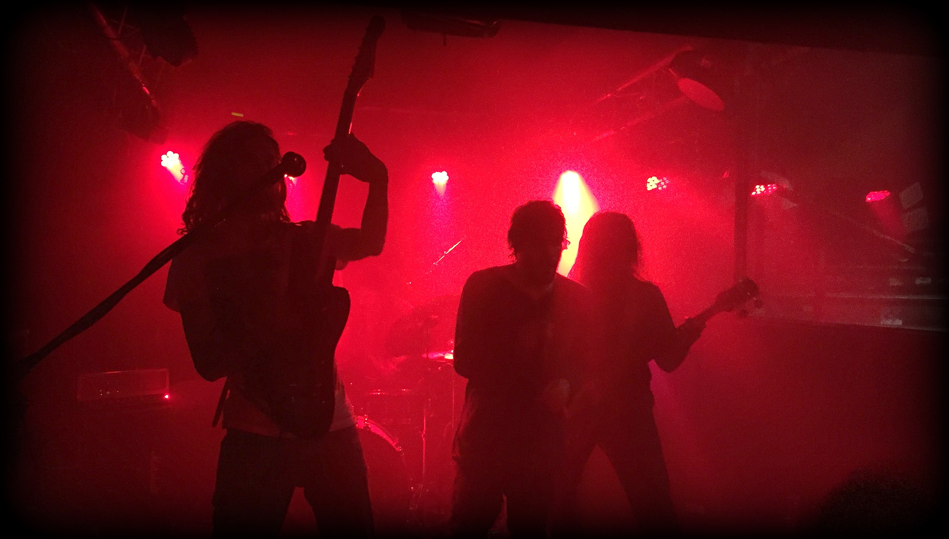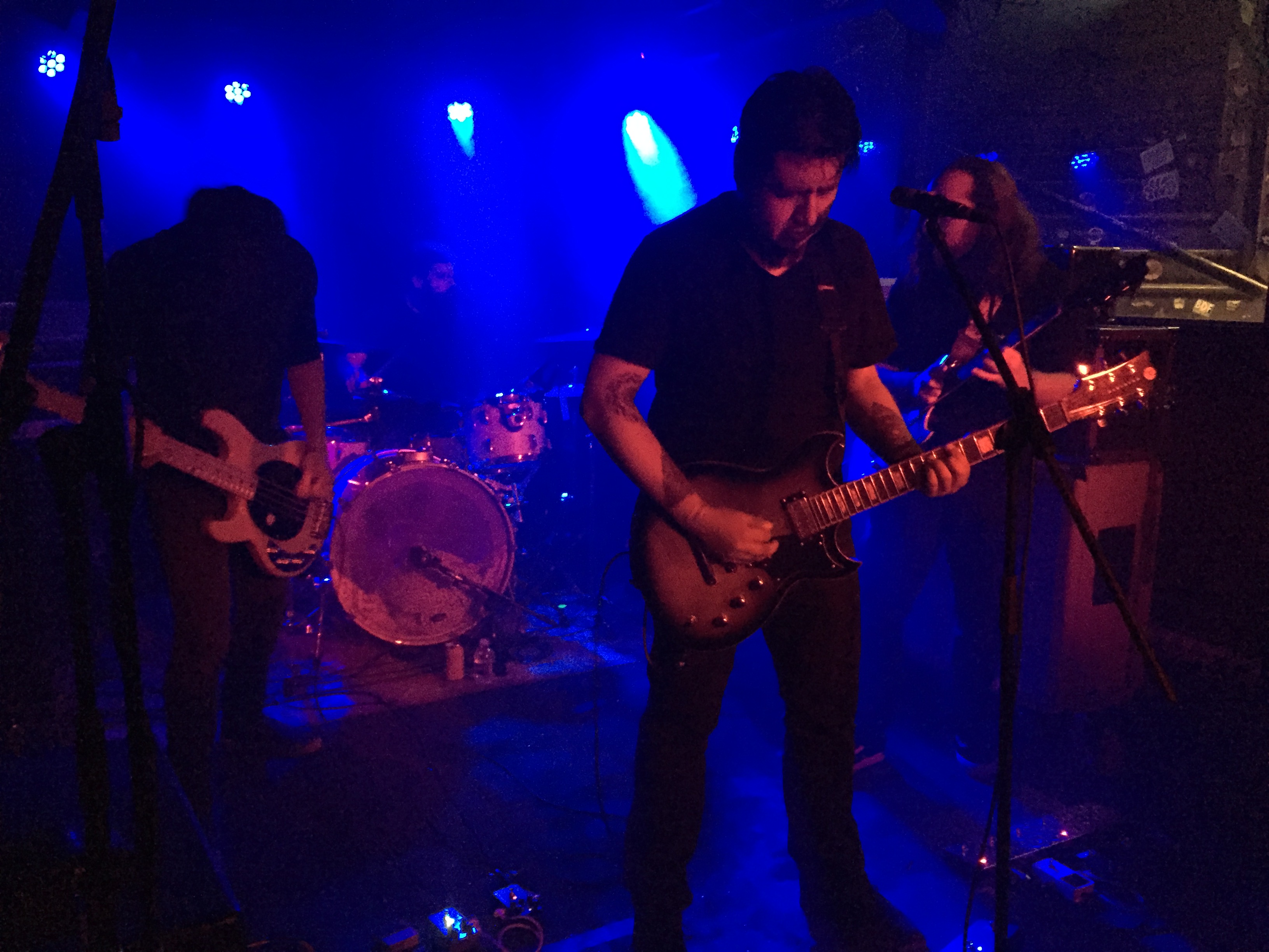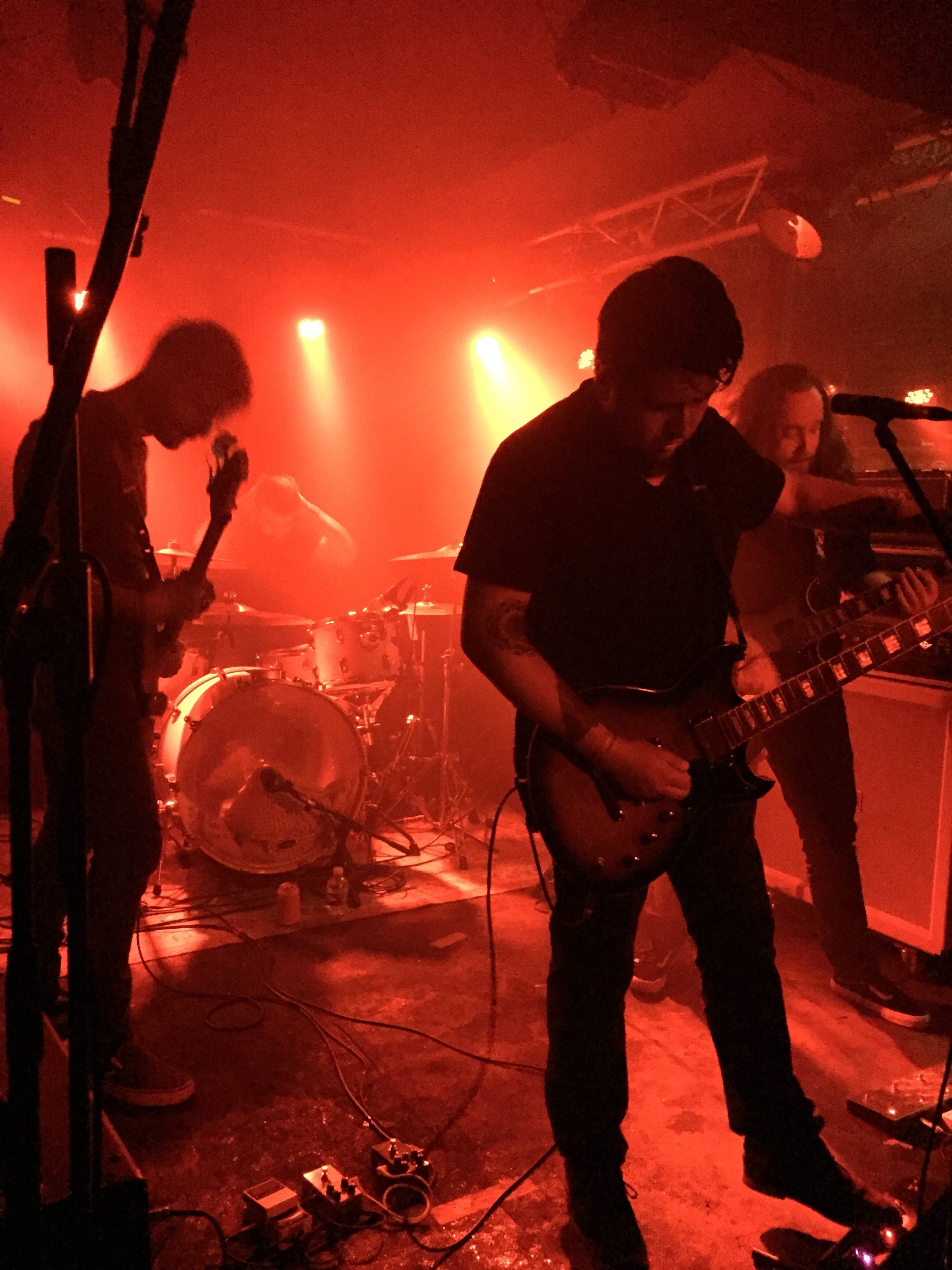 Le temps de remonter vider un réservoir pour en remplir un autre que Greyfell s’installe. Toutefois, lorsque le groupe lâche son premier mur de son, une trop maigre audience se trouve en position pour le recevoir. Là où la team parisienne avait réussi à rameuter ses potes, les mecs de Rouen semblent avoir échoué. Dommage pour les (trop) nombreux déserteurs qui manqueront un set de qualité. Cette fois-ci un clavier trône au-devant de la scène alors que la guitare de Clément flirte avec les cymbales. Pourtant, le frontman ici, c’est Boubakar. Le chanteur et bassiste du groupe qui, à l’aide de sa quatre cordes, impose des riffs telluriques musclés, tandis que son chant aigu et incantatoire envoute la foule. Des mélodies flottantes d’un autre monde surgissent ensuite et composent avec le piano d’Hugo pour générer une tension ténébreuse, abstraite. On se sent sur le fil du rasoir, prêt à voir surgir la tempête à tout moment. Tempête qui nous entraîne dans le cœur de l’abysse sans fond qu’ouvre Greyfell sous nos pieds. En dépit d’une foule qui peine à compter vingt-cinq personnes à son apogée, le quatuor normand se donne. Ça s’agite, ça saute et ça envoie de violents coups de manches aux invisibles démons du doom. Enfin sauf pour l’homme derrière son clavier qui, soit ne crains pas leurs attaques à l’abri de son hoodie à capuche, soit s’est fait vampiriser tout son charisme par son voisin pour se contenter d’une immobilité minérale. Voisin qui finira en sueur et aphone à la fin de la prestation. Pas de place pour la demi-mesure.