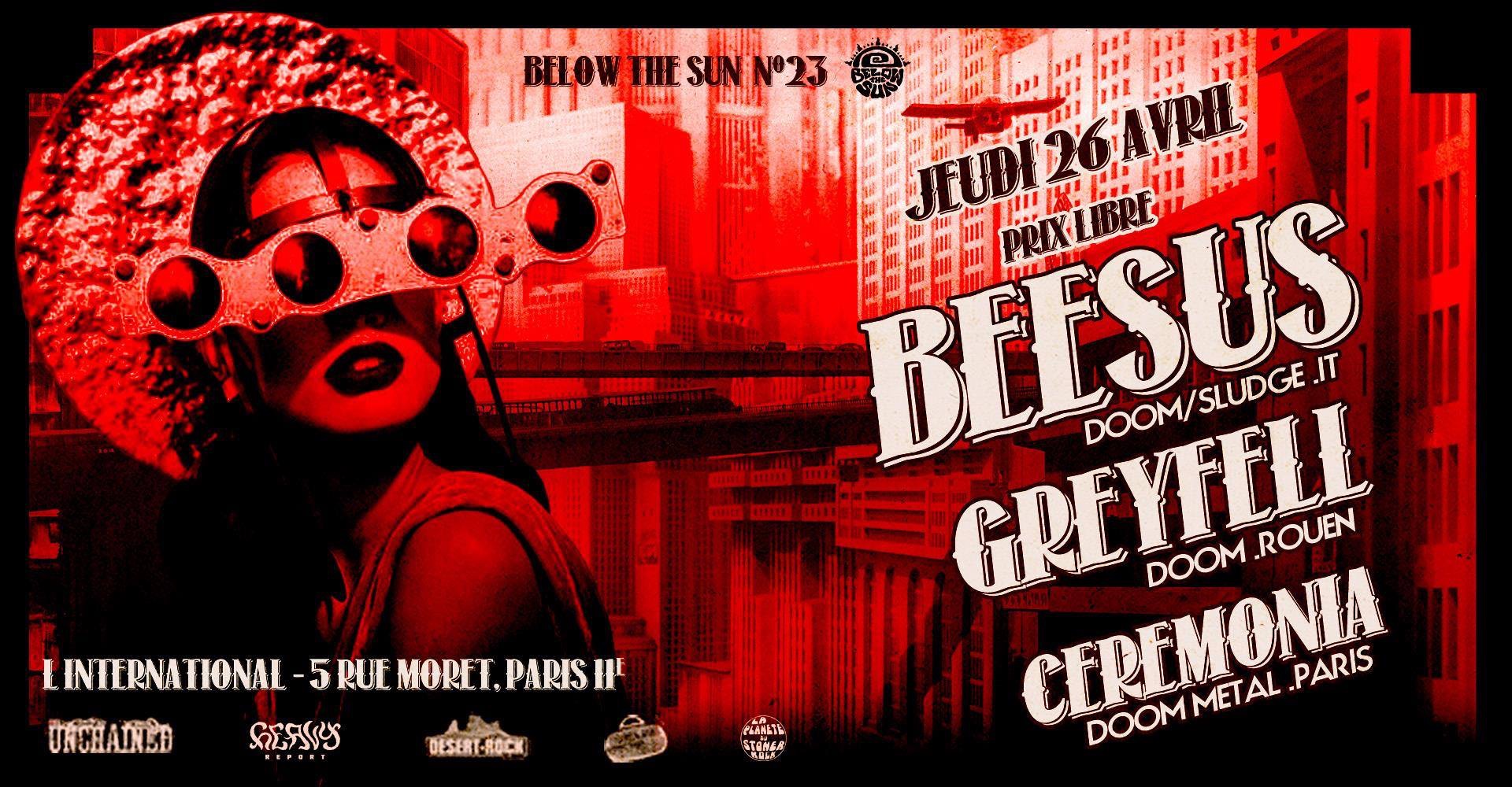 Ah ! L’International. Son positionnement idéal, son videur taciturne et son éternel éclairage rouge et bleu. Ce jeudi 26 avril, on retourne dans cet antre joyeux pour une soirée qui se veut doomesque à souhait. Ni plus ni moins que la vingt-troisième programmation des Below The Sun, qui auront ramené pour l’occasion les Italiens de Beesus, accompagnés de Ceremonia et de Greyfell. Et ce afin de nous décrasser les boites à miel de manière consciencieuse. En plus, c’était prix libre et ça c’est quand même cadeau.