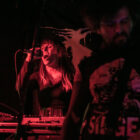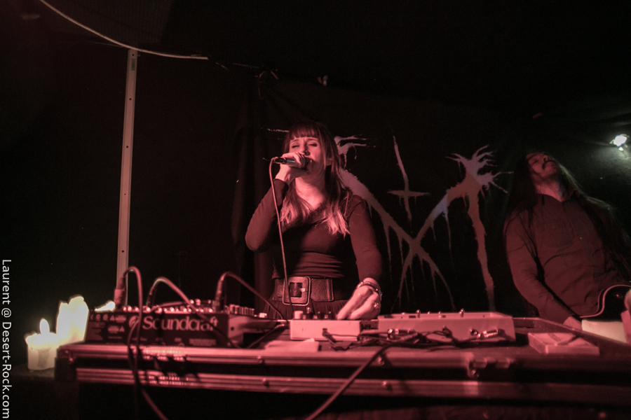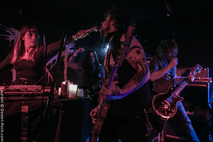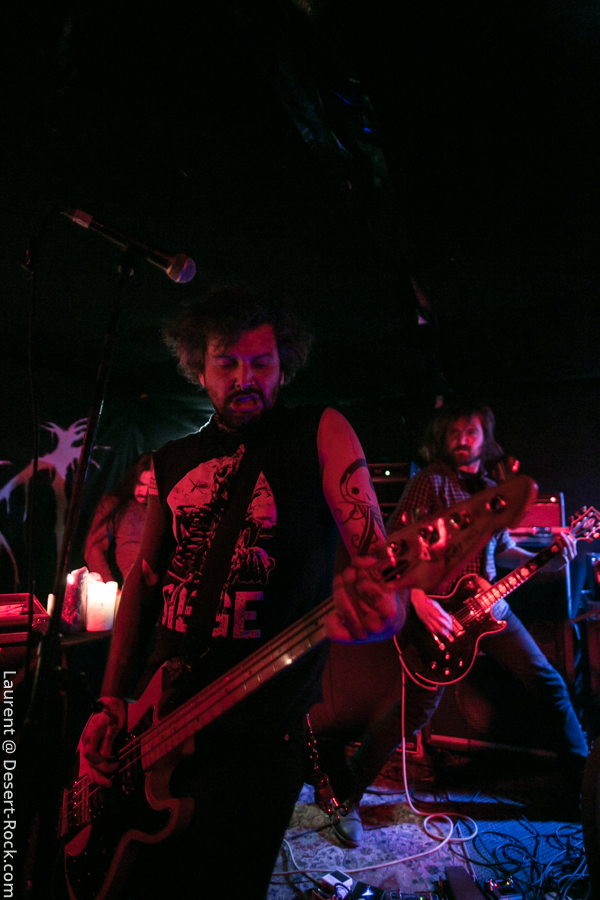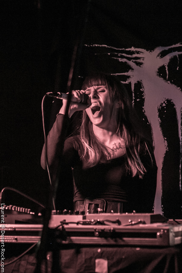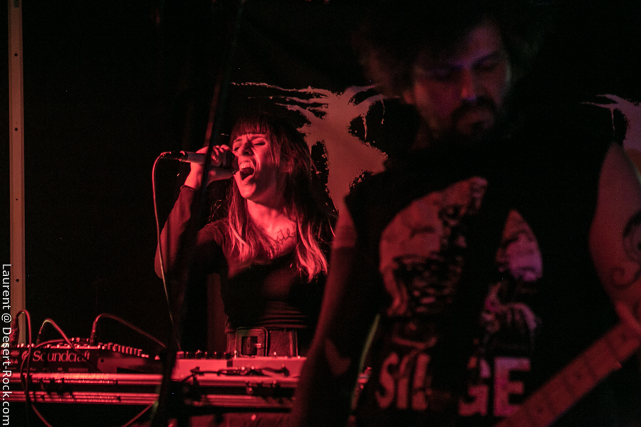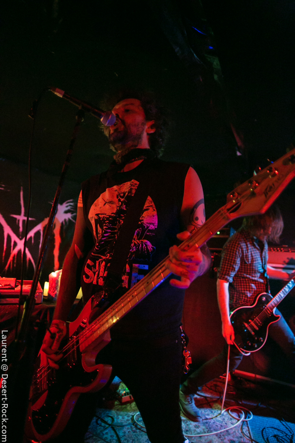 Monarch ! prend la relève et s’installe pour quelques réglages avant de démarrer son « Of Night, With Knives », titre introductif de leur dernier album Never Forever (chronique ici). Comme d’habitude, voir Monarch ! en live est toujours une expérience plaisante. L’échange scénique entre le bassiste et la chanteuse symbolise parfaitement la musique du groupe, un éternel combat entre la lumière et l’obscurité. Malheureusement, sur la date parisienne le groupe fait face durant une bonne partie du set à quelques difficultés techniques qui les empêchent de s’investir pleinement. Ces quelques problèmes sont tout de même bien gérés par le groupe et le public conquis semble n’y voir que du feu. La part belle est faite à Never Forever avec « Song To The Void » et « Cadaverine » qui s’ajoutent à la setlist. Ajoutez à cela une reprise des Misfits (version Monarch ! évidemment ) en fin de concert et vous avez votre apport de lipides pour la soirée.