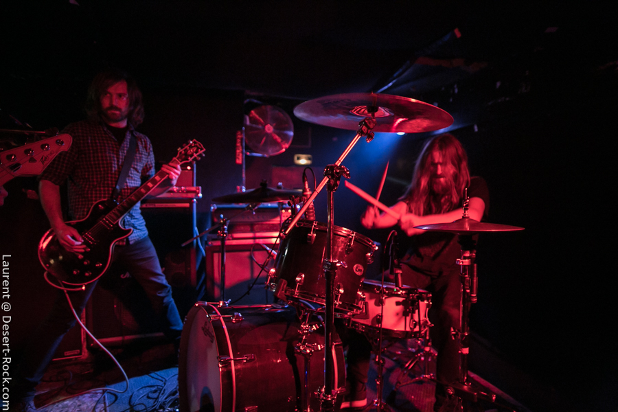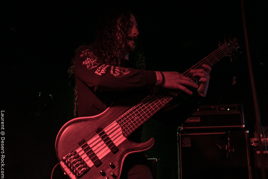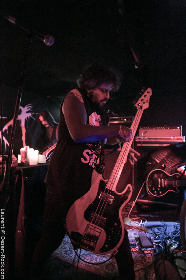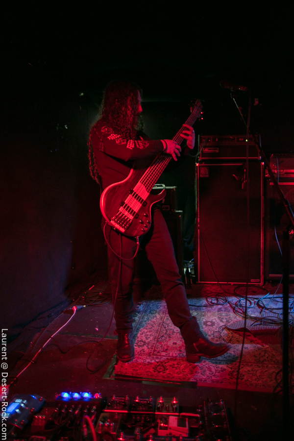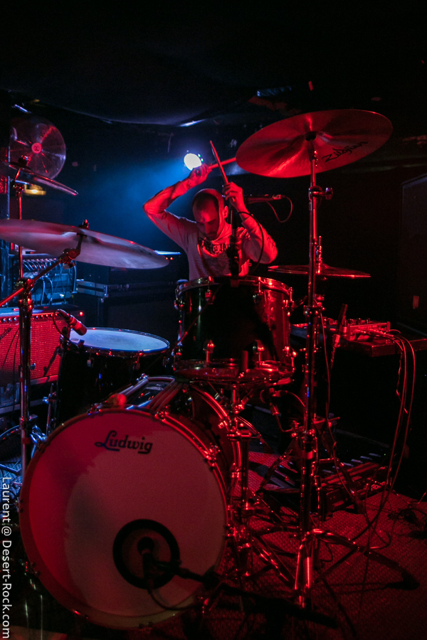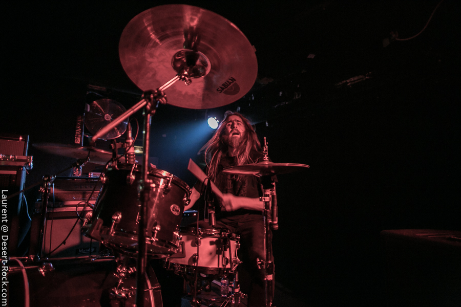Les deux membres de Bell Witch entament Mirror Reaper devant un auditoire captivé. On ne râlera jamais assez contre le Backstage By The Mill, sûrement l’une des pires salles de Paris, qui nous fait cadeau d’un brouhaha de discussion et de cliquetis de verres durant les passages où les instruments ne recouvrent pas le bruit de fond constant. Ceci étant dit, la classe de Dylan Desmond armé d’une immense basse 6 cordes, le visage impassible et parfaitement serein, suffit à nous faire oublier ces quelques intrusions sonores. Si l’on fait abstraction de l’orgue parfois géré par le batteur Jesse Shreibman, Dylan Desmond s’occupe à lui seul de toutes les harmonies du morceau, avec un style de jeu peu commun : il joue quasiment tout le temps en tapping sur cette basse au long et large manche, et gère ainsi les graves et les aigus à la fois. Si l’on ajoute ses parties vocales sonnant comme des incantations religieuses, on obtient un personnage littéralement fascinant, à la classe impressionnante. Jesse Shreibman n’a pas à rougir face à son binôme. Le batteur, qui se couche sur sa batterie lors des passages où il ne joue pas, comme si il était en veille, semble donner sa vie à chaque coup de baguette assené sur ses fûts. Le spectacle de ces deux bonhommes est poignant, en plus d’être hypnotisant.