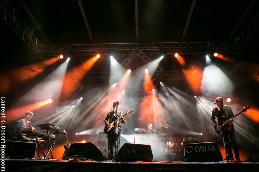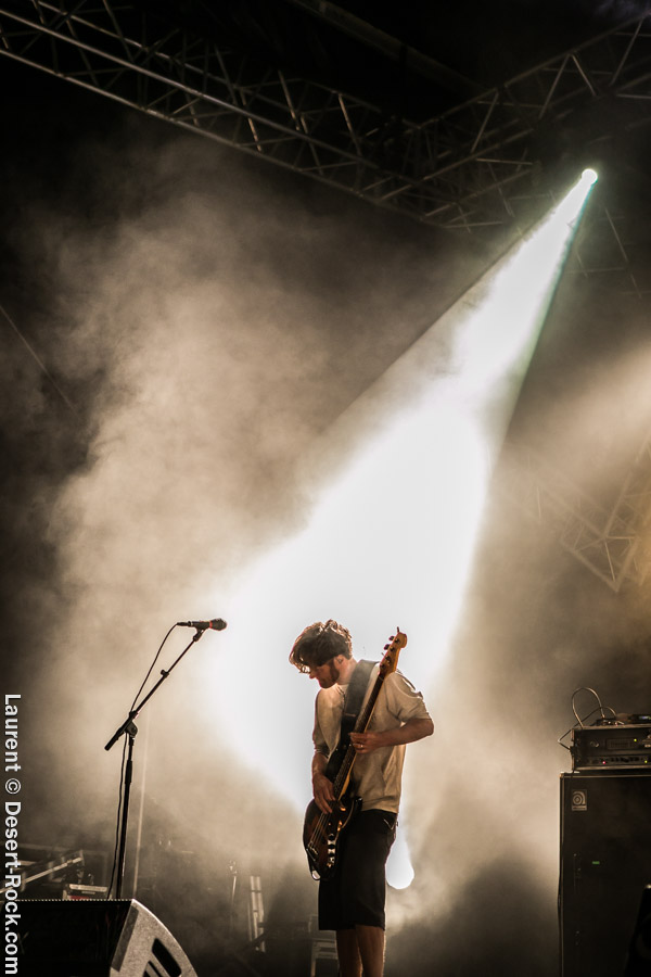 Vient immédiatement ensuite le moment pour le public de se rassembler à la tombée de la nuit devant la grande scène qui pour certains s’apparentera ce soir à un lieu de rituel : Calc monte sur scène pour la première fois depuis une décennie, en gros. Le combo pop rock bordelais se reforme uniquement pour le festival, et son influence sur la scène locale (et nationale) se ressent sur les sourires dans le public. Accessoirement, Calc est aussi le groupe de… Julien Pras, toujours lui, qui occupe le poste de chanteur-guitariste, comme chez Mars Red Sky. Sauf que musicalement, la musique du groupe est quand même loin des space trip heavy proposés par le trio bien connu de nos pages. Calc fait plutôt dans le pop rock, intelligemment pop et subtilement rock, proposant des compos audacieuses, piochant ici ou là dans des plans new wave, misant sur la mélodie avant tout. C’est bon enfant, bien exécuté, bien travaillé (encore une fois très beaux lights et mise en son impeccable), tour à tour léger et grandiloquent (ce morceau de conclusion !). Un bon moment, même si la saturation n’était pas vraiment au rendez-vous.
