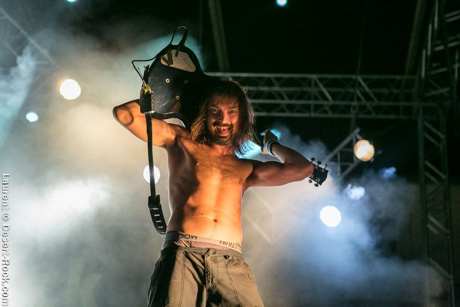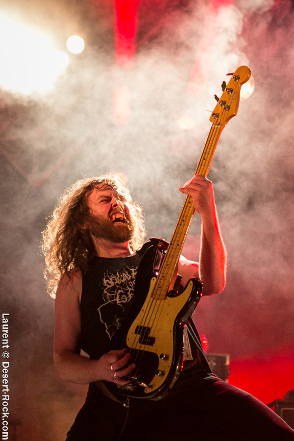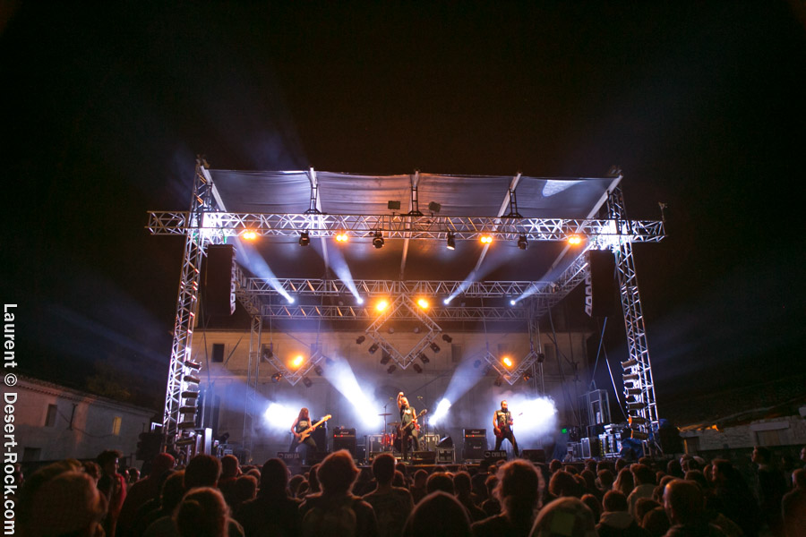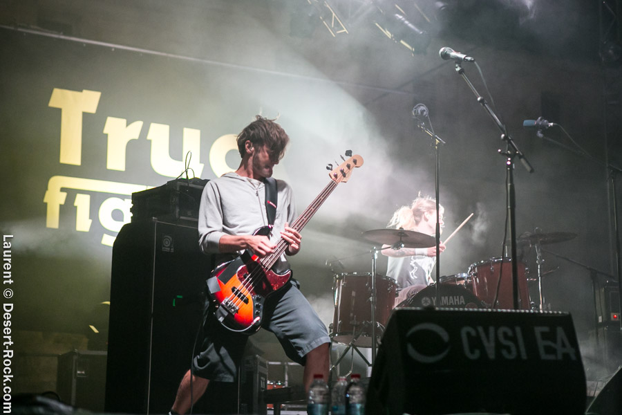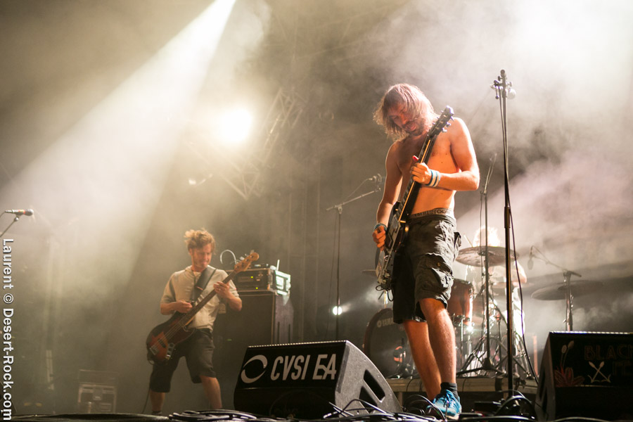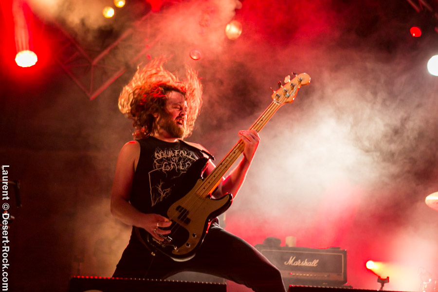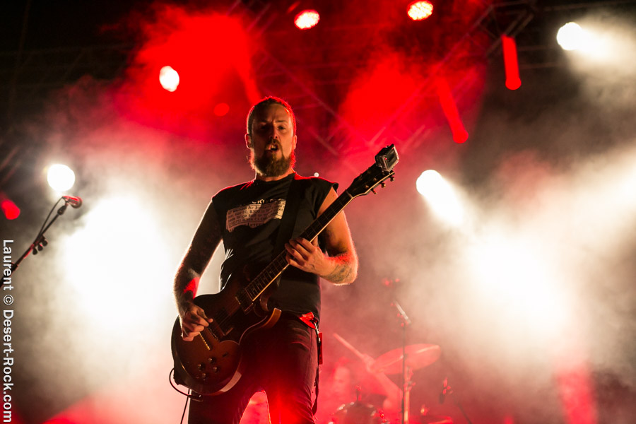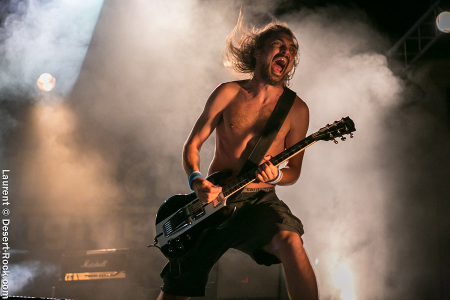 Après un intermède « concours air guitar » assez convenu mais finalement sympathique, vient l’heure du set de Truckfighters. Le trio suédois a passé une bonne demi-heure sur son soundcheck, ce qui s’entend assez vite : à nouveau aujourd’hui, le son est clair, percutant. Le trio propose une entame / jam s’articulant autour de la paire « Atomic » / « Chameleon » ; ça n’est pas explosif mais ça embarque le public dans le genre musical du groupe. Le public est bigarré par nature sur ce genre de festival, mais un noyau dur de fans de truckfighters occupe les premiers rangs et le pit. L’affluence étant au rendez-vous, l’ambiance est au top ! Sur scène aussi d’ailleurs, où l’air de rien, ça joue : la paire Dango / Ozo est robuste (ce dernier impeccable aujourd’hui sur ses lignes de chant, et toujours doté – on le signale trop rarement – d’un son de basse impressionnant, une clé dans le son du groupe). A noter : on sait que le tabouret du batteur de la formation s’apparente plus à un siège éjectable, tant le duo a du mal à fidéliser un marteleur de fûts à ce poste. Aujourd’hui c’est le bon vieux Pezo qui occupe le poste (celui qui apparaît notamment dans le célèbre DVD « Fuzzomentary »), et l’on se prend à regretter qu’il n’ait pas suivi le groupe toutes ses années, tant il assure à son poste, frappant juste et fort, avec une énergie qui fait penser à un hybride entre Animal (le batteur des Muppets) et Tiger, le batteur de Kadavar à la crinière virevoltante. Clairement la première demi-heure du set suit son cours en mode un peu automatique, et c’est avec le fuzzé « Monte Gargano » que les choses sérieuses commencent, y compris dans le pit. Les scandinaves introduisent un autre nouveau morceau avec réussite, « The 1 » faisant bien le job dans cette séquence renforcée en testostérones. Le set prend fin évidemment sur l’indémodable « Desert Cruiser » en rappel. Un concert impeccable, à l’occasion duquel le groupe a encore proposé une set list audacieuse, et maîtrisée, ce qui lui permet à de multiples occasions de se lancer dans des impros du meilleur goût (permettant aussi de mettre en avant leur talent de musicien, trop souvent « sous-évalué » derrière les cabrioles un peu outrancières de son guitariste… Back to basics !). Le public repart ravi, récupérant au passage le pantalon trempé et les chaussures de Pezo, qui repart en caleçon, le sourire aux lèvres…