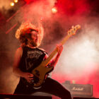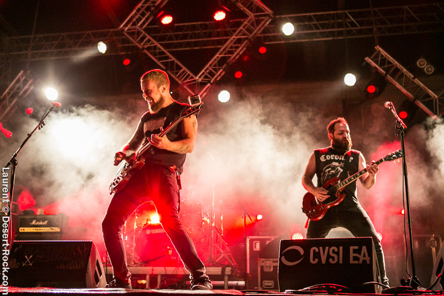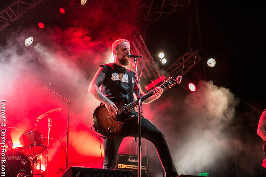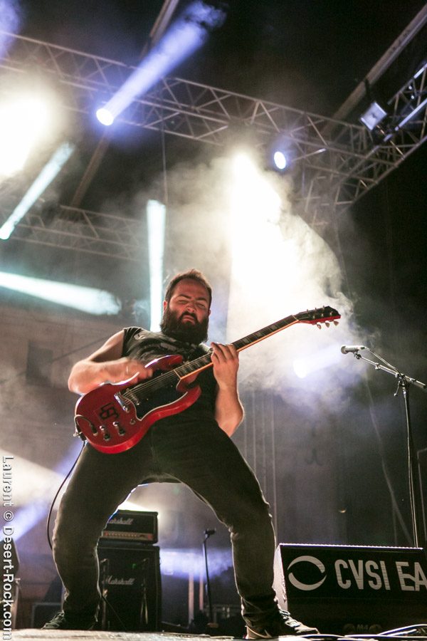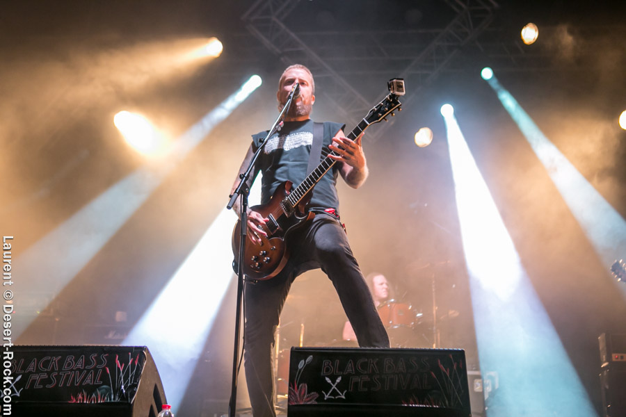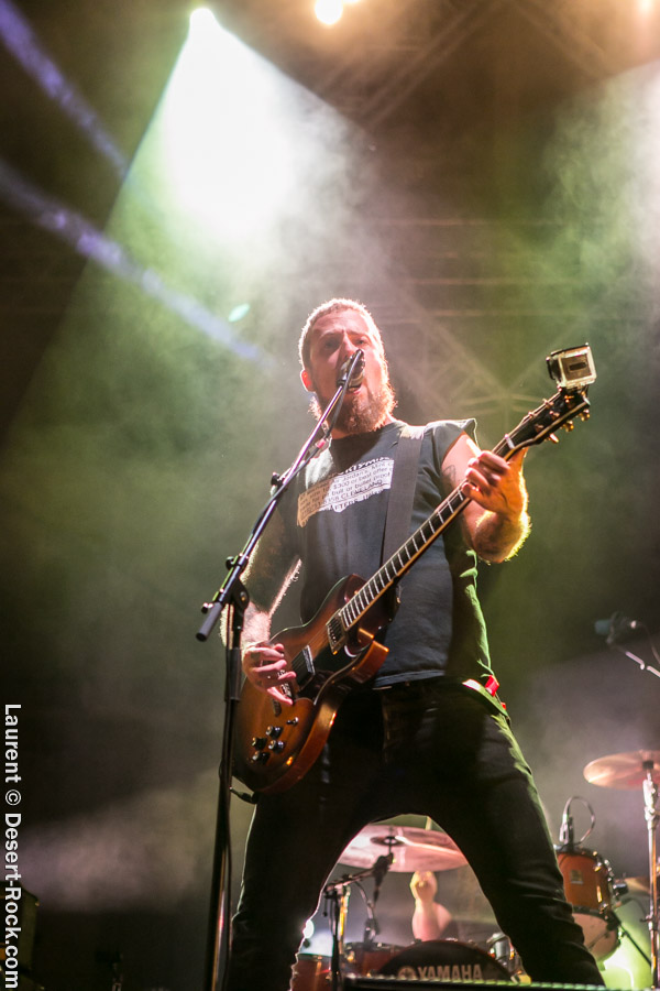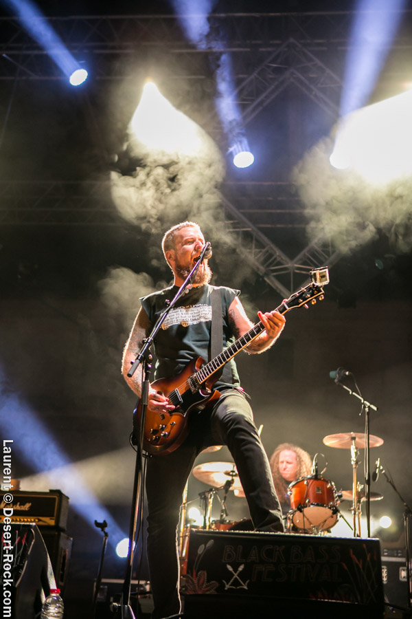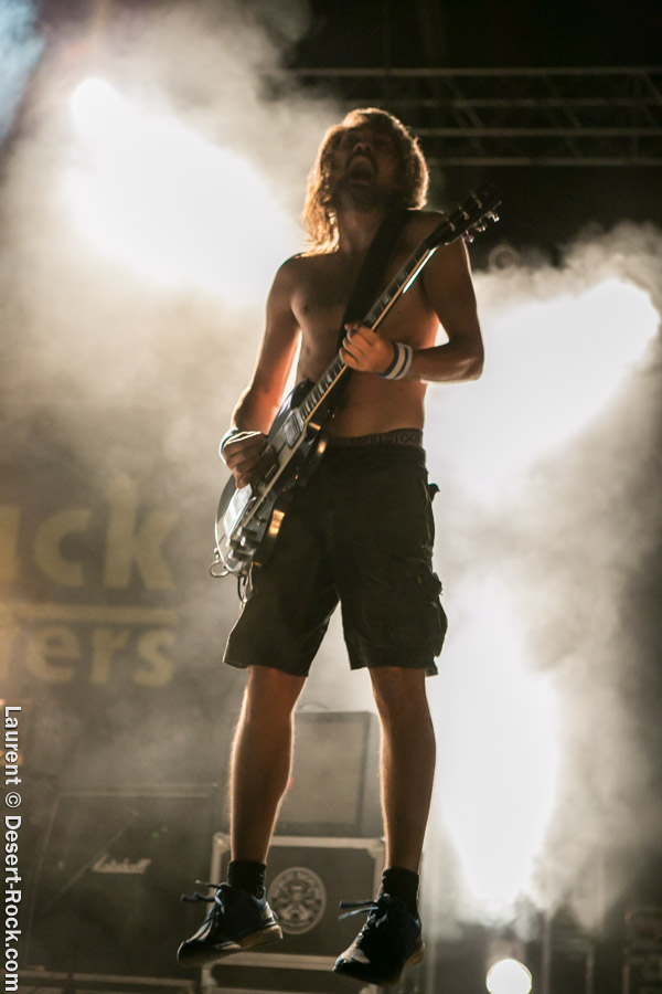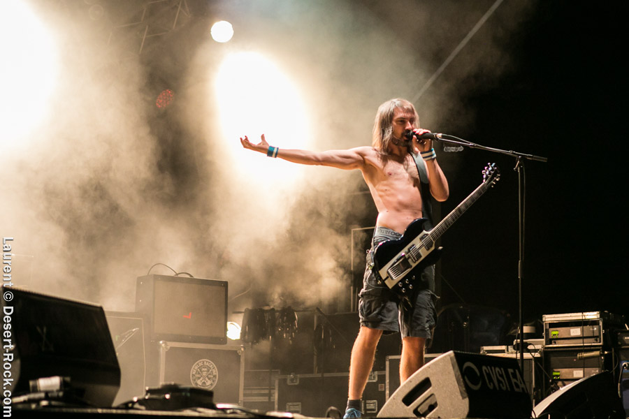 Après un intermède « concours air guitar » assez convenu mais finalement sympathique, vient l’heure du set de Truckfighters. Le trio suédois a passé une bonne demi-heure sur son soundcheck, ce qui s’entend assez vite : à nouveau aujourd’hui, le son est clair, percutant. Le trio propose une entame / jam s’articulant autour de la paire « Atomic » / « Chameleon » ; ça n’est pas explosif mais ça embarque le public dans le genre musical du groupe. Le public est bigarré par nature sur ce genre de festival, mais un noyau dur de fans de truckfighters occupe les premiers rangs et le pit. L’affluence étant au rendez-vous, l’ambiance est au top ! Sur scène aussi d’ailleurs, où l’air de rien, ça joue : la paire Dango / Ozo est robuste (ce dernier impeccable aujourd’hui sur ses lignes de chant, et toujours doté – on le signale trop rarement – d’un son de basse impressionnant, une clé dans le son du groupe). A noter : on sait que le tabouret du batteur de la formation s’apparente plus à un siège éjectable, tant le duo a du mal à fidéliser un marteleur de fûts à ce poste. Aujourd’hui c’est le bon vieux Pezo qui occupe le poste (celui qui apparaît notamment dans le célèbre DVD « Fuzzomentary »), et l’on se prend à regretter qu’il n’ait pas suivi le groupe toutes ses années, tant il assure à son poste, frappant juste et fort, avec une énergie qui fait penser à un hybride entre Animal (le batteur des Muppets) et Tiger, le batteur de Kadavar à la crinière virevoltante. Clairement la première demi-heure du set suit son cours en mode un peu automatique, et c’est avec le fuzzé « Monte Gargano » que les choses sérieuses commencent, y compris dans le pit. Les scandinaves introduisent un autre nouveau morceau avec réussite, « The 1 » faisant bien le job dans cette séquence renforcée en testostérones. Le set prend fin évidemment sur l’indémodable « Desert Cruiser » en rappel. Un concert impeccable, à l’occasion duquel le groupe a encore proposé une set list audacieuse, et maîtrisée, ce qui lui permet à de multiples occasions de se lancer dans des impros du meilleur goût (permettant aussi de mettre en avant leur talent de musicien, trop souvent « sous-évalué » derrière les cabrioles un peu outrancières de son guitariste… Back to basics !). Le public repart ravi, récupérant au passage le pantalon trempé et les chaussures de Pezo, qui repart en caleçon, le sourire aux lèvres…