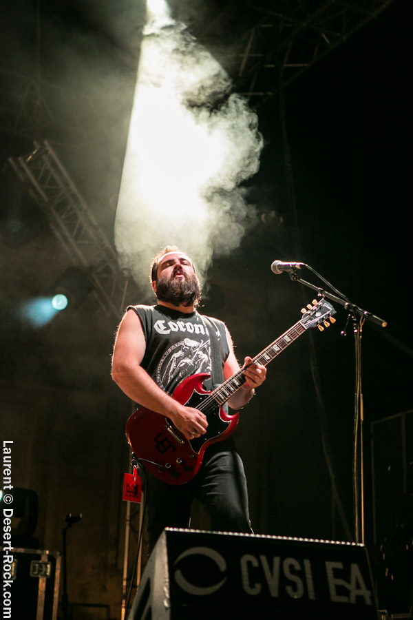 Les français de Lysistrata enchaînent sur la petite scène. Le vent en poupe, les trois jeunes musiciens développent une énergie scénique absolument emballante. Le public ne s’y trompe pas, qui lui réserve un accueil plus que chaleureux. Musicalement, on pense à un mélange de At The Drive In, The Dillinger Escape Plan, à la sauce rock indé frenchie, pied au plancher. Ça joue bien, très bien, c’est très saccadé, et les morceaux sont bien foutus. Derrière ces éléments tout à fait objectifs et factuels… ça manque un peu de gras et de poil à mon goût : le package « jean’s slims/ourlets – rasés de près– guitare et basse calées bien trop haut sous les aisselles – cheveux bien dégagés derrière les oreilles – son clair» a un peu détaché le vieux con blasé qui sommeille en moi. C’est complètement subjectif et un peu honteux, c’est vrai. Sans remettre en cause le talent du groupe (et son potentiel pour les années à venir) j’ai lâché l’affaire très vite pour me caler au 1er rang de la grande scène et attendre le groupe suivant…