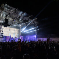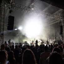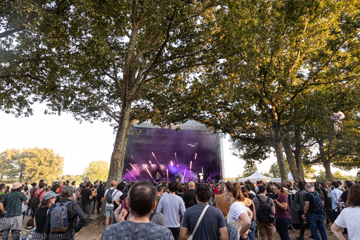 Étrange de retrouver un groupe de cette trempe sur la petite scène (même si en réalité cette scène 2 est de belle taille). Le groupe culte de post rock girondin vient en voisin honorer le festival (à moins que ce ne soit le festival qui honore le groupe…), et garnit fort bien la scène avec sa configuration lourde (6 musiciens sur scène). Le contraste musical est un peu rude tandis que le sextette entame les premiers accords pachydermiques de son set, sachant que 10 minutes plus tôt le gros du public dansait joyeusement un verre à la main sous les derniers rayons de soleil. La lourdeur de la musique de YONL et sa lenteur viennent cueillir froidement le public pour l’emmener dans la noirceur de ce début de nuit, sous les bois. Hypnotique, rageur, enivrant, écrasant, le concert a beau être costaud, on est happé tout du long, bien aidés par un light show efficace et une mise en son massive. Gros set, un peu difficile à digérer pour une partie du public, mais parfaitement emblématique de la richesse et de l’éclectisme de la prog du festival.