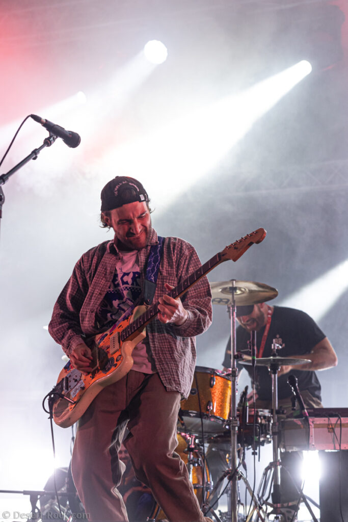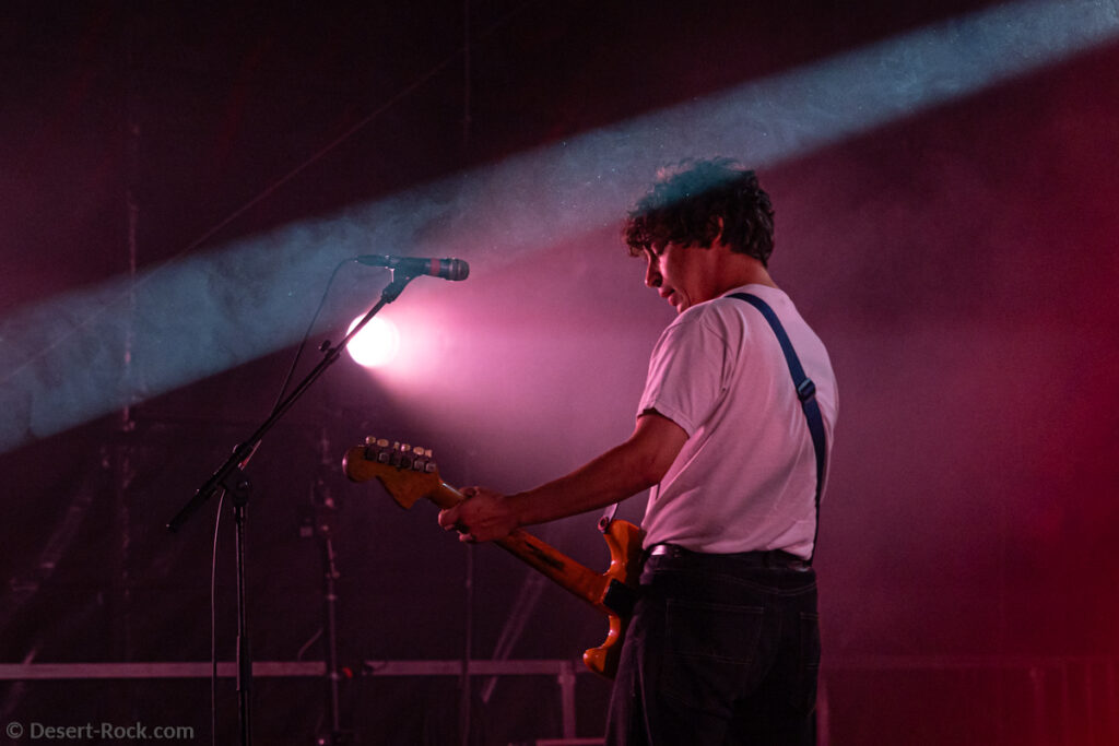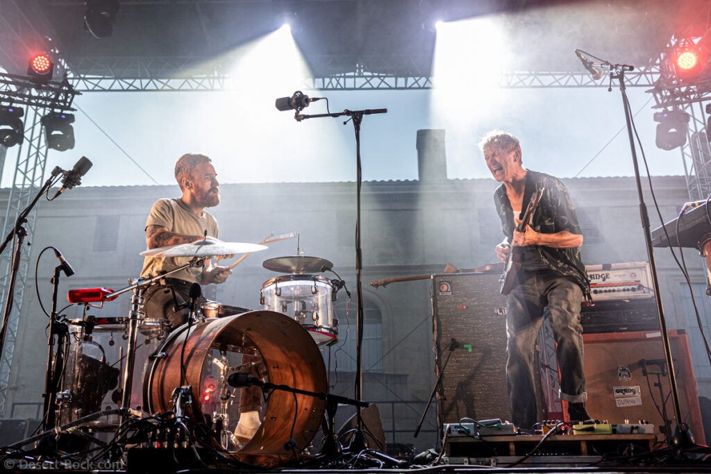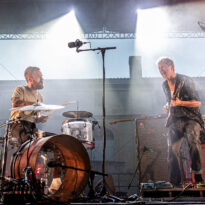 Encore un duo guitare/batterie sur la scène 1, mais on s’éloigne cette fois un peu du rock traditionnel. Les belges de La Jungle empruntent pas mal à l’électro entre autres pour leur musique (à peu près) instrumentale, qui repose beaucoup sur des beats de batterie nerveux et des rythmiques frénétiques, joués ad lib pendant de longues séquences. Un jeu de guitare vif et quelques loops viennent développer ce côté transe psyché qui emballe un public bien fourni qui dodeline gaiement. Le duo de musiciens ne s’économise pas, avec un guitariste en mode pois sauteur et un batteur qui se défonce derrière son kit minimaliste. Un moment léger et enjoué (et le créneau idéal pour les rockers intégristes pour aller se sustenter avec les derniers rayons de soleil).