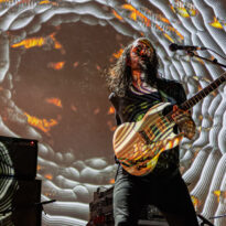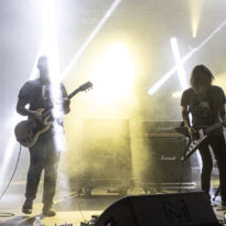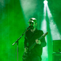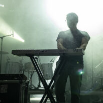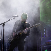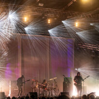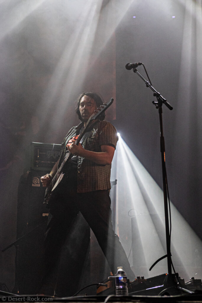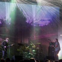 L’intro va crescendo, à commencer par la confirmation en live de la qualité de « Slow Attack » et « Break Even » issus du dernier album. Le reste du set ressemble à une sorte de compilation qui vient re-visiter chaque album de leur discographie pour en extraire les plus grands classiques : « Apex III », « Collector », « The Light Beyond », « Arcadia »… les années défilent, mais la cohérence musicale est toujours bien là, et les mélodies envoûtantes et lourdes s’enchaînent. Évidemment, pour un groupe aussi rodé, l’interprétation est solide et les musiciens impliqués (on notera un Julien un peu en retrait aujourd’hui). En milieu de set, le groupe invite Queen of the Meadow, la chanteuse qui officie sur « Maps of Inferno » du dernier album, pour une saisissante version live, bien accompagnée par un sublime light show en mode « flammes de l’enfer » (points bonus pour les lights sur tout le concert : projections, lumières, effets…).