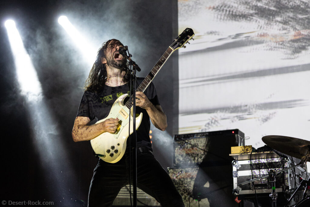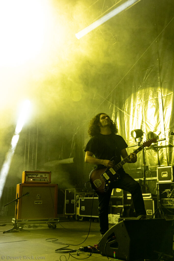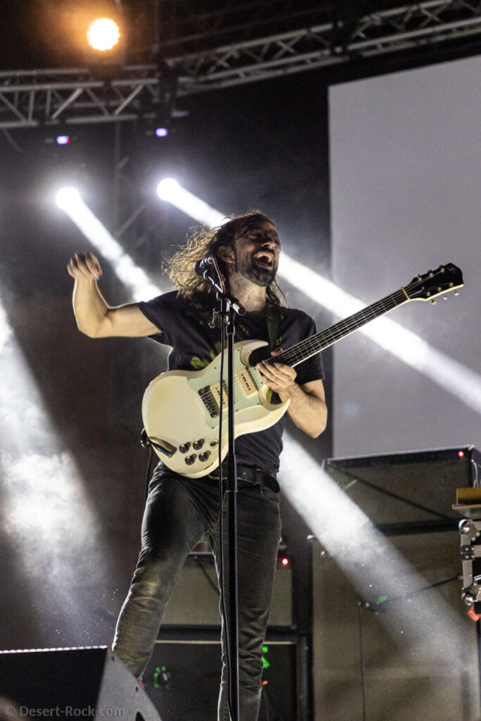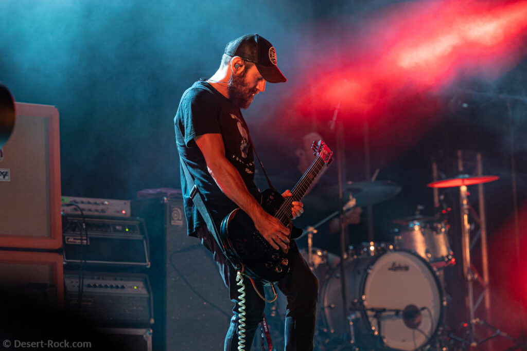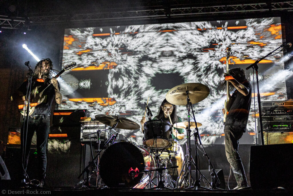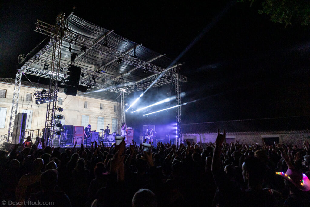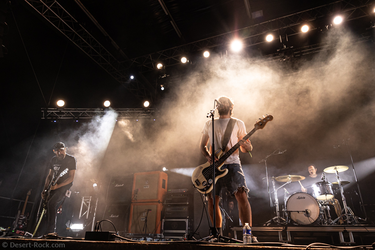Plusieurs dizaines de spectateurs se placent déjà aux meilleures places devant la scène 1, plus d’une demi heure avant le set de 1000Mods. Une part du public se souvient peut-être du concert diabolique donné par nos hellènes lors de l’édition 2018 (rappel)… ou bien c’est simplement la réputation croissante du groupe qui se développe au-delà de la sphère stoner. Mais tout ne se sera pas forcément déroulé comme prévu dans la préparation, tous les instruments du quatuor étant restés quelque part en transit entre deux avions. Dépanné par des groupes locaux, rien ne semble déstabiliser le quatuor (qui se retrouve donc aujourd’hui équipé d’instruments disparates), qui propose avec un rugissant « Electric Carve » une entame plus que solide donnant le ton de la soirée : ce soir, 1000Mods prend l’option set list « zéro risque » avec rien moins qu’un best of de leur carrière, ratissant dans tous leurs disques pour y piocher ce qui se fait de plus efficace. Ils iront même déterrer rien moins que quatre morceaux de leur premier album de 2011 ! Les riffs groovy défilent non-stop pendant une heure, auxquels répondent des salves de slammers quasi in-interrompues.