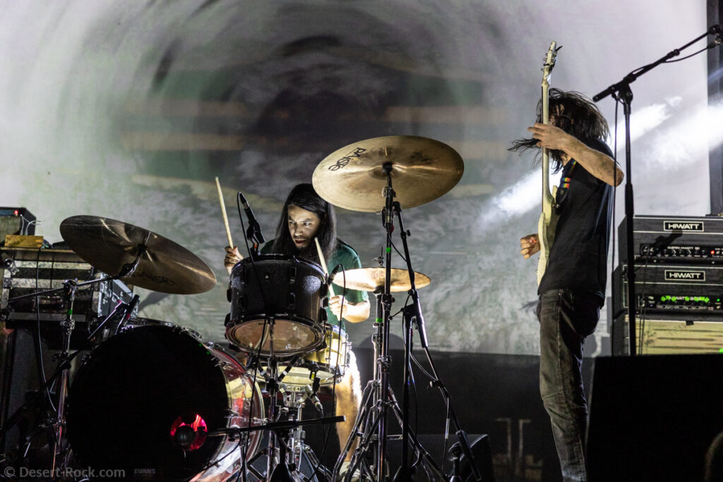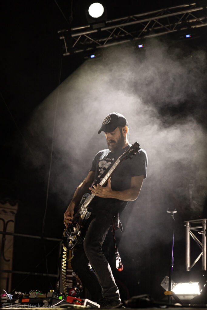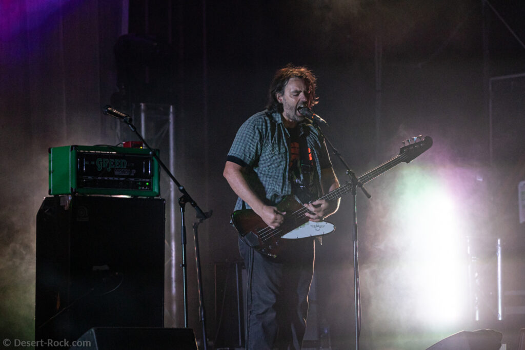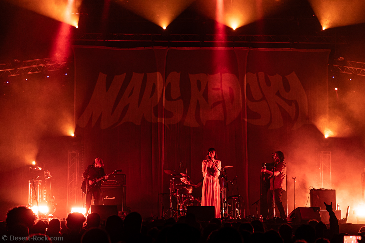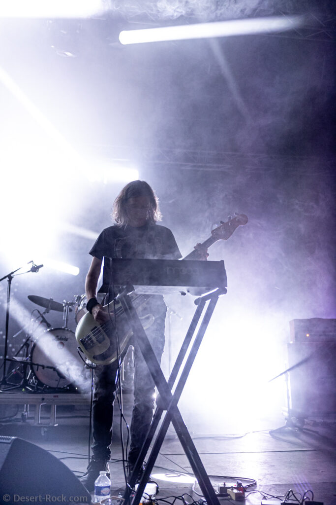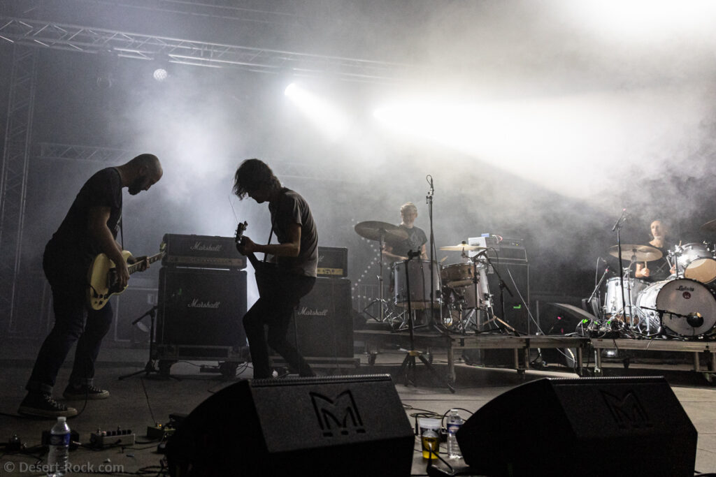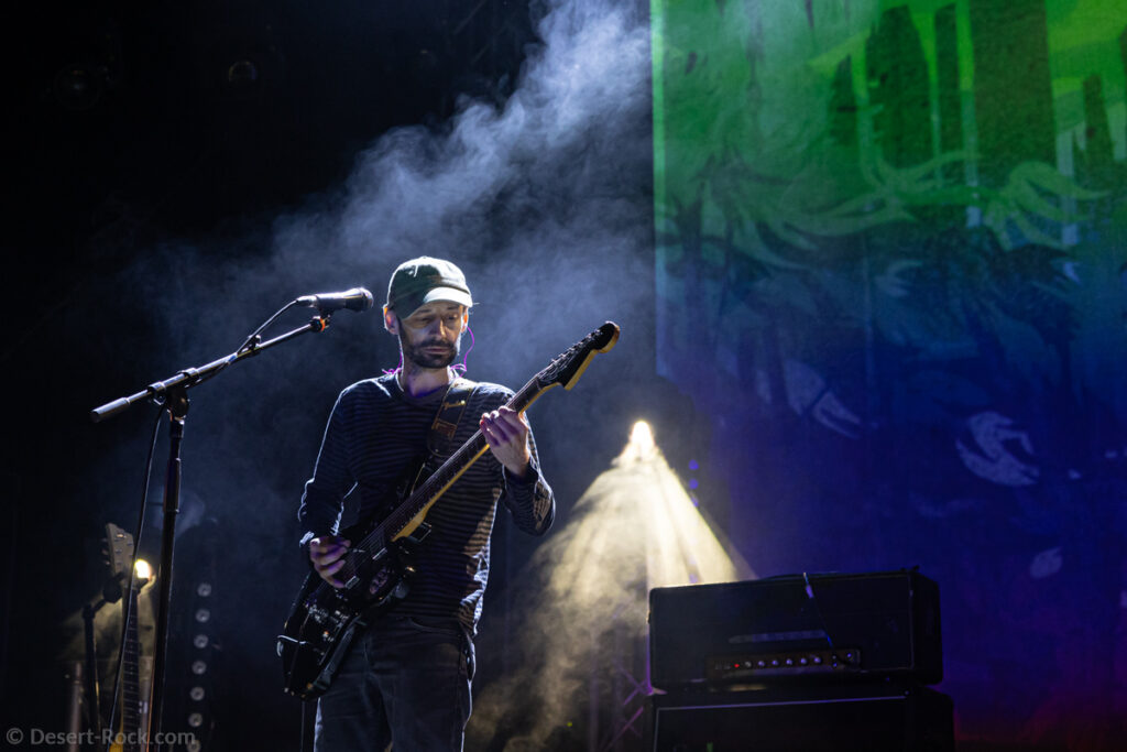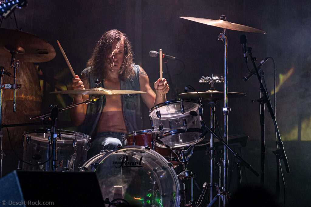 Plusieurs dizaines de spectateurs se placent déjà aux meilleures places devant la scène 1, plus d’une demi heure avant le set de 1000Mods. Une part du public se souvient peut-être du concert diabolique donné par nos hellènes lors de l’édition 2018 (rappel)… ou bien c’est simplement la réputation croissante du groupe qui se développe au-delà de la sphère stoner. Mais tout ne se sera pas forcément déroulé comme prévu dans la préparation, tous les instruments du quatuor étant restés quelque part en transit entre deux avions. Dépanné par des groupes locaux, rien ne semble déstabiliser le quatuor (qui se retrouve donc aujourd’hui équipé d’instruments disparates), qui propose avec un rugissant « Electric Carve » une entame plus que solide donnant le ton de la soirée : ce soir, 1000Mods prend l’option set list « zéro risque » avec rien moins qu’un best of de leur carrière, ratissant dans tous leurs disques pour y piocher ce qui se fait de plus efficace. Ils iront même déterrer rien moins que quatre morceaux de leur premier album de 2011 ! Les riffs groovy défilent non-stop pendant une heure, auxquels répondent des salves de slammers quasi in-interrompues.