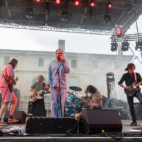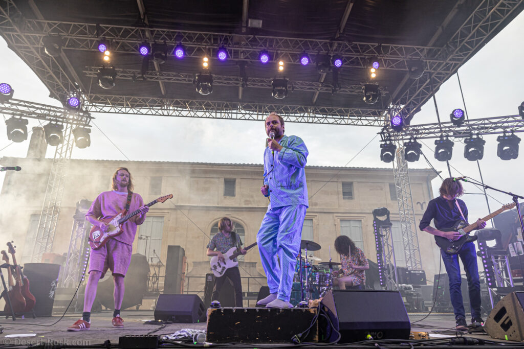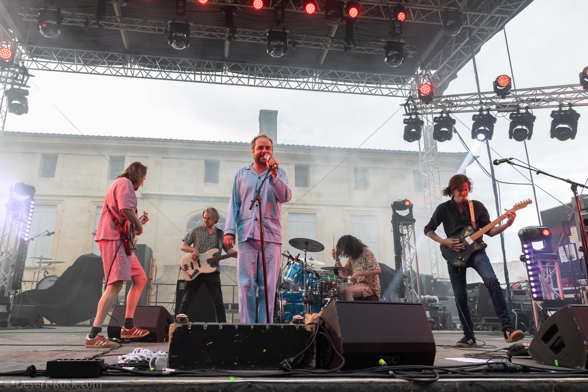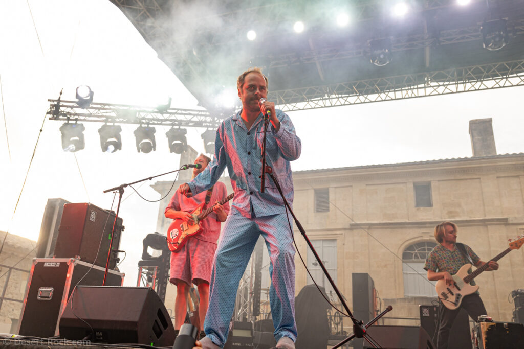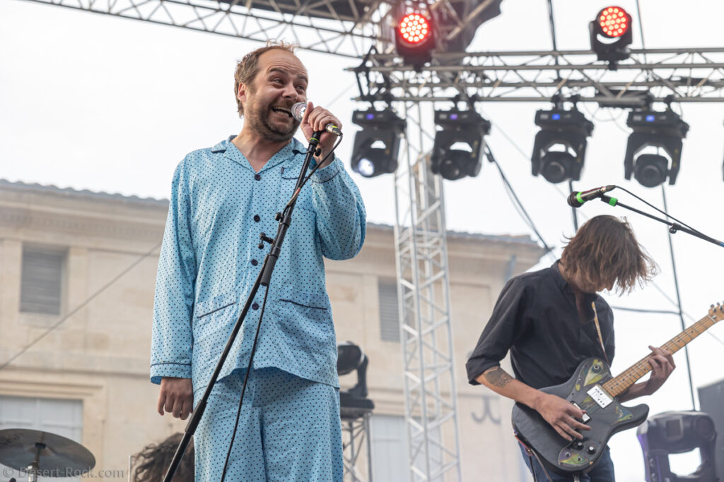 Le premier groupe du jour est ce quintet belge un peu étrange, qui amène avec lui un retour du soleil (à l’heure du coucher de soleil c’est un peu tard, mais c’est appréciable). La moitié des zicos déboulent sur scène en pyjama, ce qui laisse présager un set qui sera résolument placé sur le ton de la bonne humeur (les mimiques du chanteur et son jeu de scène saugrenu vont dans ce sens, comme quand il se prépare son cocktail en milieu de chanson ou change de “pyjama de scène” en milieu de set…). Musicalement, on est sur un rock sautillant protéiforme, qui emprunte autant au punk rock qu’à la pop, au surf rock, au métal, etc… Une entrée en matière sympa à l’heure de l’apéro.