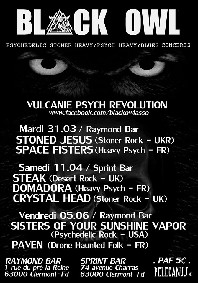 Nouveau venu dans la petite galaxie des organisateurs de concerts, Black Owl entend dynamiter la diagonale du vide par une programmation au combien alléchante à base de Stoner, de Blues et autres réjouissances psychédéliques. Nichée en Auvergne, la noire chouette se fend de quelques concerts printaniers et savoureux, jugez plutôt, Stoned Jesus, Steak, Domadora, Space Fister, Sisters of your Sunshine Vapor,…