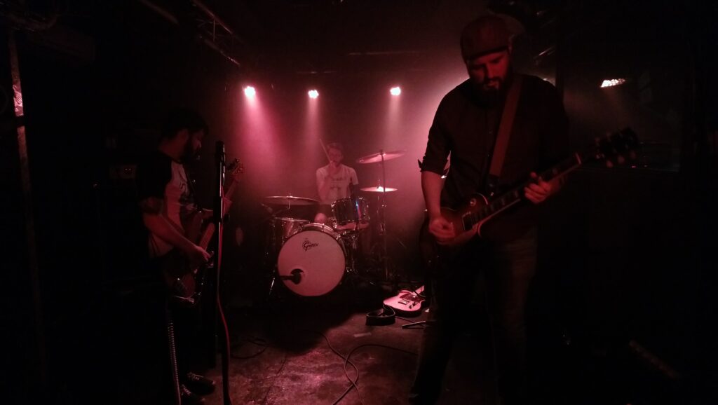 C’est après quelques rafraîchissements que tout le monde se meut de nouveau vers les sous sols pour découvrir Red Sun Atacama, power trio fuzzy. Le public s’est fait plus pressant devant la scène pour recevoir la performance du groupe et c’est avec peine que l’on peut désormais voir ce qui se passe devant, tant les piliers soutenant la voûte sont encombrants. Côtés lumière c’est sans surprise que l’International nous livre sa mirifique palette de Bleu et de Rouge qui empêcheront tout photographe sans qualification de faire quelques images potables. Coté balance les gars ne sont pas bien servis non plus. La basse écrase pas mal le reste et la voix ne ressort qu’à peine du magma sonore. Quel dommage! car c’est un super set qui s’offre à nous. Une violence contrôlée propulse les riffs, les compos sont filées et cohérentes et la tessiture de voix de Clément le bassiste est alléchante. Vincent transpire allègrement sur sa guitare et sous sa casquette ne jouant pas les guitar hero, juste faisant le job et le faisant bien, le tout servi par Un Rob à la batterie qui brode un tapis de percussion constant et lourd. L’entrelacs de morceaux Psych et Fuzz marche à merveille et le public est conquis. La salle est moite, de bonheur lorsque le chanteur s’excuse d’avoir encore un morceau à jouer. “Ne vous excusez pas, jouez en plus!” mais il n’en est rien, le set prend fin et on prépare l’autel pour la suite.