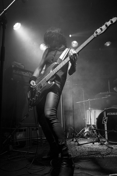 A peine le temps de me lamenter d’un concert trop court auprès de mes compagnons plus ponctuels, que l’on enchaîne direct sur Libido Fuzz, qui nous vient de la lointaine cité bordelaise. Ce soir, ça commence bien, le groupe accueille Rory comme nouveau bassiste, celui-ci ayant intégré le groupe il y a à peine quatre jours. Pas une fausse note durant tout le concert, gardez-le les gars ! Si il y avait eu un couac, sûr qu’on l’aurait entendu, tant le son de Libido Fuzz est clair, lisible. Les instruments ne s’emmêlent pas les uns les autres, fait rare dans ce genre de concert. La section rythmique fait tourner ses plans groove, laissant toute latitude à la guitare pour s’exprimer, et mettre en avant des riffs hendrixiens certes classiques mais exécutés d’une main de maître. On a droit à une vrai démo de tout ce qui à fait le succès de ce type de son, y compris et surtout en termes d’effets ; oscillator, flanger, wah, tremolo, octaver et même modélisation de sitar, tout y passe, le gratteux fait miauler son instrument et maîtrise son pedal board avec une aisance remarquable. Mais en plus, c’est qu’il chante en même temps le bougre ! Une voie légèrement diablotine, pleine d’injonctions à se bouger le derrière, bien présente donc, avec juste ce qu’il faut de reverb pour faire sonner tout ça. Excès de matos ou faute à pas d’bol, la gratte décroche soudain au troisième morceau et requiert l’intervention du technicien plateau (qui n’est pas un régisseur, bon dieu !… il y tient). Mais les bordelais ne se laissent pas démonter pour autant, la section rythmique fait tourner son groove, le public encourage le tout en clappant, et au final le problème est vite réglé et vite oublié. On retourne vers du fuzz hendrixien, agrémenté de quelques passages stoner/blues bien heavy, qui permettent de montrer tout de même que la batterie en à dans les bras. Un chouette concert sans fausse note au final, même si l’on peut regretter un unique fond vidéo psychédélique qui gagnerait à être retravaillé en terme de définition, ou d’en varier un brin de temps en temps. Le public suit, réagit, ça bounce devant comme derrière et l’on apprécie la performance. Reste une petite impression que la formule pourrai être parfaite en y ajoutant un zeste de folie supplémentaire, pour trancher avec le coté classique proche de ses origines 70′. Autant de fuzz, et encore un poil plus de libido quoi. Mais bon, je pinaille, c’était vraiment cool, hein !