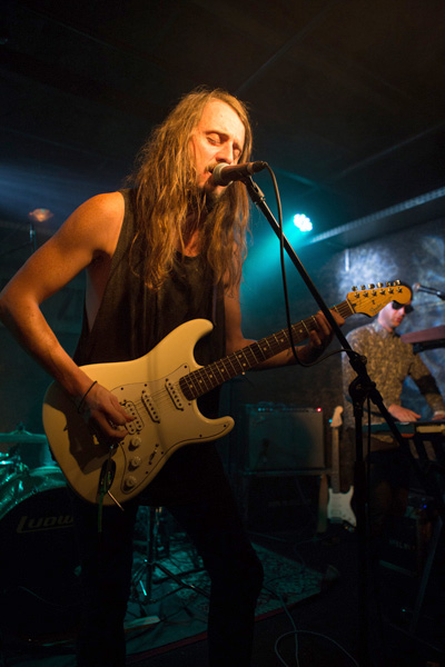 A peine le temps de souffler et de prendre ma dose d’air et de nicotine, que voilà les psychonautes de Naam (Brooklyn/NY/USA) qui enchaînent le spectacle, pour la seule date française de leur tournée européenne. Et quel spectacle ! Qui commence pourtant sur une note négative : soit les cocos savent faire monter la pression, soit la clope m’a fait sortir de l’ambiance, soit le son a mis du temps à se régler (je penche pour un mélange des trois), mais le premier morceau a peiné à me dérouiller les ouïes, le clavier semblant notamment difficile à distinguer des autres instruments. Mauvaise impression vite dissipée, léger malaise pré-décollage, peu importe, le clavier se détache enfin du reste de la masse sonore, le rythme se fait plus fluide, plus soutenu. L’acide monte, la gratte choppe un gros flanger, la basse envoie du lourd grâce à un gros son ronflant, ça y est c’est parti, Naam nous emmène dans l’espace. Miam ! La sauce prend, et Naam se permet même de faire transiter son stoner spacey vintage par des passages speedées à l’ancienne, sorte de Deep Purple sous vitamine C, ce qui ravit votre serviteur. La barbe du bassiste tournoie dans les airs, le batteur ne peut garder son sérieux de façade dans les rythmiques les plus éclatantes et sourit à pleines dents, et même Johnny « fingers », le clavier, ce soir au style brooklyn prononcé (chemise serrée au col, caquette, grosses lunettes noires, pense aux Beastie Boys !) commence à se laisser porter par ses propres nappes sonores. Mais tout cela n’était qu’un avant goût, et le talent du groupe éclate soudain sur « Starchild », le morceau titre de leur second EP. Et c’est là que l’on se rend compte de la claque musicale que l’on va prendre. Le chant incantatoire plein de réverb du chanteur/gratteux aux allures christiques nous transporte, l’esprit commence à se laisser porter et à suivre les claviers aériens, tandis que le corps se laisse violenter par les coups combinés de la section rythmique, la basse lourdement fuzzée faisant office de bélier prêt à défoncer toutes les portes de la perception ; l’expérience était résolument mystique, et cette impression de prendre part à un rituel spacial et violent est restée jusqu’au bout du set, y compris dans des passages plus modernement tranchants, venant nous rappeler que nous sommes bien en 2014, sur terre. Autour de moi, ceux qui tournent au jus d’orange headbanguent en souriant, les bourrés à la bonne bière en sont à prier la lune, et les stoneheads sont perdus dans les limbes, bave aux lèvres. Pas de doute, Naam nous a emportés loin… Après un rappel majestueux et cosmique, Le clavier s’occupe de la réception post atterrissage, en nous laissant avec une ritournelle d’orgue vintage ambiance pub des 50′, histoire de nous dire allez rigole un coup mec, reviens sur terre, prend une bière.
