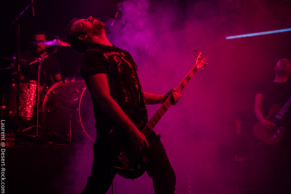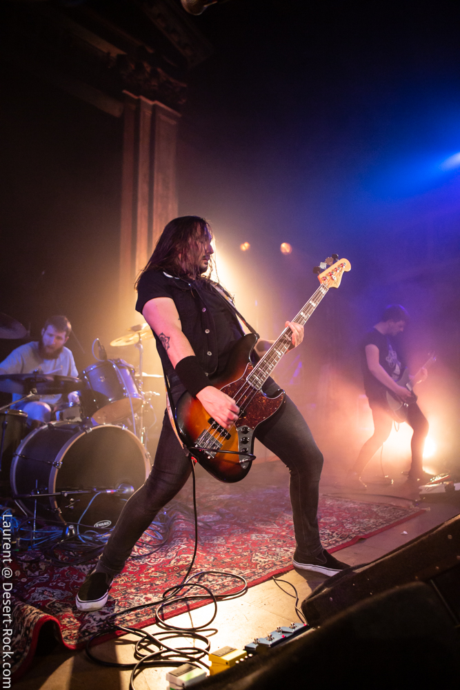 Vient le tour de Burning Gloom, un nouveau groupe… quoi que ! En fait, il s’agit de la nouvelle incarnation de My Home On Trees, groupe que l’on avait déjà vu en live et entendu sur album ! Même pas de changement amer de musicien ou de deal foireux avec un label, tous les zicos sont toujours là et le groupe est en forme ! Ce qui a changé ? L’intro sur le très Kyussien « Nightmares » (écoutez cette ligne de guitare…) est trompeuse : le stoner classique a cédé la place à un propos plus rude et plus metal, clairement plus sombre. Laura, la chanteuse, représente toujours l’un des atouts qui démarque le groupe, avec des lignes vocales profondes et variées, plus hargneuses désormais. Notons qu’elle sera accompagnée de Celestial Ivy, une chanteuse invitée sur le titre « Modern Prometheus », sur lequel les deux vocalistes se renvoient les lignes de chant, un passage sympa… parmi d’autres ! Car le set, durant lequel ils jouent 90% du nouvel album, tient bien la route et nous rapproche (un peu) des maîtres de la soirée…
