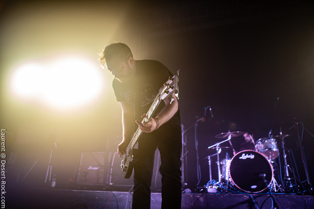 Aujourd’hui c’est le heavy (oui, désolé) « Worship » qui introduit les hostilités du jour pour un petit quart d’heure de riffs assénés en pleine face à la vitesse d’un pachyderme apathique. Comme toujours, Dennis à gauche, tourné vers ses collègues, est le moins dynamique, concentré sur son manche et son son (et la puissance de ce qui sort de ce discret guitariste est au delà de l’imaginable). Nick et Ron sont plus énergiques, et leur jeu hypnotise. Il faut voir en particulier Ron faire claquer les cordes clairement sous-accordées de sa basse pour chaque coup de médiator… Quant à Daniel derrière son kit, discret, il emmène ses potes dans des compos complexes, riches et élaborées, sans jamais se perdre en route (le piège est grand d’accélérer le propos, voire l’inverse). Bref, la prestation physique « a minima » cache en réalité une maîtrise musicale et instrumentale de tous les instants. Côté set list, s’ensuivent les dévastateurs « Slow » et « Endless » évidemment, pour finir de constituer plus d’une heure d’un set éprouvant, étouffant, mais libérateur…
