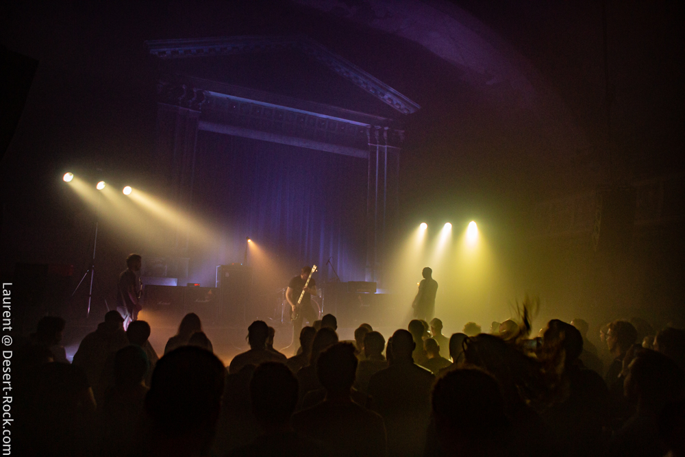 La « théâtralité » du lieu est tangible dès les premières notes de Telepathy : le quatuor anglais (et polonais), qui partage quatre dates de cette tournée de Bongripper, évolue dans une ambiance vaguement ténébreuse, dans une atmosphère très fumeuse (on verra assez rarement le pauvre Richard Powley, perdu dans la brume sur son côté droit de la scène), avec un éclairage dramatique très bien étudié pour mettre en valeur le lieu. Musicalement, le groupe complète plutôt bien une affiche bicéphale avec les maîtres du doom : Telepathy propose un post-metal très lourd et nerveux, porté par des plages ambiantes pesantes et des assauts guitaristiques puissants. Complètement instrumental (le groupe n’utilisera son micro que pour balancer deux ou trois phrases à l’attention du public…) le groupe fait montre d’une grosse assurance scénique et d’une set list riche en titres bien plombés. L’énergie déployée finit d’emporter le pompon, et on se dit qu’on devra garder un œil sur ce combo atypique mais qui en a sous la pédale…