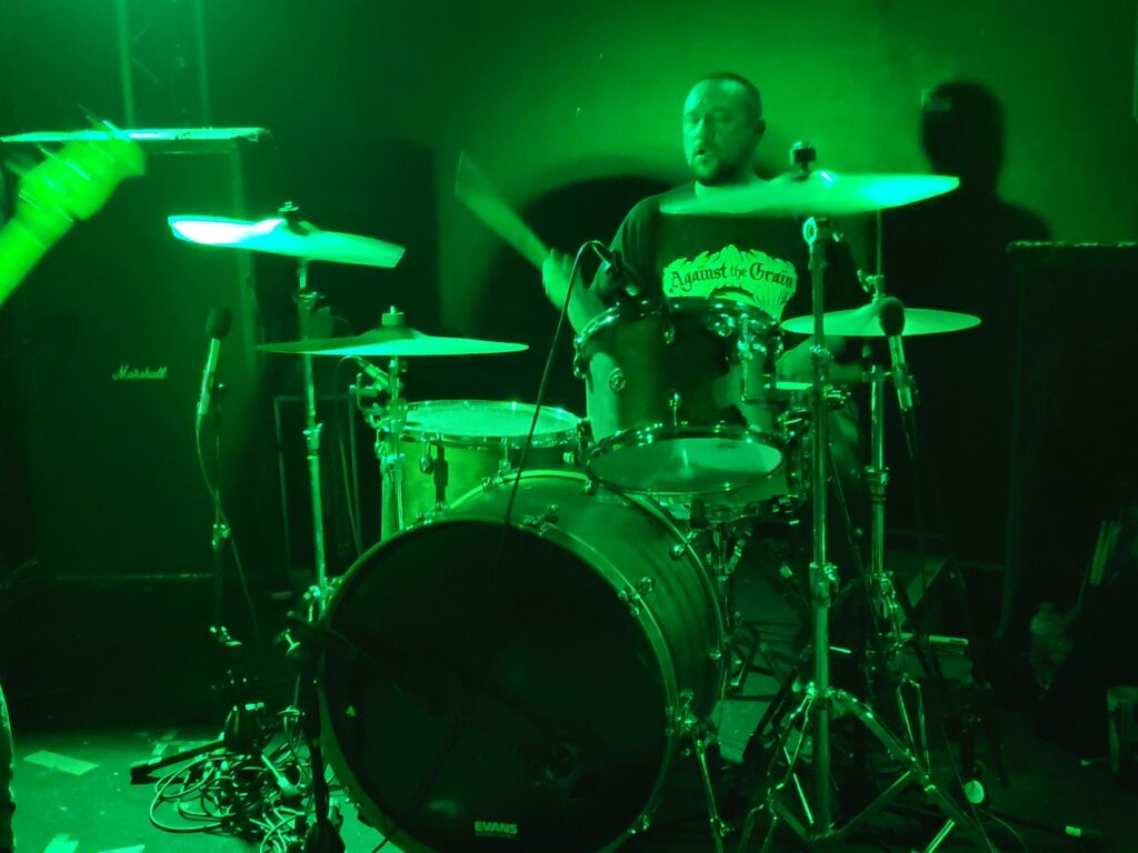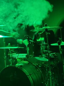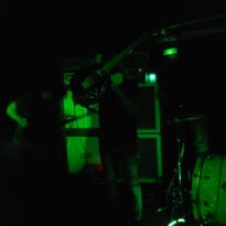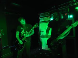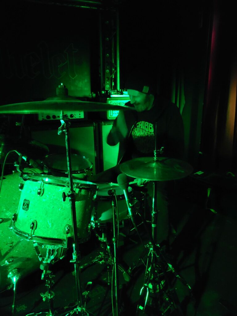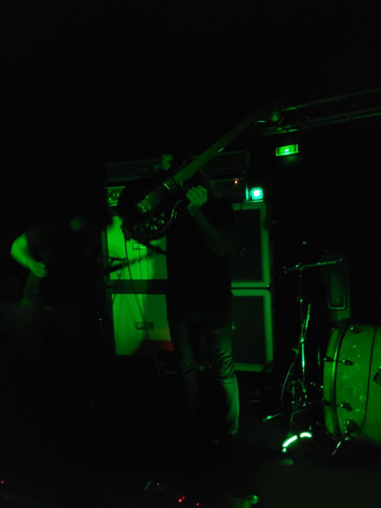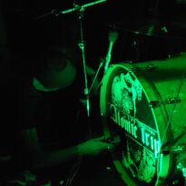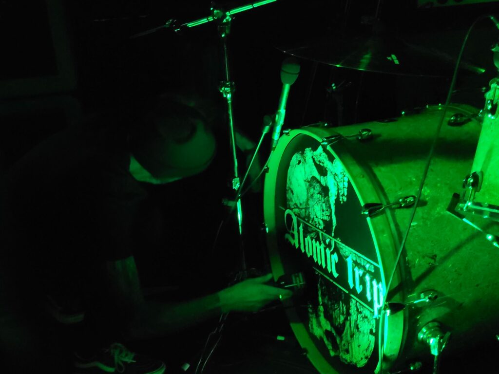 Bien que la déception soit réelle de ne trouver aucun jeu de mot tripier dans le nom de Lyonnais d’Atomic Trip, l’envie est grande de se retrouver au cœur de leur usine à riffs. Dès l’entrée de la salle les tenants de billetterie insistent sur le besoin de porter des bouchons d’oreilles, « ça va jouer fort”. Le trio est posé devant un mur d’ampli qui confirme la promesse dès les premiers riffs. Dans cet assemblage comprenant deux gratteux et un batteur, c’est clairement ce dernier qui porte le groupe. Les variations qu’il impose, l’amplification de ses frappes ont un effet dévastateur. Chaque coup de pédale fait avancer la grosse caisse de dix centimètres, à tel point qu’entre chaque morceaux le batteur doit reculer sa machine à blasts.