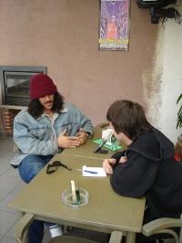 Brant Bjork, Globe-trotter infatigable, était à nouveau de passage en europe en ce mois d’avril 2005. Grand habitué des concerts organisés par Orange Factory, cette tournée était pour lui une nouvelle occasion de faire une halte en Belgique. Malheureusement le Sojo de Louvain ayant du fermer ses portes, le concert aura lieu finalement dans la petite ville de Zichem, dans une petite salle attenante à un bar; bar où nous retrouvons un Brant Bjork fidèle à lui même, détendu et souriant. L’occasion pour nous de lui poser quelques questions, en particulier sur le nouvel album, mais aussi la possibilité de parler de deux choses qui lui tiennent à coeur: la scène et son label Dunarecords.Pendant ce temps, Vic du Monte joue au baby-foot derrière nous à grands renforts de cris et de jurons. Trempé de sueur, il n’a pas l’air de comprendre comment il peut perdre contre ce qui semble être un vieux pilier du bar dans lequel nous nous trouvons.