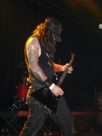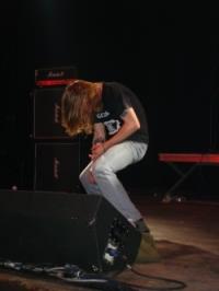 Dès les premières notes, je suis frappé par la puissance du son de guitare d’Erik Larson. Il domine tout, rendant le deuxième guitariste inaudible sans parler de la basse. Seul le batteur s’en sort honorablement, mais il faut dire qu’il frappe comme une brute épaisse. Même si on ne perd pas grand chose à ne pas entendre le chanteur, le fait de le voir dépenser autant d’énergie dans le vide semble un peu ridicule. Je décide donc de reculer du bord de scène pour me poster près de la table de mixage. Et là, je commence à comprendre. Visiblement, le volume des amplis sur scène est plus haut que celui du système de sonorisation de la salle. C’est donc celui qui monte le plus ses potards qui l’emporte. Le crétin (fini les politesses) qui officie en tant qu’ingénieur du son est à portée de baffes mais je me retiens.