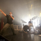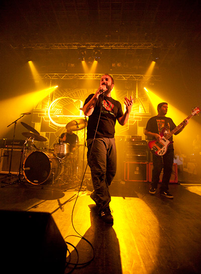 Le public, « à la bordelaise », ne se laisse jamais complètement aller : ça slamme un peu ici ou là, ça sautille, ça sourit, ça headbangue un peu, l’ambiance est bonne, le plaisir est palpable… mais ça n’est jamais l’explosion que susciterait un concert de cette qualité devant un public moins « coincé » (désolé pour les bordelais, le mot est lâché). Illustration concrète : deux jours plus tôt, devant un public incandescent, « Crucial velocity » voyait un Neil cracher ses tripes dans son micro avec une violence rare, tandis qu’aujourd’hui, le même titre le voit faire preuve d’une férocité plus… « mesurée ». Influence indirecte d’une set list moins bourrine ? Groupe fatigué ? Alchimie avec le public plus difficile à trouver ? On pourrait se perdre en conjectures stériles, cantonnons-nous à profiter de ce set de superbe facture. Le groupe d’ailleurs, globalement, ne remet pas en cause ses habitudes scéniques : seuls Neil et Jean-Paul attirent les regards, l’un par sa dynamique de frontman désormais pleinement assumée, l’autre dans sa démonstration perpétuelle derrière les fûts. Tim et Dan, à peine effleurés par les lights, restent généralement dans l’ombre à regarder leurs instruments, concentrés, mais jamais froids ni désabusés : ils sont « dedans », à leur manière.