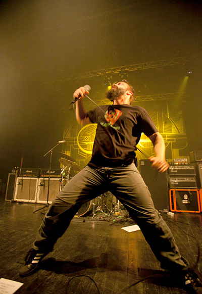 Quand Clutch monte sur scène dans la pénombre, le public ne met pas trop longtemps à quitter le bar pour remplir copieusement la salle. Le quartette dégaine une triplette issue de sa dernière galette pour entamer les hostilités : « Earth Rocker », « Mr Freedom » et « DC Sound attack ». Une approche un peu moins violente que deux jours plus tôt à Bilbao, mais qui met quand même les pendules à l’heure. Et la suite est à l’avenant : avec un sens de la modulation qui laisse pantois, Clutch oriente la tonalité de son concert vers quelque chose de furieusement rock, mais plus nuancé, plus groovy peut-être. « Profits of doom » prépare un peu à cette perspective, ainsi que « The Regulator » un peu plus loin, qui se retrouvent à nuancer un peu un passage composé, quand même, de « The mob goes wild », « Book, saddle & go », ou encore le féroce « Unto the breach » par exemple.