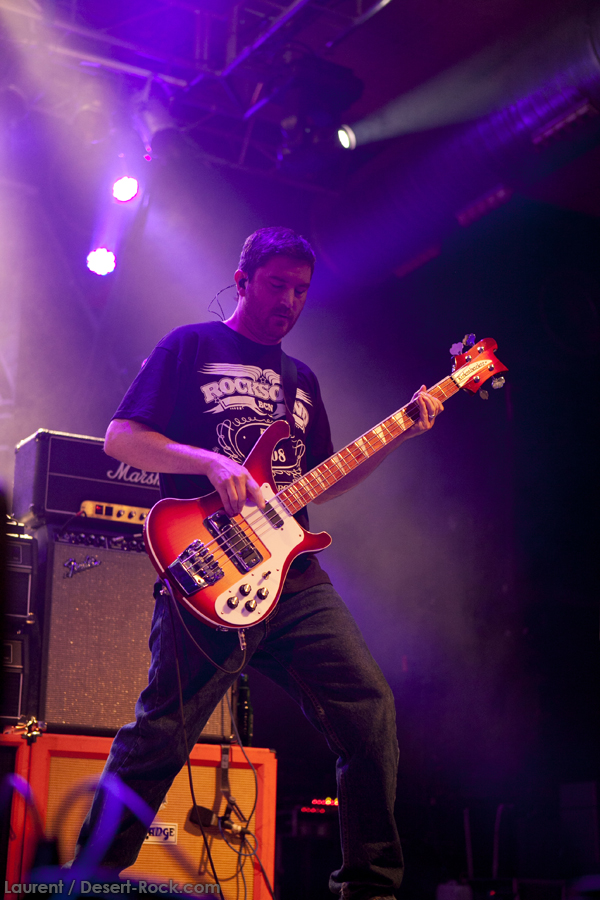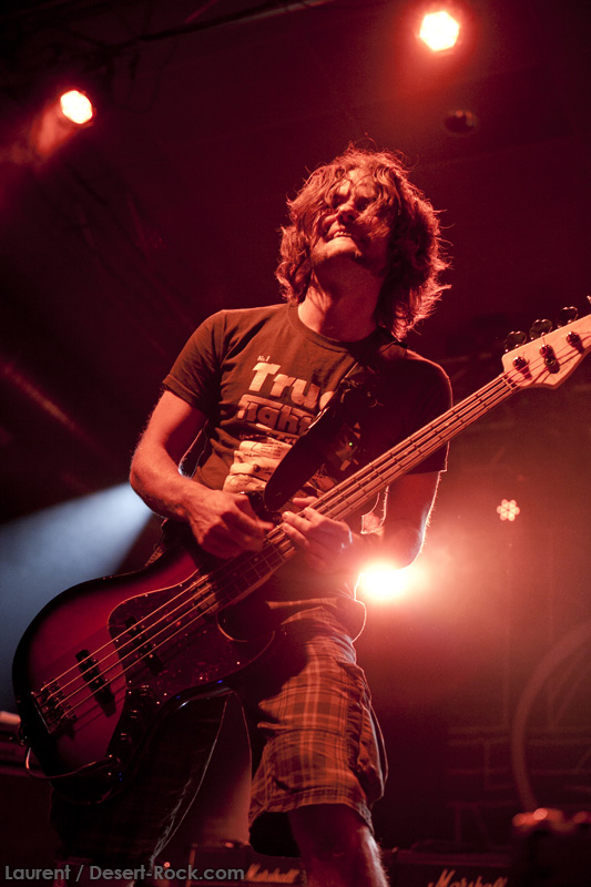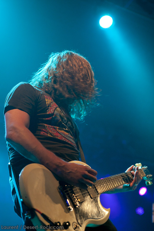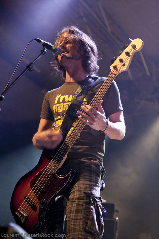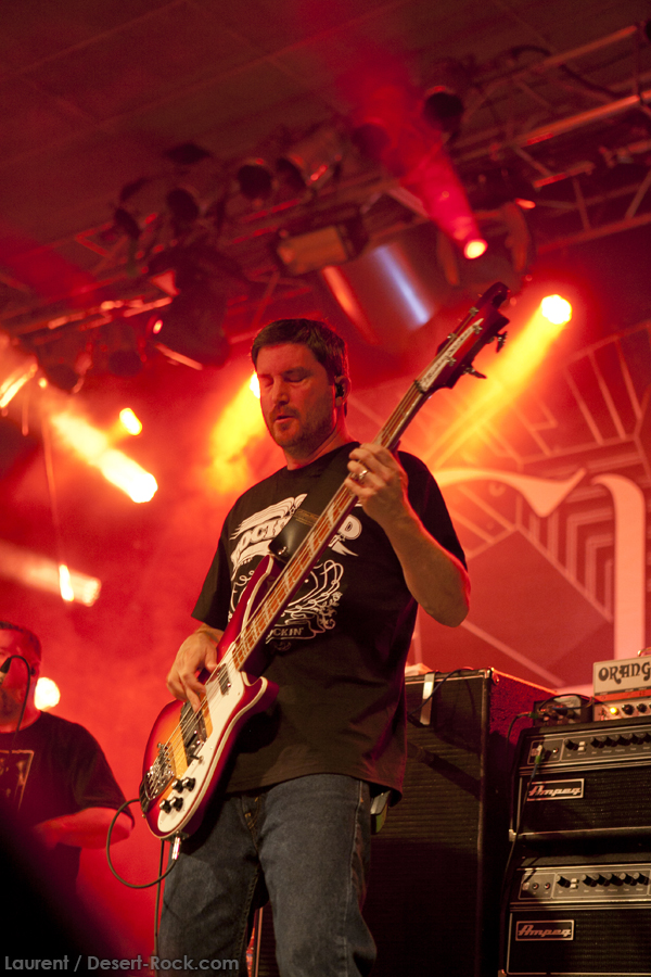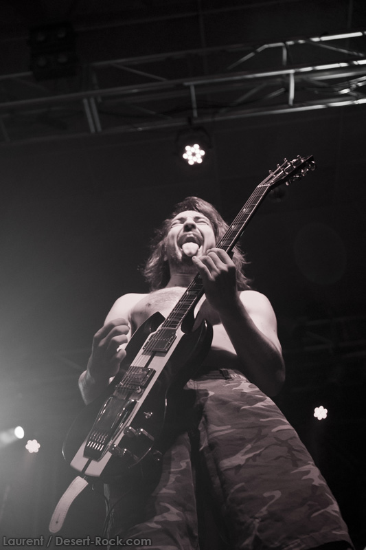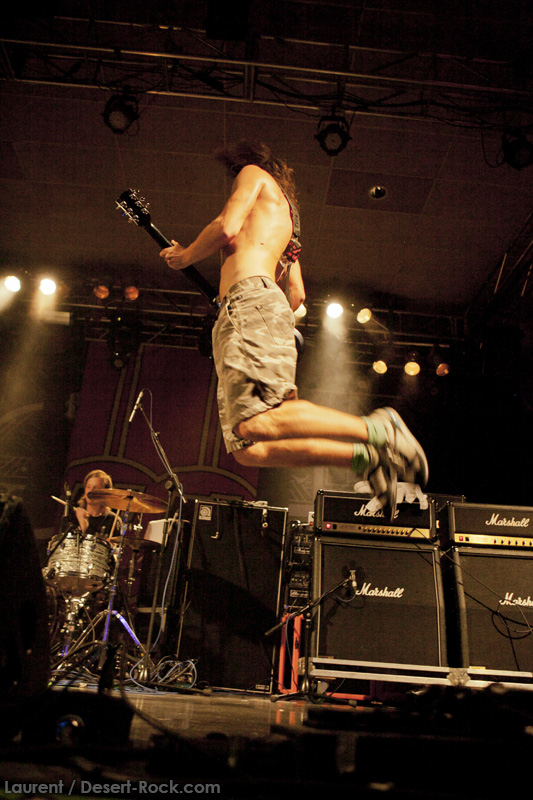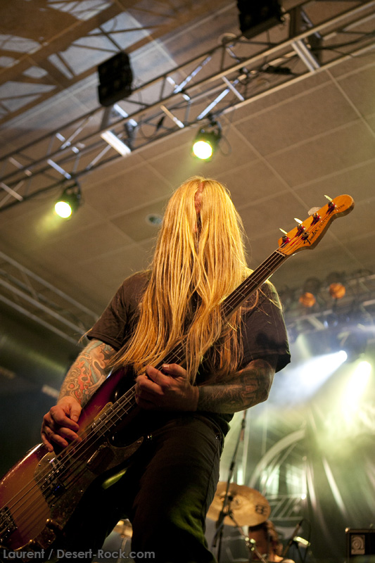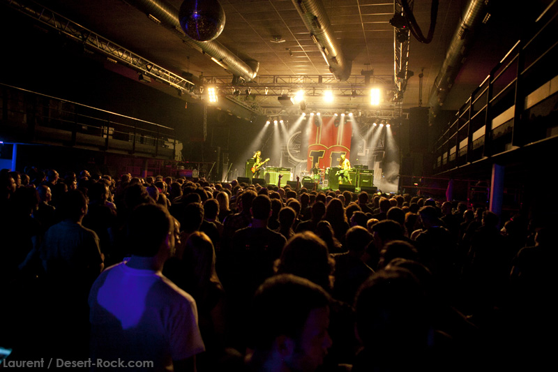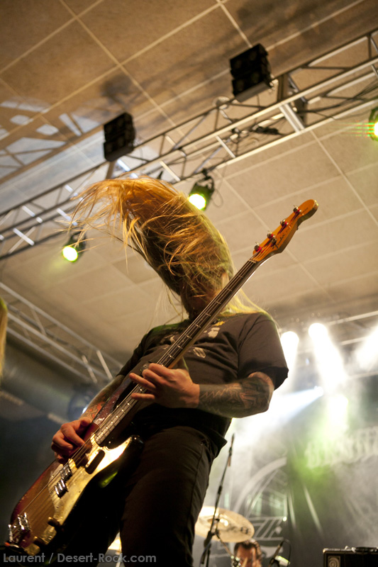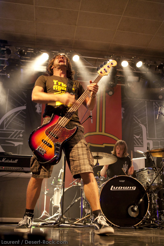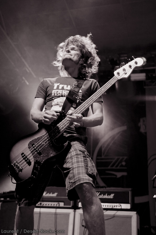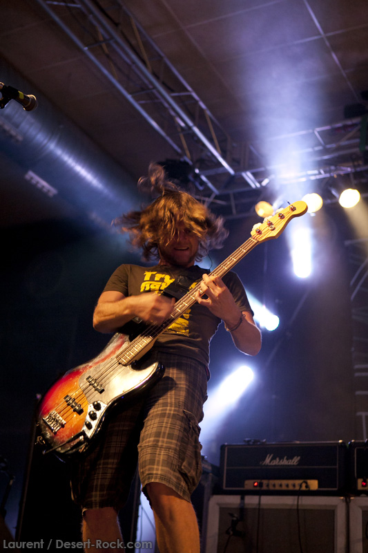 A l’heure exacte prévue, le trio scandinave de TRUCKFIGHTERS foule les planches et tourne tous les potards des grattes, ce qui suffit à déloger les centaines de personnes accoudées aux immenses bars pour se rapprocher de la scène. De manière très traditionnelle mais toujours aussi efficace, le combo entame son set par « Desert Cruiser », son grand classique. Effet garanti. Il faut comprendre pour mieux appréhender ce concert que le public du Sud de l’Europe (Sud de la France, Espagne, etc…) n’est pas vraiment coutumier de Truckfighters, le groupe n’ayant pas beaucoup mis les pieds dans ces contrées, contrairement aux régions plus nordiques, qui ont déjà été déflorées par notre fier trio suédois. Lorsque pendant ce déferlement de fuzz, le public voit Dango effectuer son premier saut de cabri, les yeux s’écarquillent forcément : il y a un monde entre la lourdeur sonore du groupe et son énergie scénique, et les premiers rangs ne tardent pas à le constater. En enquillant avec le superbe « Monte Gargano », Truckfighters clôture son sans-faute introductif. Derrière l’exubérance de Dango, Ozo se la donne sans retenue, et n’hésite pas à jouer son rôle de second frontman en venant occasionnellement haranguer le public, sans jamais négliger ni ses vocaux ni ses lignes de basse essentielles. Le groupe joue deux titres qui me paraîtront « étrangers », dont l’un au moins est annoncé comme nouveau (rappel : leur nouvel album est supposé sortir en 2013). Difficile après une écoute de se projeter sur la qualité de l’album après cette simple écoute, mais on peut dire sans problème qu’il s’intègre impeccablement à la set list de ce soir. Le groupe finit son long set (l’un des seuls bénéfices de l’annulation de KTB !) par une série de titres issus surtout de son premier album avant de conclure sur l’impeccable « Chameleon ». Même si le public de ce soir est connaisseur, gageons que le groupe s’est fait quelques fans dans la salle !