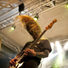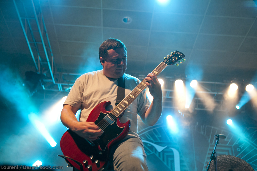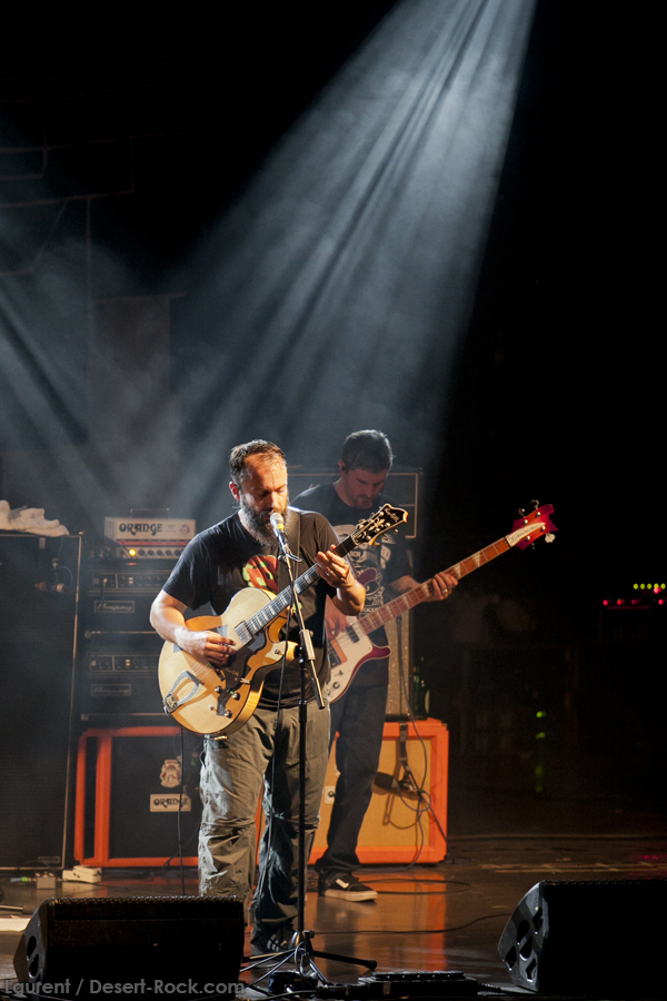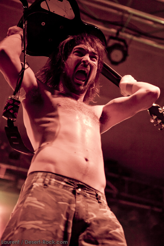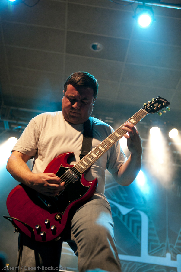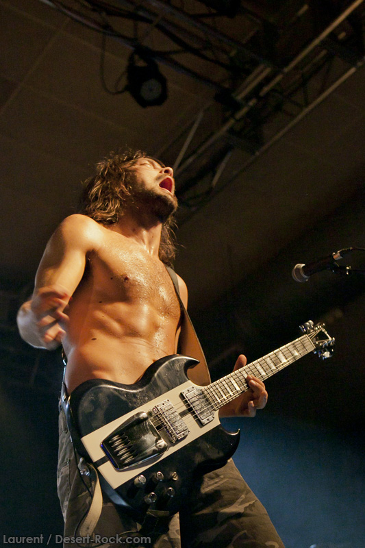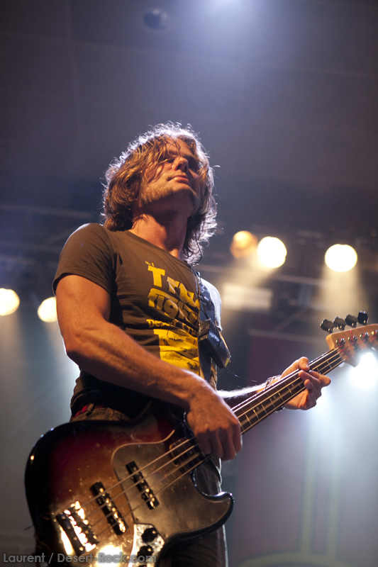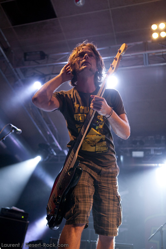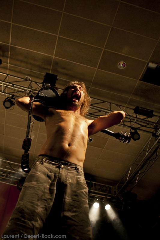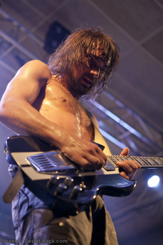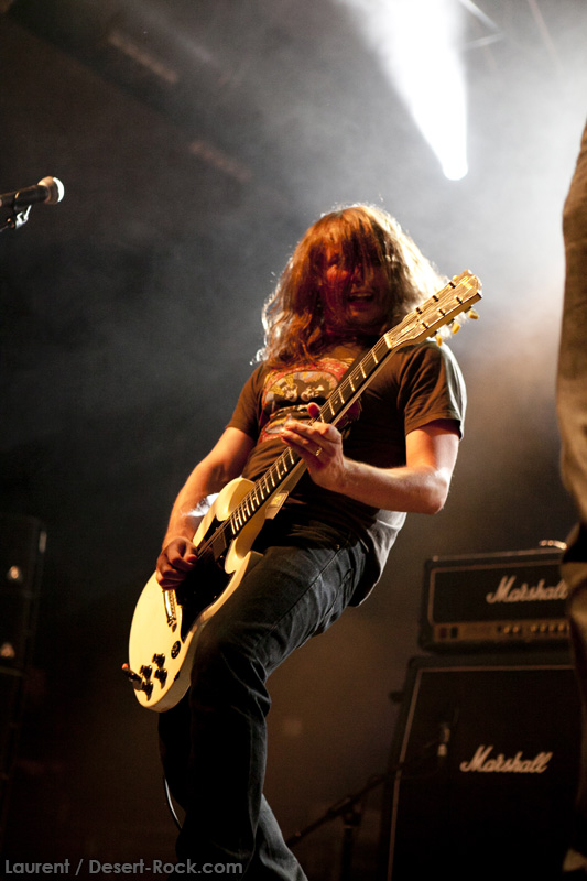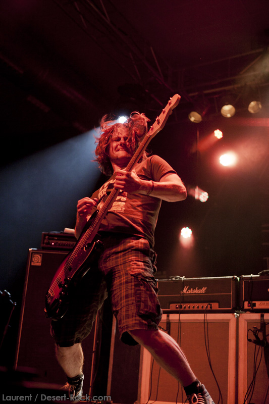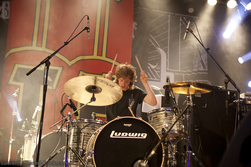 A l’heure exacte prévue, le trio scandinave de TRUCKFIGHTERS foule les planches et tourne tous les potards des grattes, ce qui suffit à déloger les centaines de personnes accoudées aux immenses bars pour se rapprocher de la scène. De manière très traditionnelle mais toujours aussi efficace, le combo entame son set par « Desert Cruiser », son grand classique. Effet garanti. Il faut comprendre pour mieux appréhender ce concert que le public du Sud de l’Europe (Sud de la France, Espagne, etc…) n’est pas vraiment coutumier de Truckfighters, le groupe n’ayant pas beaucoup mis les pieds dans ces contrées, contrairement aux régions plus nordiques, qui ont déjà été déflorées par notre fier trio suédois. Lorsque pendant ce déferlement de fuzz, le public voit Dango effectuer son premier saut de cabri, les yeux s’écarquillent forcément : il y a un monde entre la lourdeur sonore du groupe et son énergie scénique, et les premiers rangs ne tardent pas à le constater. En enquillant avec le superbe « Monte Gargano », Truckfighters clôture son sans-faute introductif. Derrière l’exubérance de Dango, Ozo se la donne sans retenue, et n’hésite pas à jouer son rôle de second frontman en venant occasionnellement haranguer le public, sans jamais négliger ni ses vocaux ni ses lignes de basse essentielles. Le groupe joue deux titres qui me paraîtront « étrangers », dont l’un au moins est annoncé comme nouveau (rappel : leur nouvel album est supposé sortir en 2013). Difficile après une écoute de se projeter sur la qualité de l’album après cette simple écoute, mais on peut dire sans problème qu’il s’intègre impeccablement à la set list de ce soir. Le groupe finit son long set (l’un des seuls bénéfices de l’annulation de KTB !) par une série de titres issus surtout de son premier album avant de conclure sur l’impeccable « Chameleon ». Même si le public de ce soir est connaisseur, gageons que le groupe s’est fait quelques fans dans la salle !