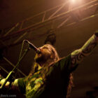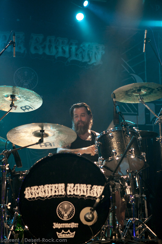 Quand les anglais de ORANGE GOBLIN montent sur scène, on réalise très vite qu’après avoir sorti son énorme dernier album « Eulogy for the Damned », le quatuor a pris une dimension inédite. En introduisant son concert comme il a introduit son album, par « Red Tide Rising », les britons font comprendre qu’ils ont la situation sous contrôle : ils prennent le public par la gorge et ne pensent pas le lâcher pendant presque 1h30. Même si la quantité de postures et de mimiques « bestiales » de l’immense Ben Ward sont limitées, le bonhomme ne manque pas d’énergie pour enfoncer le moindre de ses morceaux au fond de la gorge d’un public en joie qui n’en demandait pas tant. Ses collègues sont certes moins « extravagants », ça ne les empêche pas de débiter les rondins sans interruption et sans faux pas durant toute la soirée. Manifestement le groupe est bien conscient du pouvoir percussif de son dernier rejeton, étant donné qu’ils en jouent la moitié ce soir, à chaque fois avec une efficacité indéniable. Seul le superbe « The Fog » se trouve peut-être à mon goût un peu amoindri dans l’exercice – probablement au regard de sa qualité sur album. La qualité du son au Santana 27 est généralement au rendez-vous, ce qui est le cas pour OG, même s’ils ont choisi d’opter pour un mix lourd, crasseux, voire un peu foutraque parfois… Ca fait partie du charme de ce beau bébé ! Le reste du set est composé de titres pris dans tous leurs albums sans exception, avec des ponctions plus rares dans leurs plus vieux classiques (« Time traveling… » ou « Frequencies… »), constat logique au regard de l’évolution musicale du combo, désormais plus rentre-dedans que space rock ! Ca n’empêchera pas un beau succès de l’éponyme « Time travelling blues » (durant lequel Ben Ward descendra de scène pour aller à la rencontre directe du public ). On notera aussi l’incorporation dans le set du très bon « Made of rats », qui sur album accueillait des vocaux de John Garcia. Après une dédicace bien sentie pour Jeff Hanneman, le quartette quitte la scène après la paire de classiques que l’on attendait : « Quincy the pig boy » et surtout le toujours impeccable « Scorpionica ». Une grosse mandale !