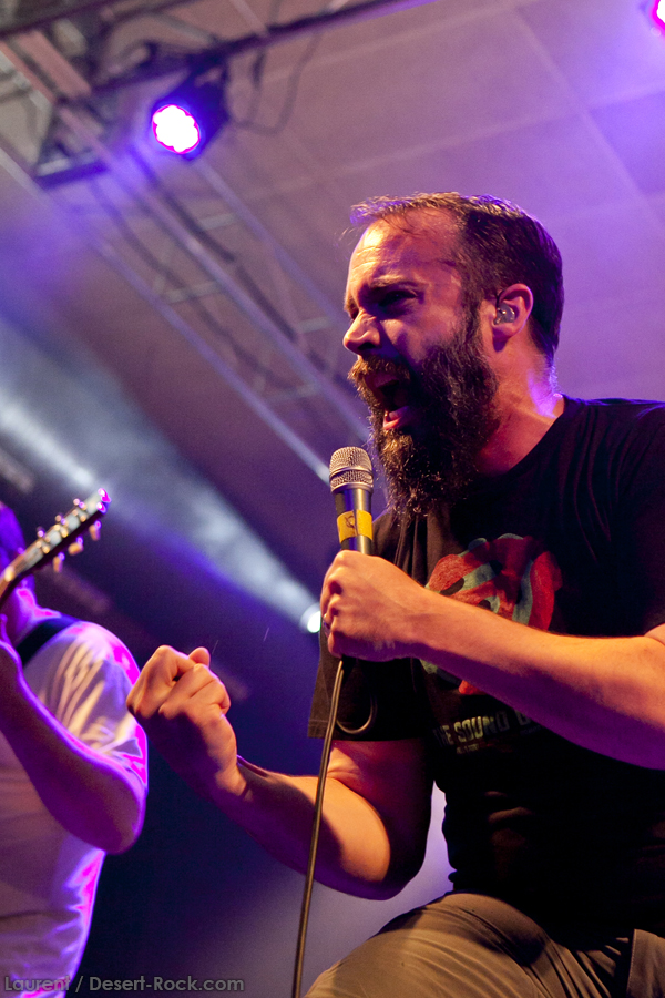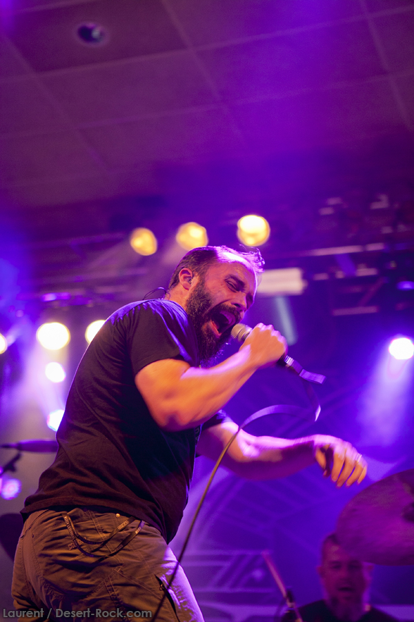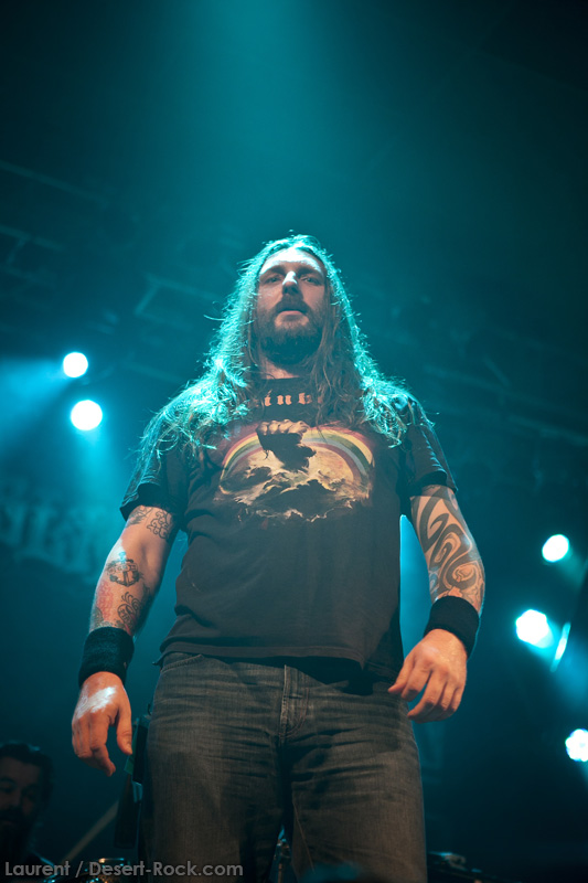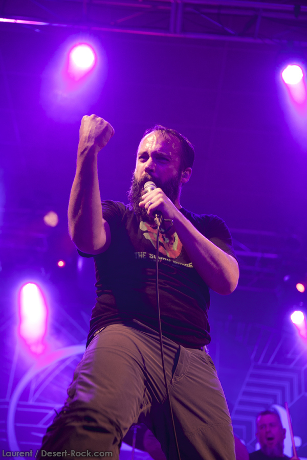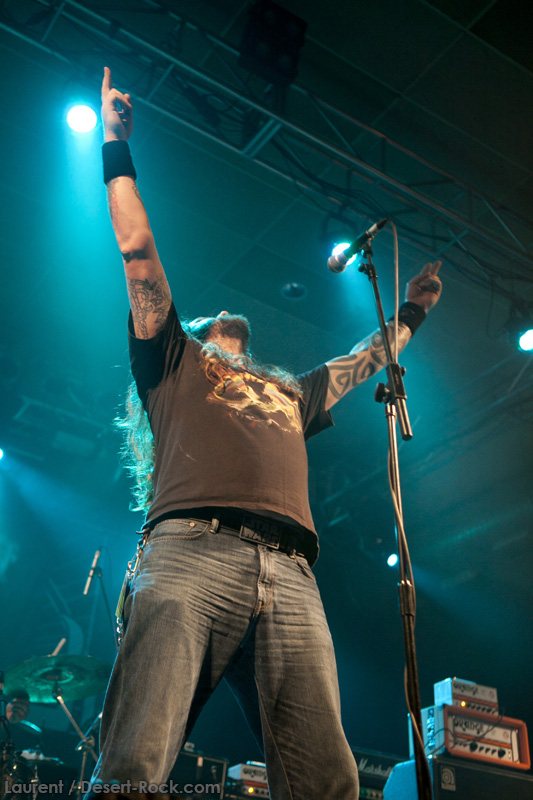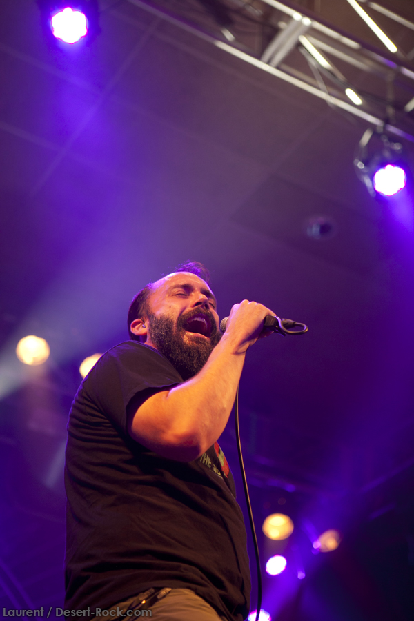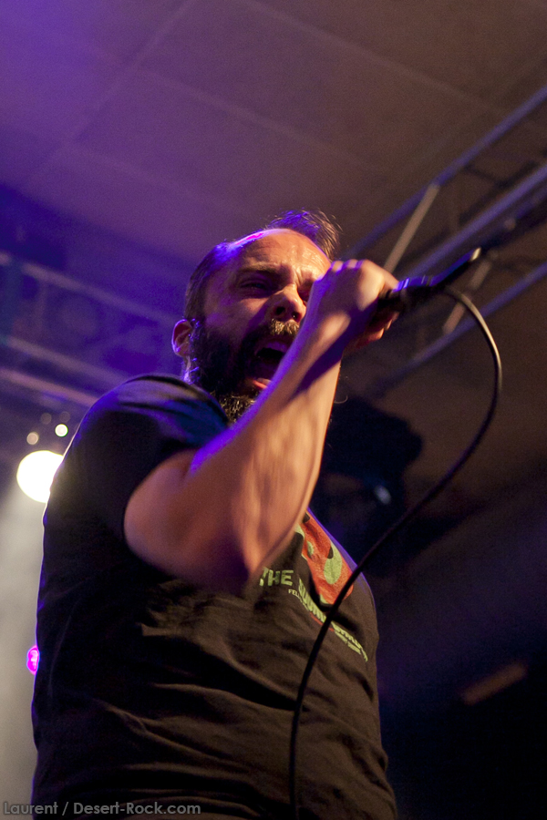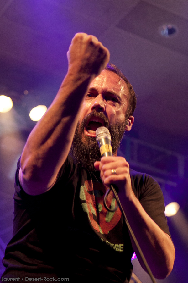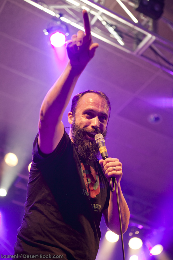 A peine le temps de se faire couler une bière au bar pour se remettre de nos émotions, les techos s’affairent sur la scène, et les balances sont rapides… Si bien que le public est pris par surprise : tout est prêt dix minutes avant l’horaire normal, CLUTCH ne va pas se faire prier pour grappiller quelques minutes supplémentaires sur scène. C’est un peu le rush pour le public qui remplit en quelques minutes toute la salle principale (une salle de taille assez imposante). Ce flux d’excitation rend ce début de set complètement électrique. Le choix du groupe de commencer par le plus furieux extrait de « Earth Rocker », en l’occurrence le terrible « Crucial Velocity », aura terrassé les premiers rangs en moins de deux minutes. Il faut voir le père Neal complètement déchaîné, les veines du cou prêtes à éclater, serrant le poing à se le faire saigner lorsqu’il éructe le refrain de ce brûlot ! Les quatre titres suivants ne laisseront pas une seule seconde de répit au public, en transe : « Cyborg Bette », « Mr Freedom », « Book, Saddle & Go » et le dévastateur « The Mob Goes Wild » feront de sévères dégâts et laisseront quelques flaques de bave au sol… Faut dire que les américains sont malins : dans le cadre d’un festival de cette tenue, avec une teneur en testostérone au taquet, il fallait taper fort, et ce dès le début. Pari gagné, à ce stade. La suite ne s’éloigne pas trop d’un best of de la carrière du groupe (disons la dernière décennie, les titres les plus anciens joués ce soir datant de « Robot Hive… »), dont on retiendra particulièrement un très bon « Mice & Gods » et « The Regulator » toujours efficace. Sur la fin du set, les techniciens amènent deux guitares acoustiques pour Neil et Tim et l’on voit Jean-Paul se saisir de ses balais de batterie, signe que les choses vont se calmer pour quelques minutes. Les lumières s’effacent alors progressivement alors que Jean-Paul amène progressivement le somptueux « Gone cold », parfaitement servi par un groupe en osmose, un public hypnotisé, et des lumières subtiles. La grande classe. Mais la parenthèse est vite oubliée avec le heavy/groovy « The face » puis le furieux « Electric worry » qui finira de mettre le public sur les genoux. Même si le groupe se retire de la scène, personne n’est dupe : impossible en toute décence de laisser le public dans cet état sans un rappel. Et là, phénomène assez incroyable, le groupe dégaine deux cartouches étonnantes, en l’occurrence « Oh, Isabella » et « The wolf man… ». Etonnantes car lorsque l’on fait le compte… le groupe aura joué ce soir l’intégralité de « Earth Rocker » sur scène ! Spectaculaire performance pour un set impeccable, dont n’ont pas été oubliés la plupart des classiques, et qui aura prouvé, si le doute était encore permis, quel excellent album est « Earth Rocker », dont la retranscription scénique ne souffre d’aucune faiblesse.