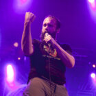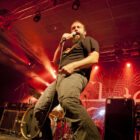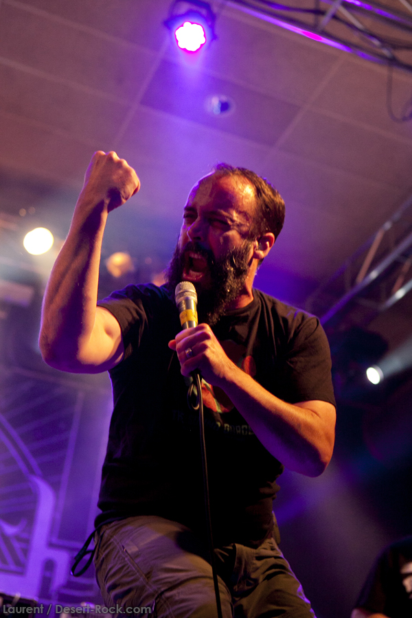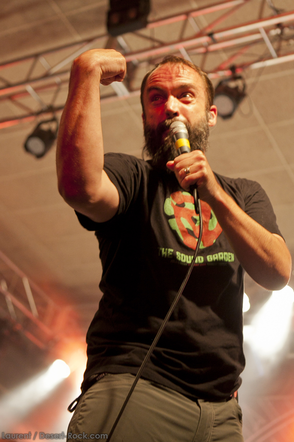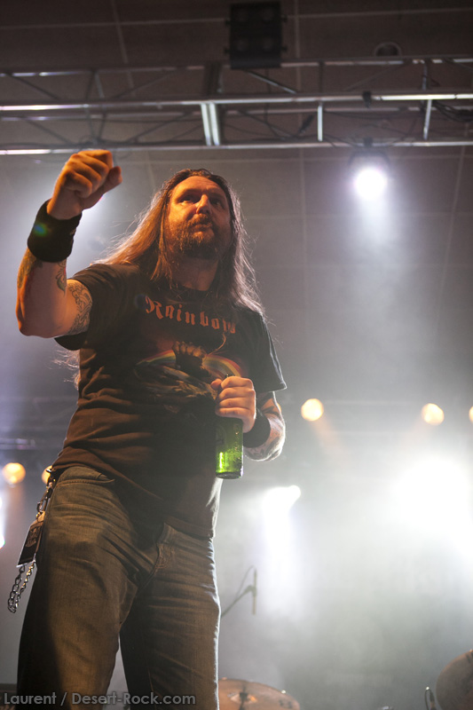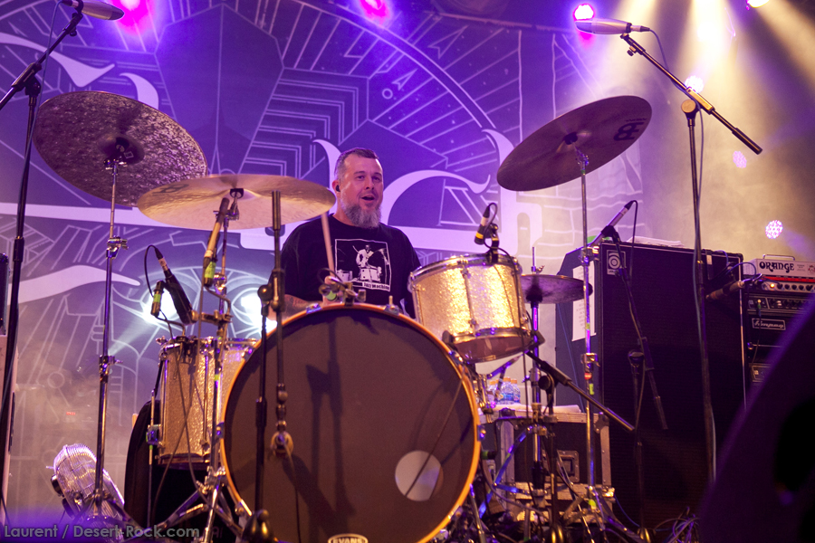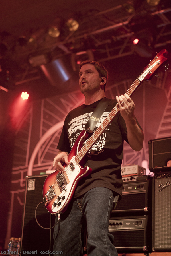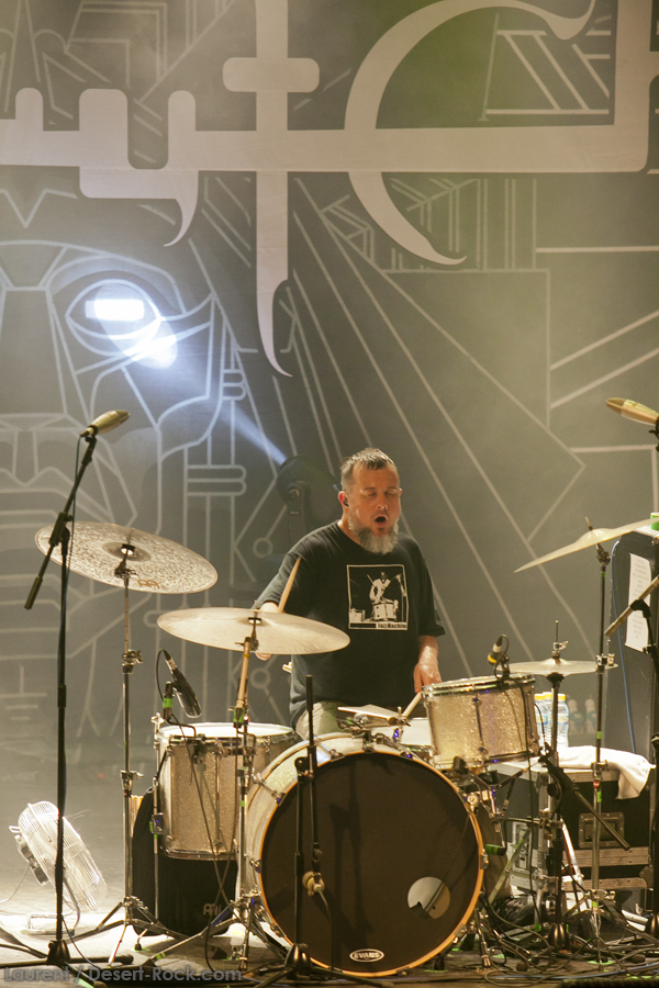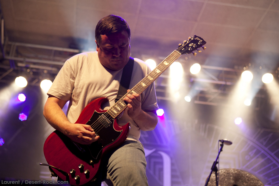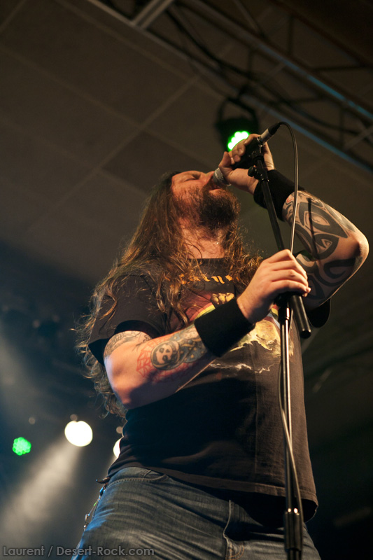 A peine le temps de se faire couler une bière au bar pour se remettre de nos émotions, les techos s’affairent sur la scène, et les balances sont rapides… Si bien que le public est pris par surprise : tout est prêt dix minutes avant l’horaire normal, CLUTCH ne va pas se faire prier pour grappiller quelques minutes supplémentaires sur scène. C’est un peu le rush pour le public qui remplit en quelques minutes toute la salle principale (une salle de taille assez imposante). Ce flux d’excitation rend ce début de set complètement électrique. Le choix du groupe de commencer par le plus furieux extrait de « Earth Rocker », en l’occurrence le terrible « Crucial Velocity », aura terrassé les premiers rangs en moins de deux minutes. Il faut voir le père Neal complètement déchaîné, les veines du cou prêtes à éclater, serrant le poing à se le faire saigner lorsqu’il éructe le refrain de ce brûlot ! Les quatre titres suivants ne laisseront pas une seule seconde de répit au public, en transe : « Cyborg Bette », « Mr Freedom », « Book, Saddle & Go » et le dévastateur « The Mob Goes Wild » feront de sévères dégâts et laisseront quelques flaques de bave au sol… Faut dire que les américains sont malins : dans le cadre d’un festival de cette tenue, avec une teneur en testostérone au taquet, il fallait taper fort, et ce dès le début. Pari gagné, à ce stade. La suite ne s’éloigne pas trop d’un best of de la carrière du groupe (disons la dernière décennie, les titres les plus anciens joués ce soir datant de « Robot Hive… »), dont on retiendra particulièrement un très bon « Mice & Gods » et « The Regulator » toujours efficace. Sur la fin du set, les techniciens amènent deux guitares acoustiques pour Neil et Tim et l’on voit Jean-Paul se saisir de ses balais de batterie, signe que les choses vont se calmer pour quelques minutes. Les lumières s’effacent alors progressivement alors que Jean-Paul amène progressivement le somptueux « Gone cold », parfaitement servi par un groupe en osmose, un public hypnotisé, et des lumières subtiles. La grande classe. Mais la parenthèse est vite oubliée avec le heavy/groovy « The face » puis le furieux « Electric worry » qui finira de mettre le public sur les genoux. Même si le groupe se retire de la scène, personne n’est dupe : impossible en toute décence de laisser le public dans cet état sans un rappel. Et là, phénomène assez incroyable, le groupe dégaine deux cartouches étonnantes, en l’occurrence « Oh, Isabella » et « The wolf man… ». Etonnantes car lorsque l’on fait le compte… le groupe aura joué ce soir l’intégralité de « Earth Rocker » sur scène ! Spectaculaire performance pour un set impeccable, dont n’ont pas été oubliés la plupart des classiques, et qui aura prouvé, si le doute était encore permis, quel excellent album est « Earth Rocker », dont la retranscription scénique ne souffre d’aucune faiblesse.