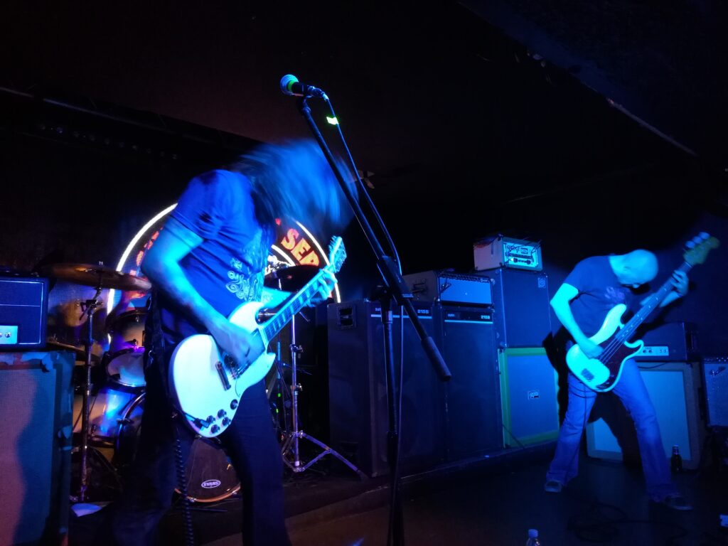 Sinister Haze commence avec une longue intro sans batterie avec Brandon Marcey grattant quelques accords tout en chantant d’une voix claire et légèrement plaintive. Pour vous donner une idée d’à quoi ressemble le side project du guitariste de Cough, prenez les morceaux les plus calmes de Still They Pray, enlevez un peu de crasse et rajoutez quelques harmonies, c’est gagné, vous obtenez Sinister Haze. Si les débuts de ce groupe étaient largement orientée vers le stoner, il semblerait qu’il se soit maintenant tourné vers un rock psyché et planant, à grand renforts de claviers de l’espace, d’arpèges du futur ou carrément de violons. Sinister Haze, tout comme son papa Cough, garde un goût certain pour les ambiances maussades et nostalgiques, et transporte son auditeur dans une sorte de rêve éveillé. Les gaillards ont bien eu raison de se rajouter à la liste des groupes de ce soir.