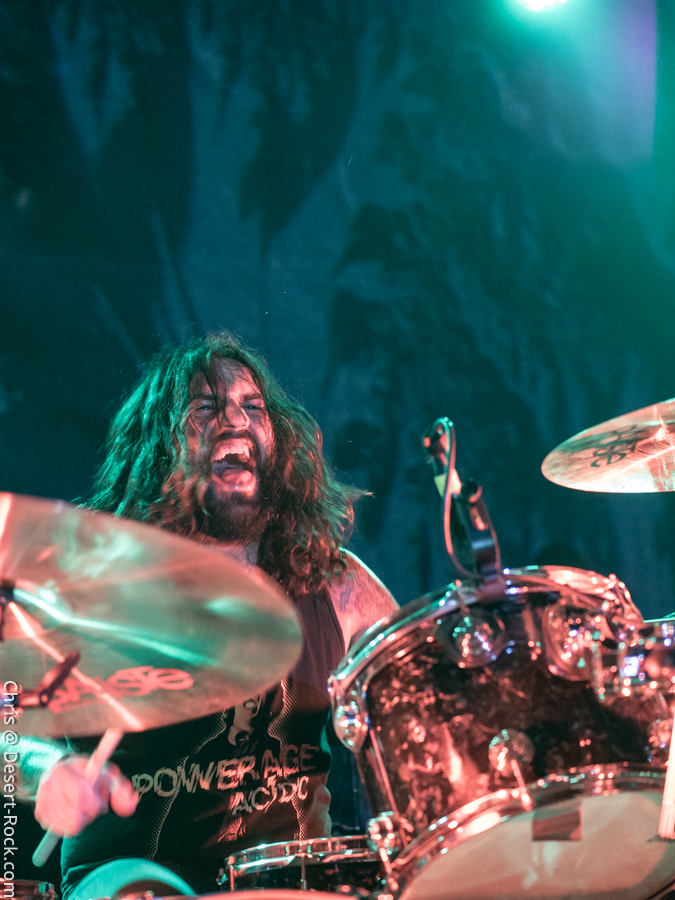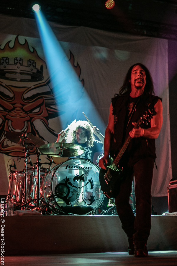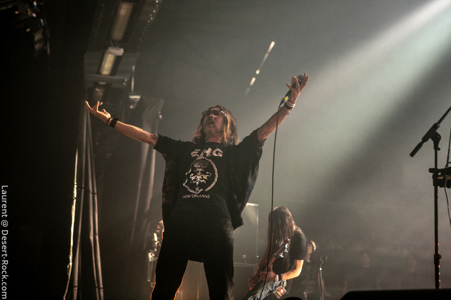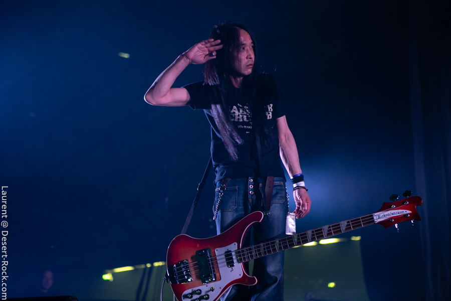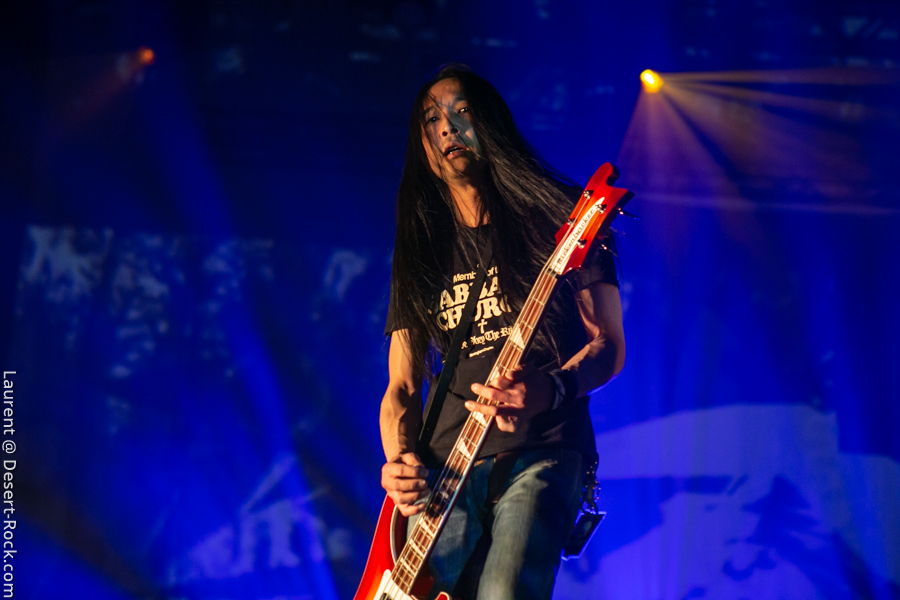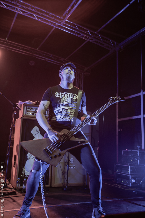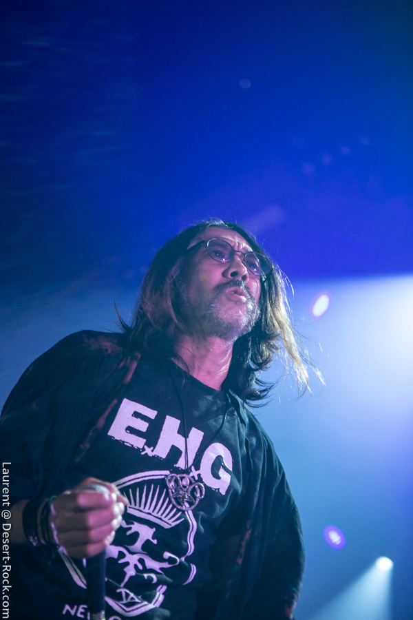 Premier groupe à inaugurer la magistrale mainstage de cette nouvelle salle, et déjà un gros morceau de la journée et du week-end : Church of Misery. Les japonais rentrent sous les acclamations et en sortiront de la même manière ; on peut déjà affirmer que l’opération fut réussie. Sûrs d’eux, ils lâchent d’entrée de jeu un gros « El Padrino » après quelques bidouilles de Takano sur son Théremine. Le son est lourdingue mais pas si mauvais (on allait avoir bien plus mauvais plus tard sur la même scène). A l’exception de Muraki, concentré sur sa guitare et peu expressif globalement (faut dire que l’air de rien, le gonze envoie du lourd tout du long), les gars sont en forme (comme à leur habitude), souriants, créant un vrai lien avec le public (les échanges de saluts et autres devil horns sont perpétuels), et on ne s’ennuie pas durant tout le set. C’est encore une fois Takano qui attire tous les regards en arpentant la scène et gesticulant dans tous les sens, mais la baraque est tenue et bien tenue par Tatsu Mikami est ses lignes de basse impeccables. On notera en particulier un très impressionnant « Born to Raise Hell » et un « I, Motherfucker » percutant. Très bonne prestation du quatuor nippon. Véritable entrée en matière de la journée, Church of Misery ne déçoit pas et mets la barre haut pour les suivants.