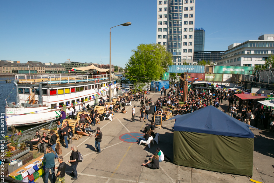 Après 11 heures de route en bagnole pour certains, un avion retardé pour d’autres, la team Desert-rock se retrouve à l’Arena Berlin pour cette nouvelle édition du Desertfest teuton. Nouveau lieu mais ambiance toujours aussi chaude dès l’ouverture des portes. Le soleil est de la partie et les premiers crânes chauves commencent à regretter d’avoir oublié la crème solaire. Tant pis pour eux, ils iront se planquer sous l’énorme hangar qui couvre les deux scènes du festoche, une bière à la main. Pour notre part, on contemple la vue de l’extérieur et surtout cette piscine bleu turquoise qui jouxte l’Arena berlinoise mais qui nous est malheureusement inaccessible… Qu’importe, on n’est pas venu pour bronzer mais pour prendre du son plein la tronche pendant trois longues journées. Et autant vous dire tout de suite qu’on n’a pas été déçu du voyage. On vous raconte tout en détail.