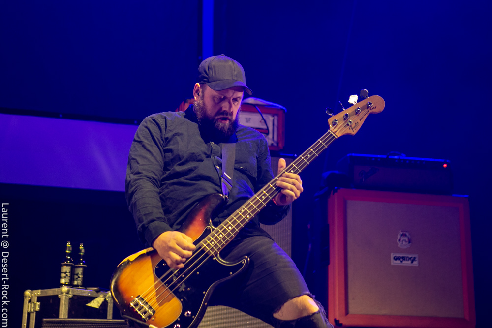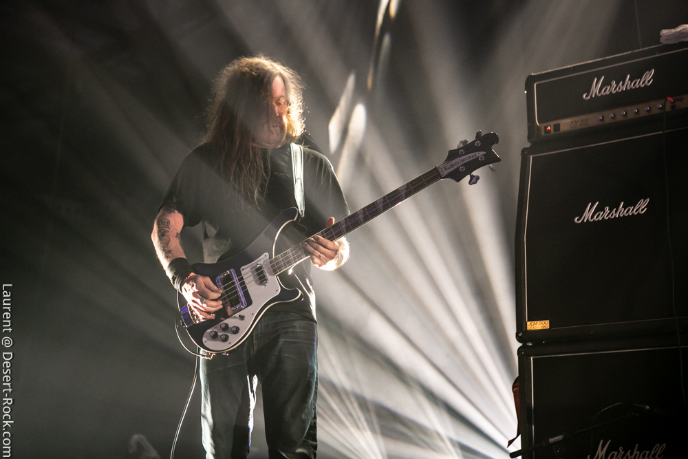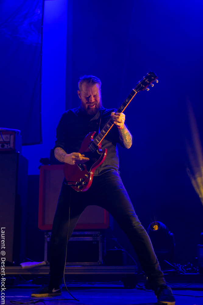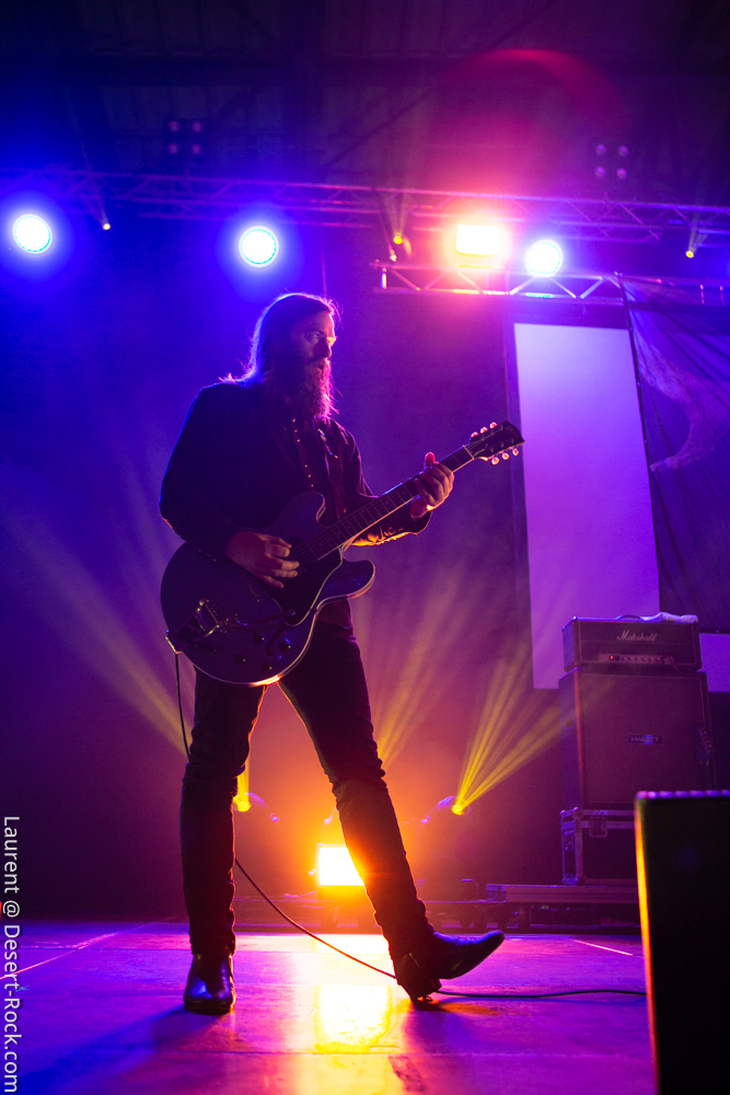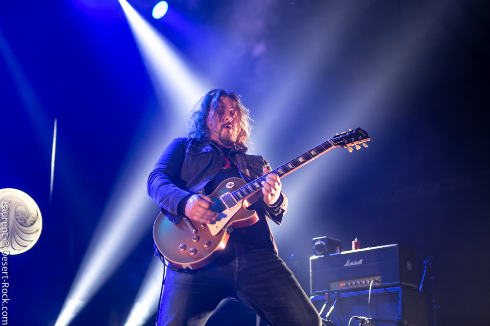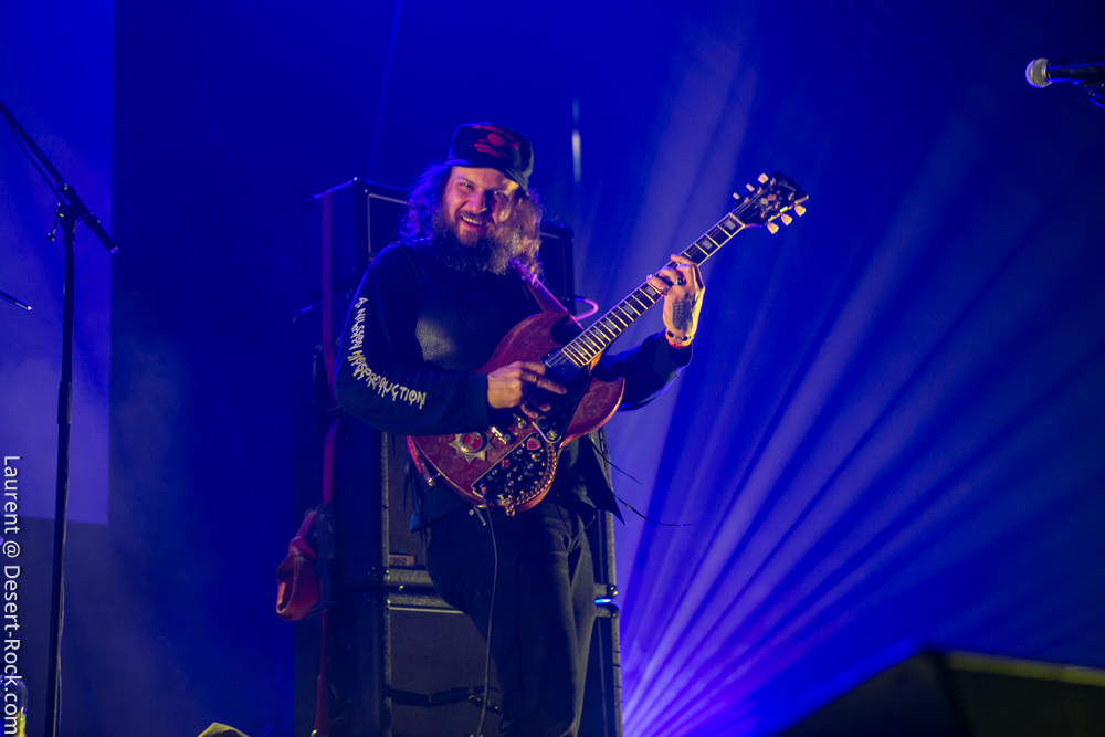 Le trio américain monte sur scène sur fond de « War Pigs » en headbanguant gentiment avec le sourire. En prenant son instrument et en contemplant l’Arena pleine à craquer, Charles Michael Parks Jr fait part de sa surprise « Wow, vous êtes nombreux »… Car oui, le groupe est très attendu ; l’ascension de All Them Witches ces dernières années a porté ses fruits, et l’on retrouve le (désormais) trio dans la partie haute de nombreux festivals. Pendant une grosse heure et quart, ils vont s’employer, par le menu, à justifier de cette notoriété. Après une intro sur le vieux « Funeral for a Drunken Bird », le groupe commence à montrer un visage live séduisant, avec par exemple « 3-5-7 » et son final enthousiasmant, ou un peu plus tard le virevoltant « When God Comes Back ». Le combo est carré, c’est le moins que l’on puisse dire, et ne pâtit pas franchement du départ de son claviériste : tout est là et bien là en format trio. Robby Staebler à la batterie frappe comme une mule, le regard hargneux, quasiment « habité » et même semblant pris de spasmes sur les derniers titres, on le croirait en transe ; impressionnant. Les soli de Mc Leod sont limpides, inspirés et efficaces. Niveau mise en place, le groupe est juste hallucinant, et l’efficacité est au rendez-vous. Côté set list, le focus est mis sur le dernier opus ATW, bien sûr, et le set s’en retrouve moins nerveux, avec des moments un peu « plats » ici ou là, admettons-le. Le petit sentiment de folie et de relief des productions précédentes manque un peu parfois. Mais le show déroule sans jamais le moindre ennui, et on ne peut que reconnaître la qualité musicale de ce groupe, malgré une set list mélangeant valeurs sûres et morceaux un peu moins intéressants.