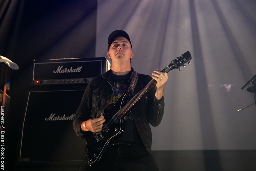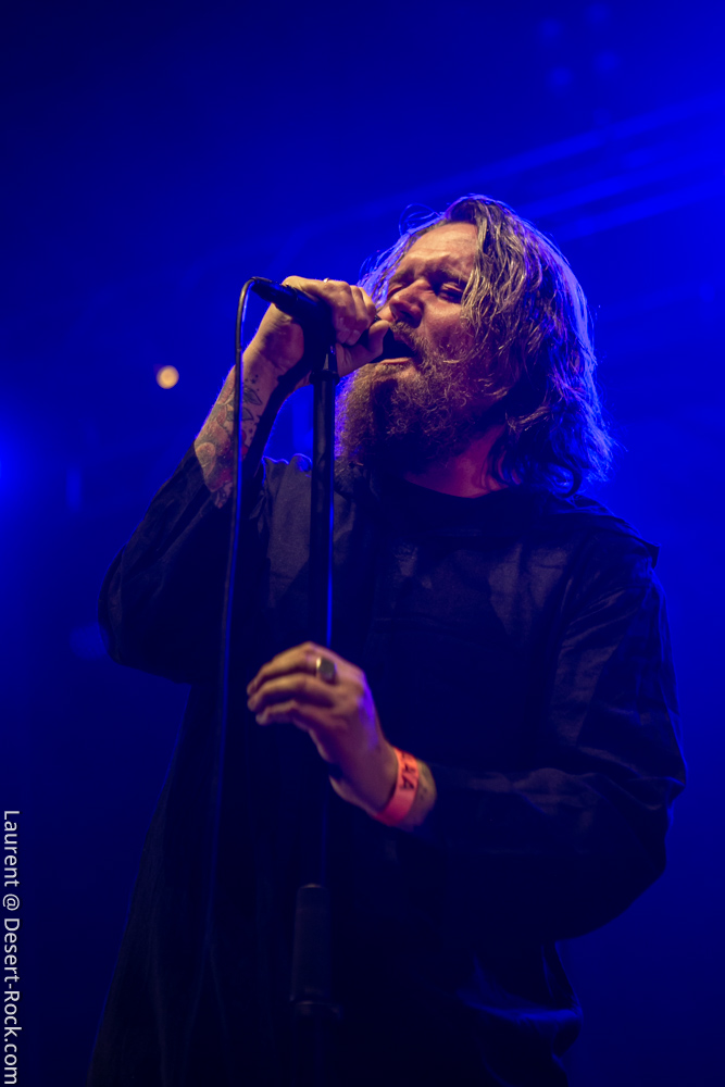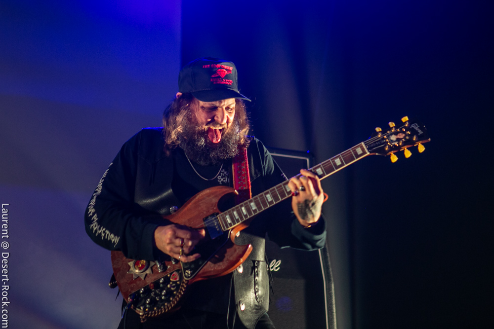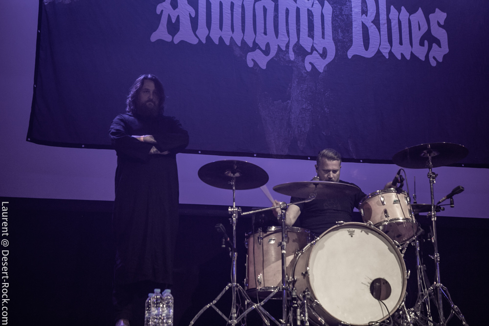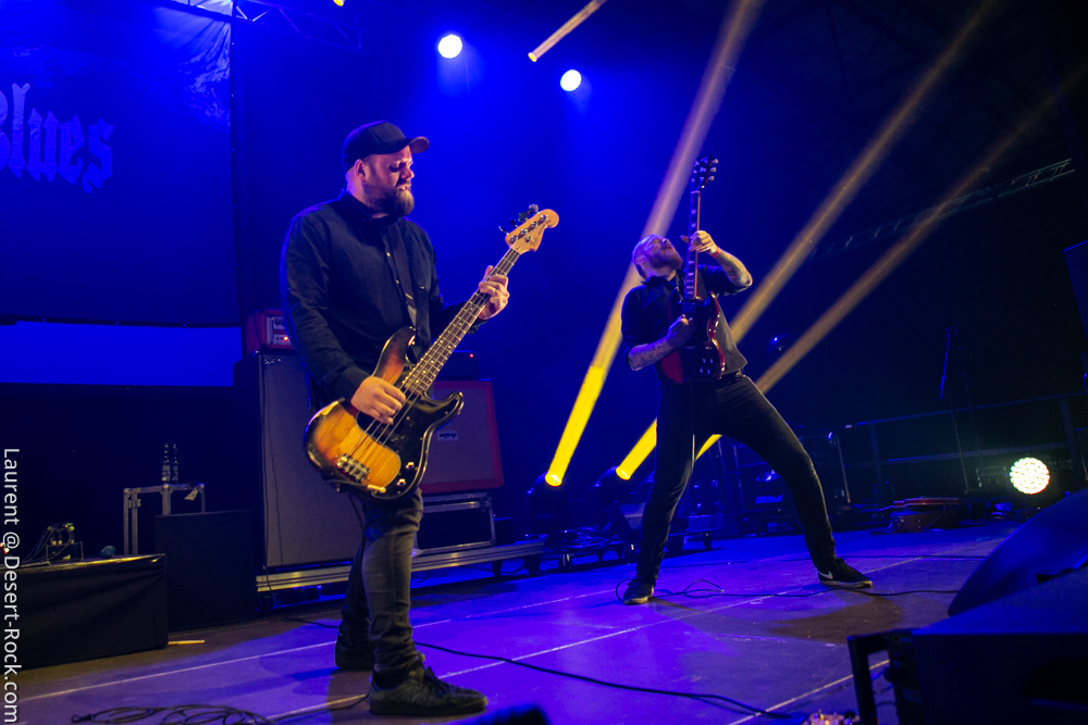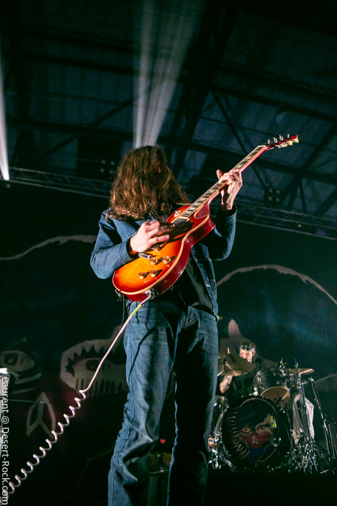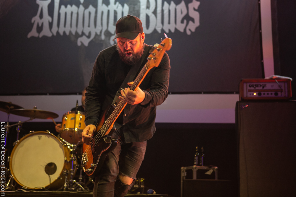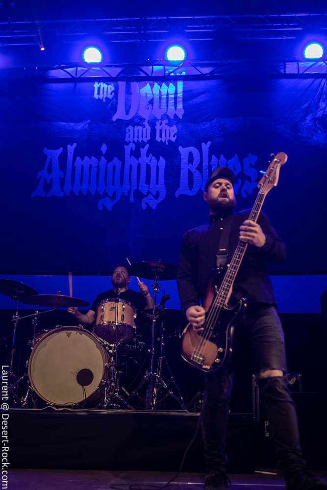 On rentre donc pour la première fois dans la salle pour constater qu’il n’y a plus désormais de seconde scène annexe, mais bel et bien une « salle dans la salle », énorme. Ce fameux dispositif censé améliorer le son des concerts nous inquiétait, or il s’avère parfaitement incorporé dans l’Arena, y proposant un espace dédié aux concerts, qui laisse largement la place à installer à côté le market, le merch officiel, une zone de food trucks, une zone pour les gamers, tatouages, etc… Tout ce qu’il faut ! Quoi qu’il en soit, l’honneur d’en essuyer les plâtres en revient à The Devil & The Almighty Blues. Le quintette norvégien a largement intensifié son activité scénique ces derniers mois, notamment en support d’un nouveau disque qui nous a beaucoup plu. Tandis que l’on retrouve généralement en ouverture des festivals des groupes de moindre importance pour un démarrage progressif, le Desertfest lâche les cheveaux dès le début. Quelques secondes suffisent à valider le dispositif de sonorisation : le son (et ça ne se démentira pas de tout le week end) est ample, puissant et précis. Et on n’est pas les seuls à en prendre plein la poire : dès les premières minutes, la salle apparaît déjà presque remplie ! Plusieurs milliers de stoner-heads se sont donné rendez-vous aujourd’hui (la journée du festival qui aura compté la plus importante affluence). Revenons à nos scandinaves, qui déroulent un set solide, exécuté à la perfection par des musiciens en parfaite osmose. Leur heavy blues, puissant, mélodique et inspiré, convainc les aficionados autant que ceux qui ne les connaissaient pas. On se prend encore une fois à espérer que parfois ils appuient un peu sur l’accélérateur, mais cette profusion de mid-tempos chaleureux (ce Andersen a une voix à donner le frisson) nous ravit.
