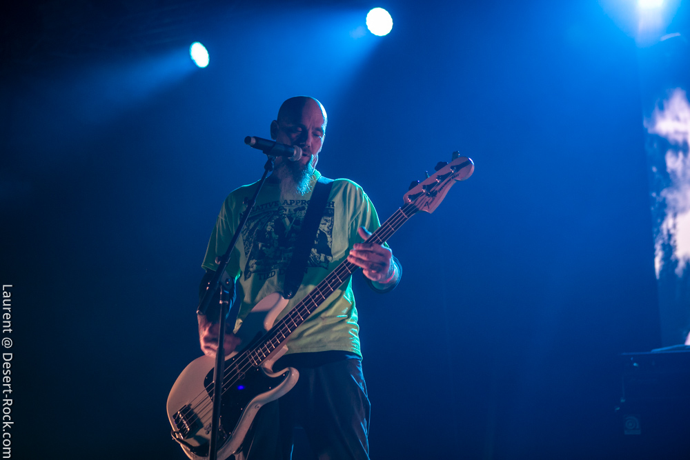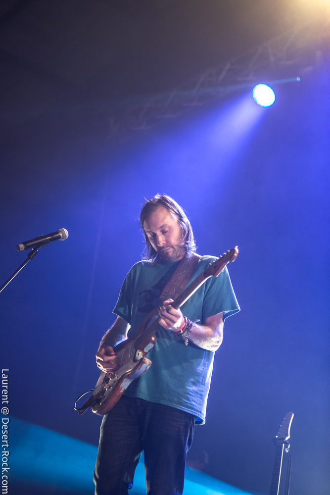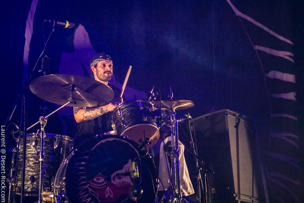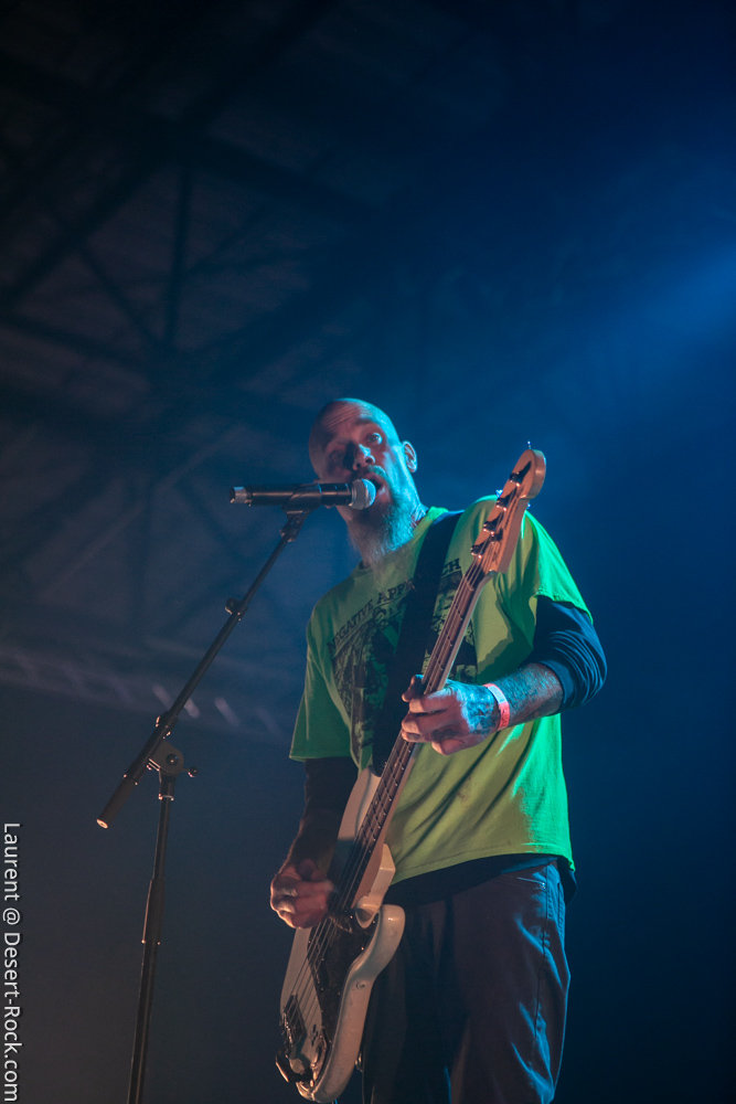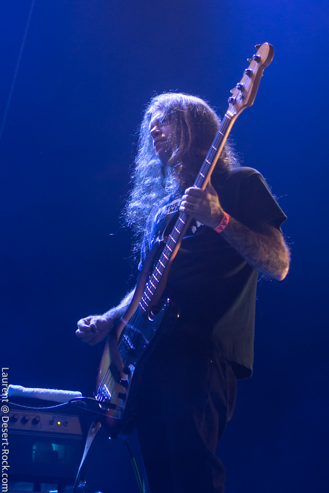 L’ex tout plein de formations qui ont marqué l’histoire de notre style de prédilection, voire même par-delà ses frontières, se radine sur scène avec deux acolytes pour envoyer sa mixture épicée à base de hurlements et rythmiques tapageuses : on en aura pour notre pognon. Le guitariste Mike Pygmie, déjà observé sur scène avec le père Garcia, connaîtra quelques difficultés en début de set, mais le meneur de revue ayant de la bouteille, de blanc il n’y eut point et il faut le souligner car certaines formations allaient peiner à combler le vide entre leurs titres durant ces trois jours ! Nick a déroulé sur la Main Stage tel un vrai pro en n’omettant pas d’aller piocher un “Green Machine” de vous savez, interprété avec de grosses couilles dans un esprit proche de l’urgence punk qui sied si bien au répertoire de Mondo Generator (qui ne renie pas ses origines en se pointant affublé d’un shirt de Negative Approach et balance des titres genre « All System Go » pied au plancher). Les projections interlopes siéront par ailleurs merveilleusement à ce show hargneux. Les petites fouines que nous sommes seront finalement déçues de ce final sur le titre de Kyuss, car nous avions bien lu (en parcourant le setlist trainant entre un pied de micro et un pédalier) que « Millionaire » clôturerait le set, mais le public, qui n’avait pas cette information, ne partagera au final pas notre frustration. Un réel plaisir pour les oreilles de recroiser la route de ce mythe de la scène et de se taper des titres du calibre de « The Last Train » en live. Même s’il arrivait tôt dans la journée, ce set rentre-dedans allait rompre un peu avec la couleur psychédélique de ce premier jour.