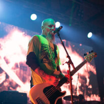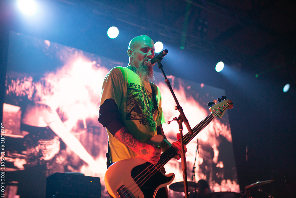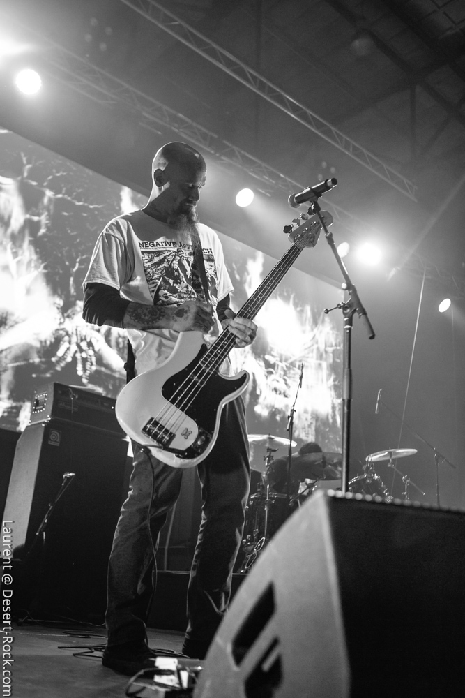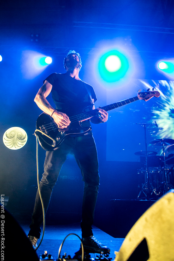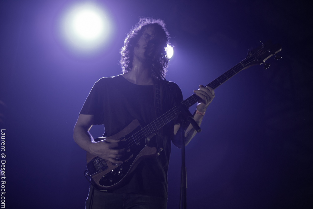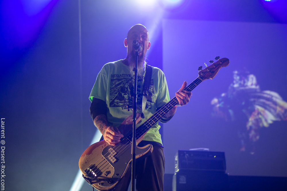 L’ex tout plein de formations qui ont marqué l’histoire de notre style de prédilection, voire même par-delà ses frontières, se radine sur scène avec deux acolytes pour envoyer sa mixture épicée à base de hurlements et rythmiques tapageuses : on en aura pour notre pognon. Le guitariste Mike Pygmie, déjà observé sur scène avec le père Garcia, connaîtra quelques difficultés en début de set, mais le meneur de revue ayant de la bouteille, de blanc il n’y eut point et il faut le souligner car certaines formations allaient peiner à combler le vide entre leurs titres durant ces trois jours ! Nick a déroulé sur la Main Stage tel un vrai pro en n’omettant pas d’aller piocher un “Green Machine” de vous savez, interprété avec de grosses couilles dans un esprit proche de l’urgence punk qui sied si bien au répertoire de Mondo Generator (qui ne renie pas ses origines en se pointant affublé d’un shirt de Negative Approach et balance des titres genre « All System Go » pied au plancher). Les projections interlopes siéront par ailleurs merveilleusement à ce show hargneux. Les petites fouines que nous sommes seront finalement déçues de ce final sur le titre de Kyuss, car nous avions bien lu (en parcourant le setlist trainant entre un pied de micro et un pédalier) que « Millionaire » clôturerait le set, mais le public, qui n’avait pas cette information, ne partagera au final pas notre frustration. Un réel plaisir pour les oreilles de recroiser la route de ce mythe de la scène et de se taper des titres du calibre de « The Last Train » en live. Même s’il arrivait tôt dans la journée, ce set rentre-dedans allait rompre un peu avec la couleur psychédélique de ce premier jour.
