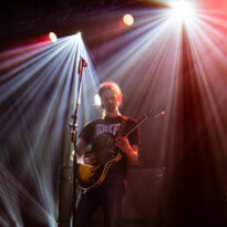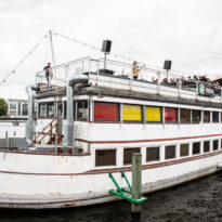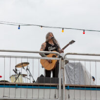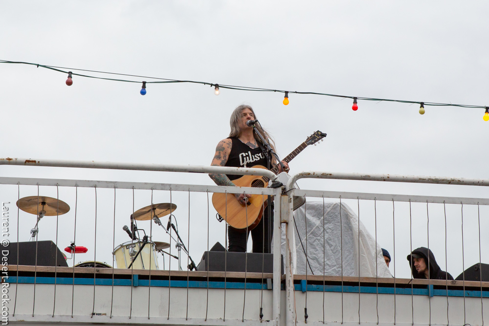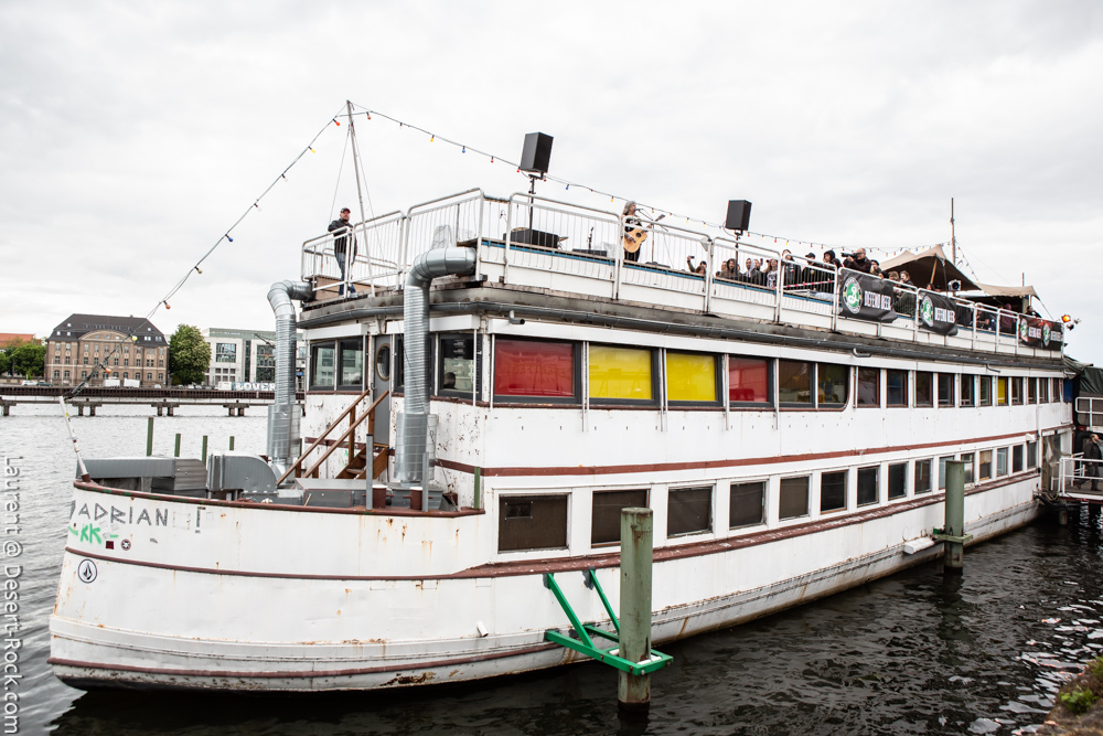 Le temps est venu de remettre le nez dehors pour assister au premier concert sur le Hoppetosse, le bateau à quai sur le bord du biergarten. On découvre alors le dispositif, pour le moins atypique : les artistes sont installés sur le pont supérieur, en plein air, avec une petite zone sur le reste du pont, à côté de la scène, pour le public, mais surtout l’entièreté du beergarten au pied du bateau comme public ! Plusieurs centaines de personnes assises pour manger leur repas, boire une bière à la cool ou simplement assister au concert en contrebas. La configuration est étrange car distante depuis le quai, mais techniquement la qualité de la sono était au niveau des attentes. Surréaliste… Et sur le bateau, donc, seul sur la scène avec sa guitare acoustique, Wino. En débardeur malgré une température plutôt fraîche (la vague de froid sur l’Europe n’a pas épargné Berlin, même si la pluie fut globalement absente durant tout le week-end), le charismatique frontman de tant de formations adorées de vos serviteurs enchaîne les chansons, sans chichi, avec le sourire, comme s’il était sur la petit scène du bar du coin. Côté compos, il tape largement dans son répertoire acoustique, en particulier issu de « Adrift », et y glisse quelques reprises ou titres co-écrits avec Conny Ochs. On se laisse prendre assez facilement, on pense à des vieux Dylan avec une voix chaude et profonde, sur des titres généralement sombres et mélancoliques (mention spéciale au poignant « Song at the Bottom of the Bottle »). Classe.