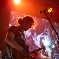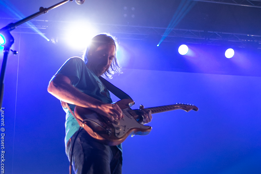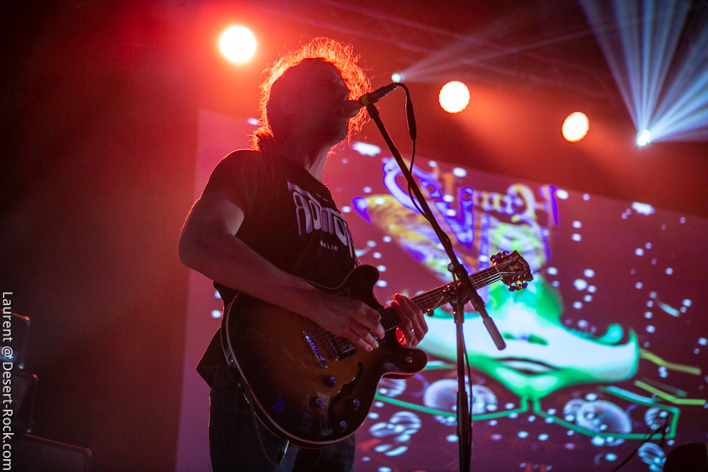 Earthless avec Monkey 3 et Colour Haze le même soir, c’est clairement une journée de rêve pour les amateurs de plans hypnotiques, et cela constitue tout aussi clairement l’une des raisons pour lesquelles ce premier jour de festival était sold out, donc le plus blindé du week-end (vos envoyés spéciaux ont bien galéré d’entrée pour rallier les différents spots de cette fête du riff). Le public était donc bien entassé dans la salle (même si certains ont assisté plus longtemps que nous à la prestation jouée en extérieur) et le combo a envoyé un set ripoliné sur « Uluru Rock » interprété avec brio. Flanqués sur les côtés de leur batteur, en avant sur la scène avec son kit simple, le guitariste et le bassiste ont déployé de profil. Cette configuration, habituelle pour la formation californienne, est aussi éprouvée et qu’efficace, mais, même avec des lights correctes, le rendu visuel était en deçà de ce que les Suisses avaient proposé quelques heures plus tôt. Le groupe casse la monotonie instrumentale du set par quelques titres chantés efficaces, dont un « Electric Flame » qui commence avec un micro inaudible… mais aussi un excellent « Gifted by the Wind » en conclusion. Le son était soigné aux petits oignons (on s’y est très vite habitué en fait), mais, au final, le set de bonne facture des Ricains ne tenait pas la comparaison avec d’autres performances déjà observées par le passé où nous les avions connus plus généreux scéniquement.