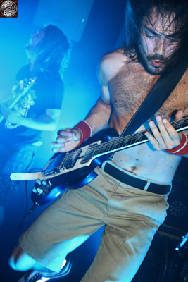 Forts d’une « ROCKZILLA STAGE » cette fois copieusement garnie, nos trois lillois ne ratent pas l’occasion de faire monter l’adrénaline du public, en assénant un stoner de très grande qualité, à savoir celui alliant une omniprésence de la basse, des riffs plombés, des mélodies entêtantes, des changements opportuns de rythme : bref, la subtile alchimie qui nous rend accros au stoner. Le son est carrément excellent et permet au groupe de captiver un auditoire, qui, dans sa grande majorité, découvre les frenchies pour la première fois en live. Reprenant l’essentiel des titres de leur excellent album « The sundering » (2008), ils ne commettent pas l’erreur de les reproduire de façon fidèle et stérile, mais profitent de l’excellente réactivité des festivaliers pour « envoyer la sauce », lâcher les chevaux et insister sur les riffs qui font du bien ! A l’instar des Karma To Burn, Glowsun décoche son gros stoner comme un direct du droit qui fait mal, sauf que là, on en redemande !! Je comprends avec plus d’acuité, les raisons qui me font aimer ce style, c’est « l’éclate » suprême, Glowsun me fait penser à un QOTSA moins alambiqué, mais tout aussi expérimenté et surtout tout aussi riche en émotions. Oui, décidément, ces chtis, c’est du lourd et nous pouvons être fiers de compter dans notre hexagone, un des fleurons du genre. Le public ne s’y trompe pas et les acclame avec ardeur et détermination. Sans aucun doute une des toutes meilleures prestations du festival !!! Vivement leur prochain album, prévu, à priori, cette année !