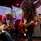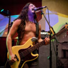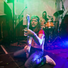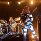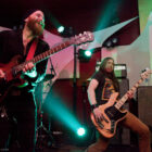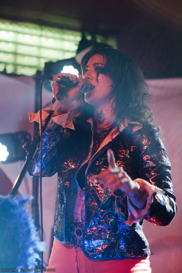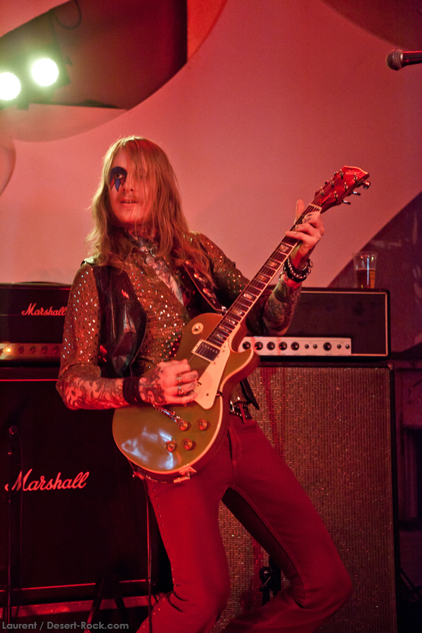 Et la journée commence de manière assez surprenante, tandis que l’on entre dans le Foyer à 14h et quelques, où les berlinois de Travelin’ Jack s’affairent déjà sur scène. « Surprenant » car le quatuor se la joue hard rock glitter, look inclus (falzards collants, jeans pattes d’eph’, maquillage presque « kiss-iens »…), et attitude à l’avenant : malgré un bassiste format grizzly renfrogné, le guitariste Flo The Fly (!!) se la joue guitar hero absolu, et la chanteuse « Spaceface » (!!!) n’est pas en reste, même lorsqu’elle dégaine sa Flying V pour épauler son voisin à la six-cordes. Jouant sur le décalage thématique, le groupe se livre sans réserve devant un public pas encore trop tassé, mais qui semble adhérer au concept. De notre côté, on apprécie encore une fois le talent de programmation qui fait le pari de l’énergie pour introduire cette journée et dynamiser un peu le public qui commence juste à se réveiller. Les confettis dorés uber-kitsch qui jaillissent sur la fin du set et qui joncheront le sol et la petite scène toute la journée laisseront tout du long ce petit sourire en coin bienveillant qui aura caractérisé cette prestation réjouissante.