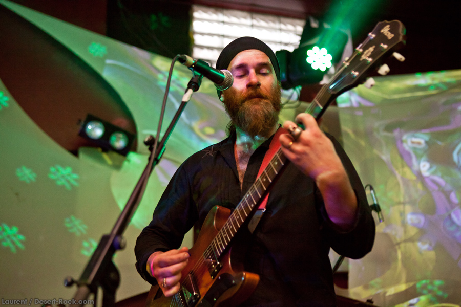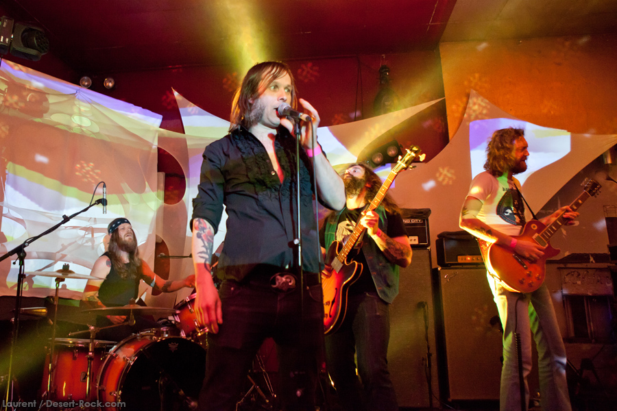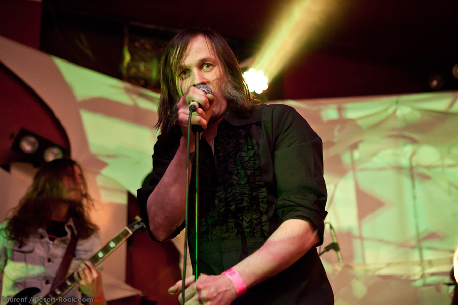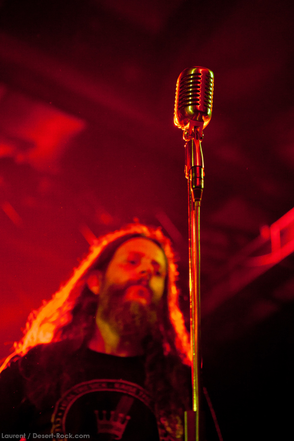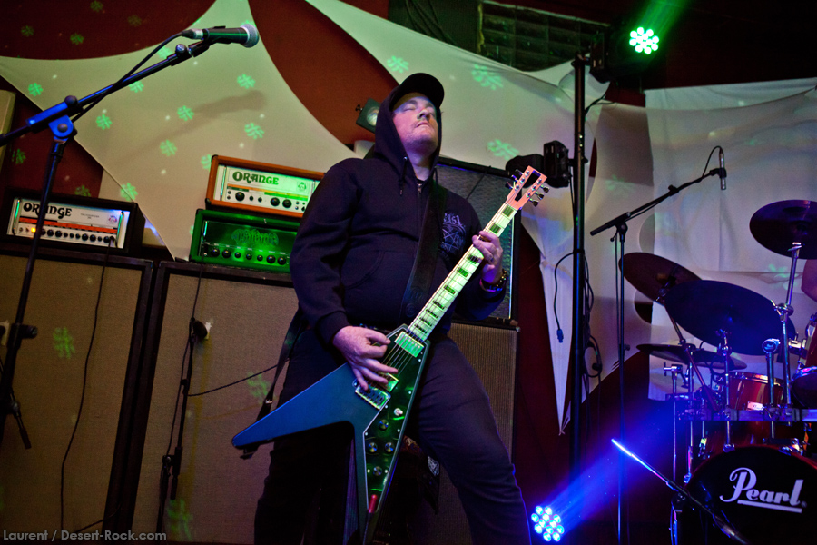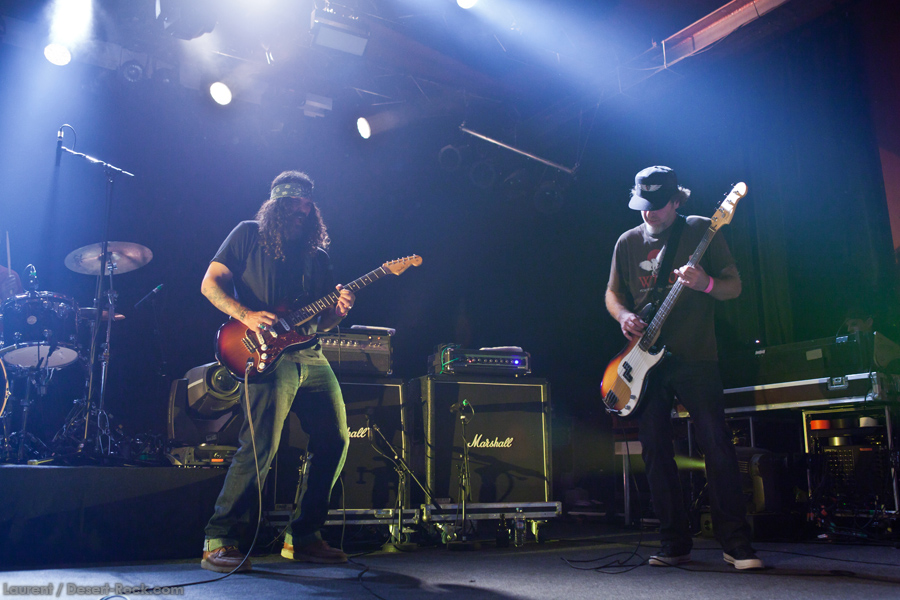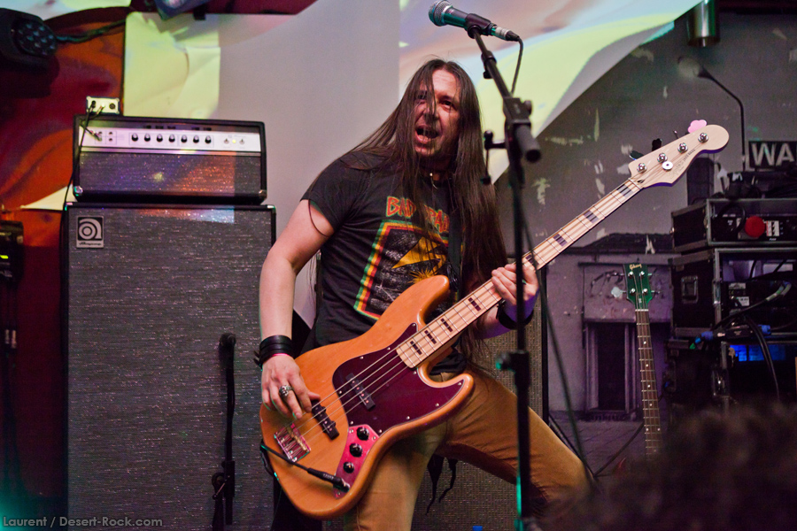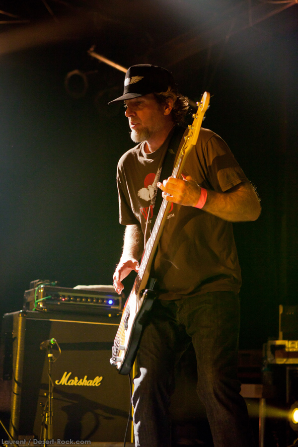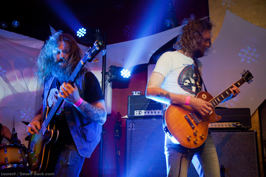 Présent depuis la veille sur le site du Desertfest, Brant Bjork était très attendu, et sa position de headliner de la journée est incontestable au vu de la notoriété démontrée du grand frisé ces derniers mois. Low profile jusqu’au bout des ongles, il débarque nonchalamment sur scène, un Martini à la main, qu’il dépose au sol devant ses retours, avant de s’engager avec son Low Desert Punk Band dans une impro instrumentale qui donne le ton de son set, impro se fondant en « Lazy Bones » enchaîné évidemment à l’indéboulonnable « Automatic Fantastic ». Plus qu’un vulgaire backing band, Bjork a trouvé une sacrée paire de cordistes avec le duo Bubba DuPree / Dave Dinsmore, qui l’épaulent avec efficacité et talent. On exprimera quelque réserve sur le nouveau batteur, Ryan Güt ; il faut dire que passer après Tony Tornay n’est pas facile, et le jeune batteur n’a pas le groove de son prédécesseur, même s’il fait le job. Le grand desert-rocker déroule un set de bon niveau, même si on sent le gaillard un peu en pilotage automatique de temps en temps, surtout quand on l’a déjà vu sur sa tournée précédente (d’autant plus que la set list n’est pas vraiment révolutionnée…) : tandis que le quatuor était impeccable de bout en bout il y a quelques mois, il vendange ici quelques titres qui perdent un peu en efficacité (« Too many chiefs… »). Mais on serait bien bégueule de ne pas apprécier la prestation du combo ce soir, qui déploie quand même une set list de classiques, qu’il étaye de quelques glorieuses impros instrus, et d’un nouveau titre en milieu de set. Soutenu par un light show efficace, et une évidente envie partagée de bien faire, le groupe joue sur du velours, surfant sur un coefficient sympathie qu’il n’a pas volé, ne serait-ce qu’au titre d’une carrière de besogneux, qui trouve son aboutissement légitime dans ces dernières tournées à succès. Perchés sur leur nuage, les zicos, heureux, festoieront une bonne part de la nuit, mettant à rude épreuve les détecteurs de fumée de leur loge jusqu’au bout de la nuit…