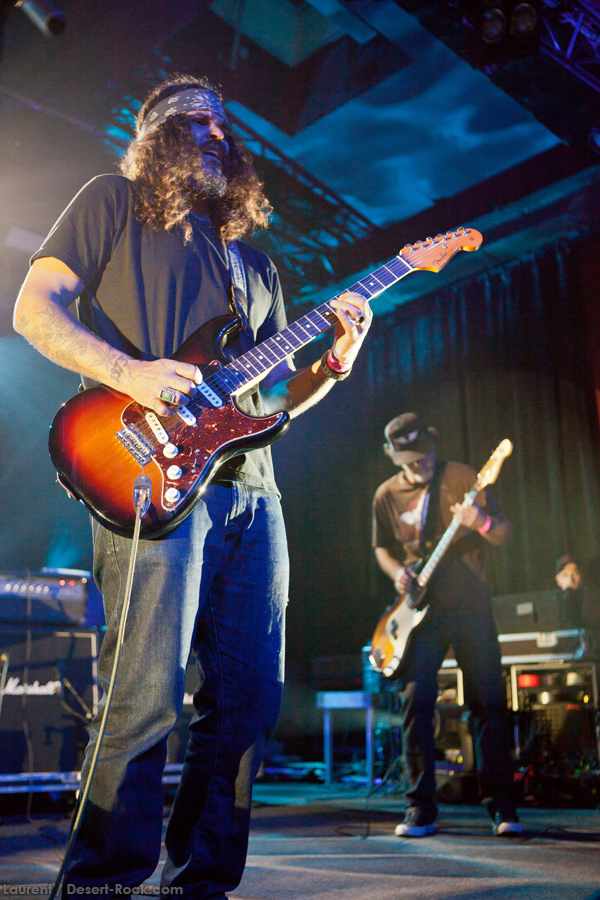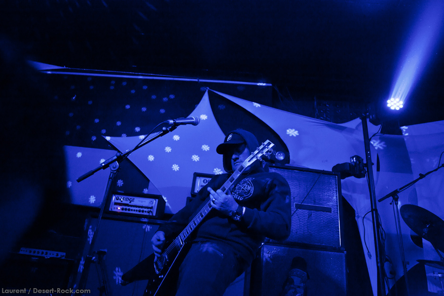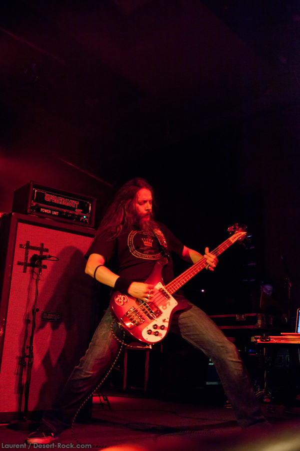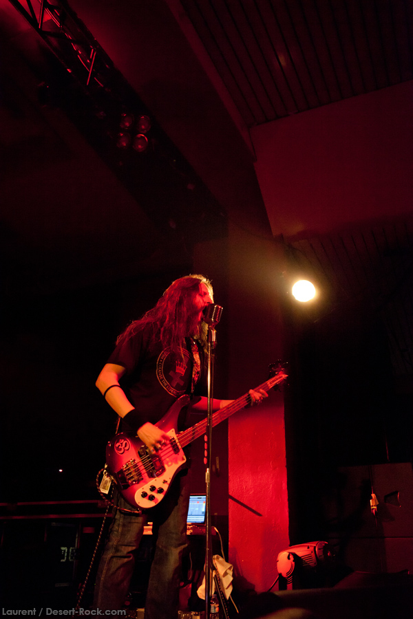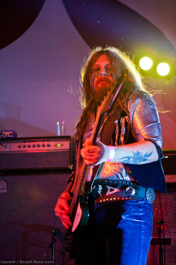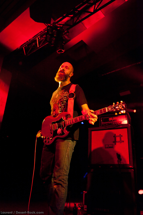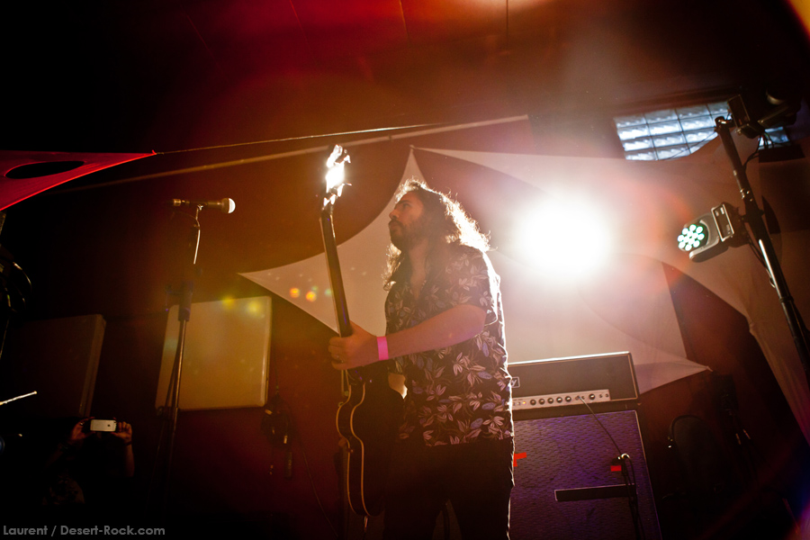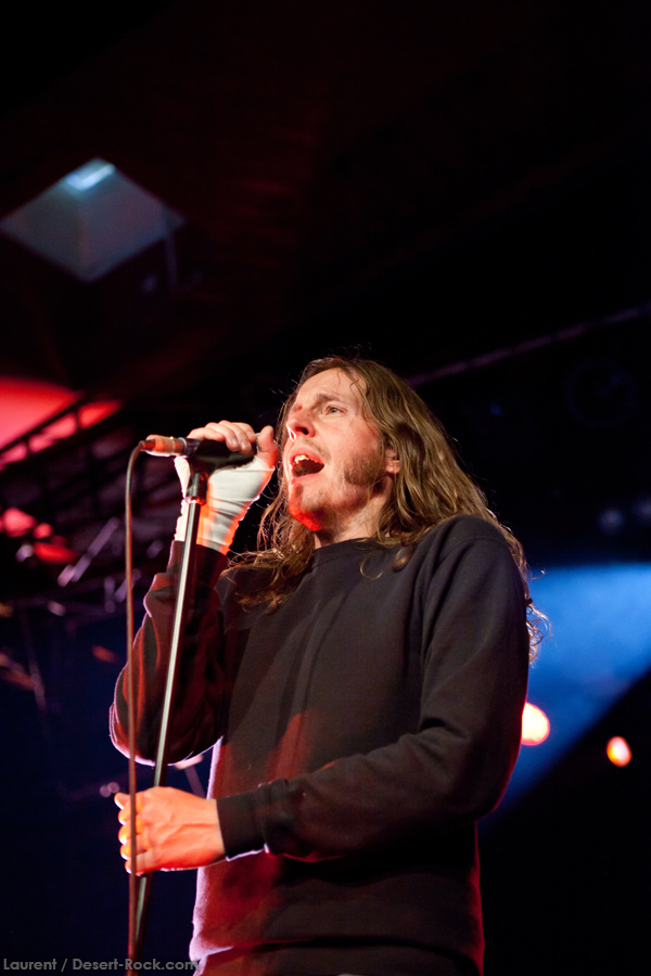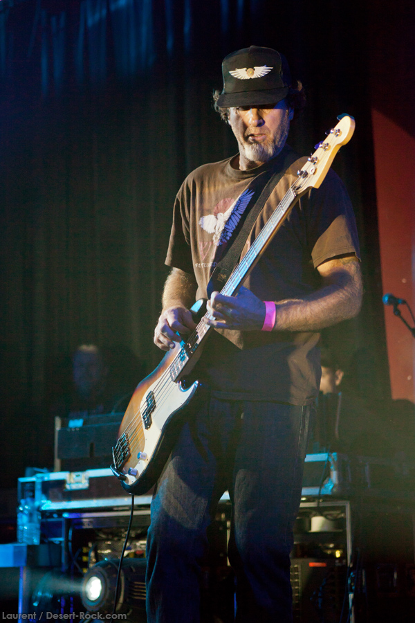 Présent depuis la veille sur le site du Desertfest, Brant Bjork était très attendu, et sa position de headliner de la journée est incontestable au vu de la notoriété démontrée du grand frisé ces derniers mois. Low profile jusqu’au bout des ongles, il débarque nonchalamment sur scène, un Martini à la main, qu’il dépose au sol devant ses retours, avant de s’engager avec son Low Desert Punk Band dans une impro instrumentale qui donne le ton de son set, impro se fondant en « Lazy Bones » enchaîné évidemment à l’indéboulonnable « Automatic Fantastic ». Plus qu’un vulgaire backing band, Bjork a trouvé une sacrée paire de cordistes avec le duo Bubba DuPree / Dave Dinsmore, qui l’épaulent avec efficacité et talent. On exprimera quelque réserve sur le nouveau batteur, Ryan Güt ; il faut dire que passer après Tony Tornay n’est pas facile, et le jeune batteur n’a pas le groove de son prédécesseur, même s’il fait le job. Le grand desert-rocker déroule un set de bon niveau, même si on sent le gaillard un peu en pilotage automatique de temps en temps, surtout quand on l’a déjà vu sur sa tournée précédente (d’autant plus que la set list n’est pas vraiment révolutionnée…) : tandis que le quatuor était impeccable de bout en bout il y a quelques mois, il vendange ici quelques titres qui perdent un peu en efficacité (« Too many chiefs… »). Mais on serait bien bégueule de ne pas apprécier la prestation du combo ce soir, qui déploie quand même une set list de classiques, qu’il étaye de quelques glorieuses impros instrus, et d’un nouveau titre en milieu de set. Soutenu par un light show efficace, et une évidente envie partagée de bien faire, le groupe joue sur du velours, surfant sur un coefficient sympathie qu’il n’a pas volé, ne serait-ce qu’au titre d’une carrière de besogneux, qui trouve son aboutissement légitime dans ces dernières tournées à succès. Perchés sur leur nuage, les zicos, heureux, festoieront une bonne part de la nuit, mettant à rude épreuve les détecteurs de fumée de leur loge jusqu’au bout de la nuit…