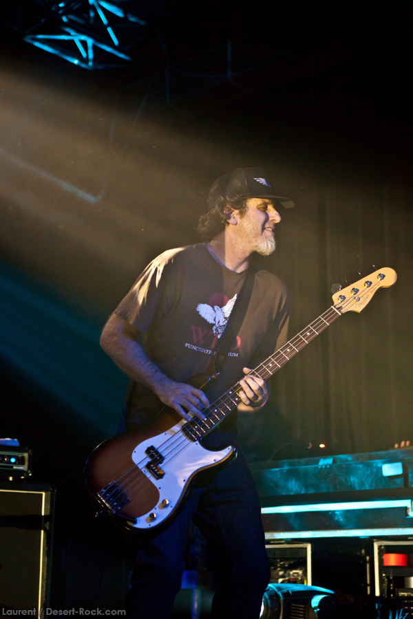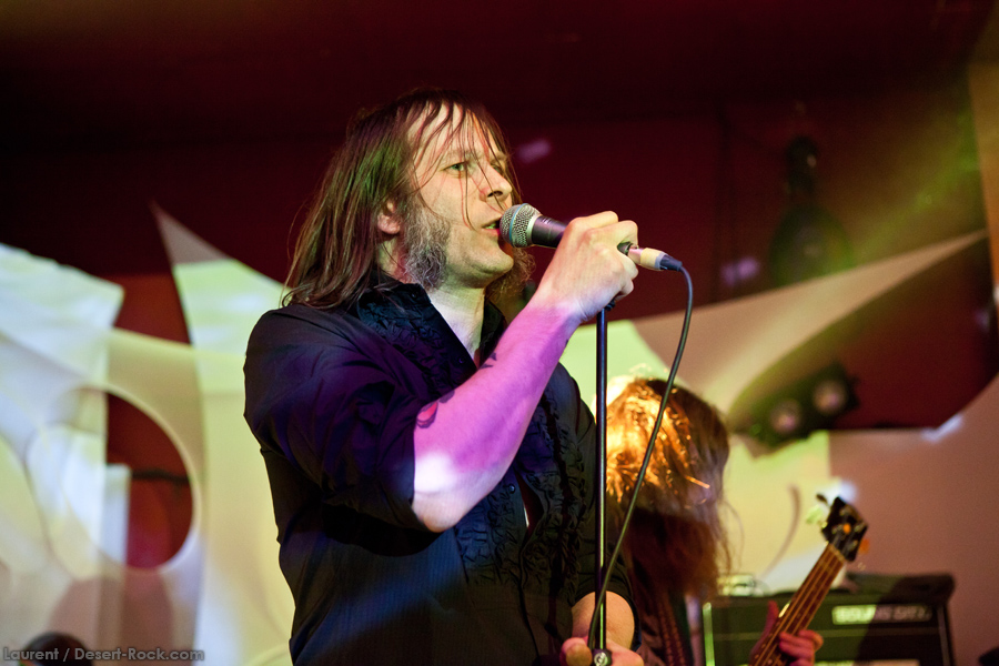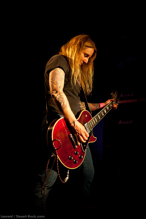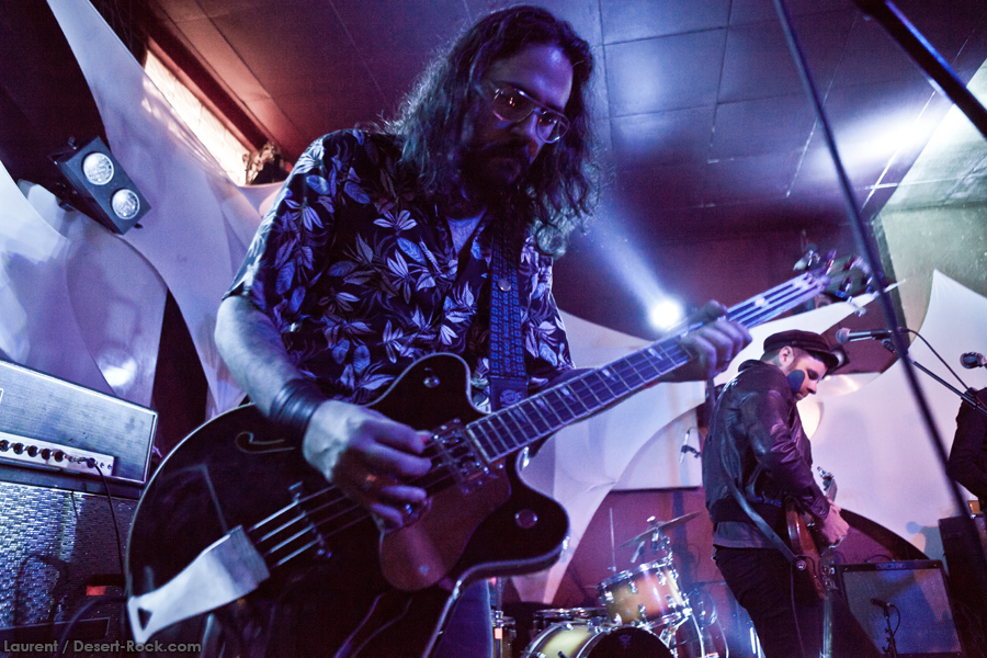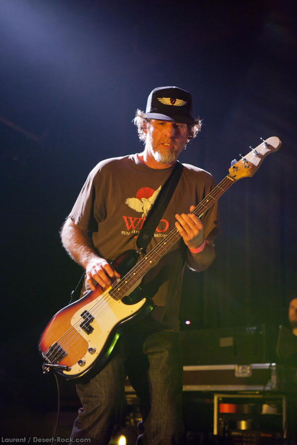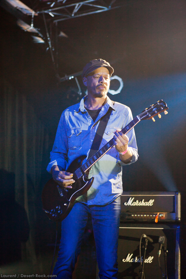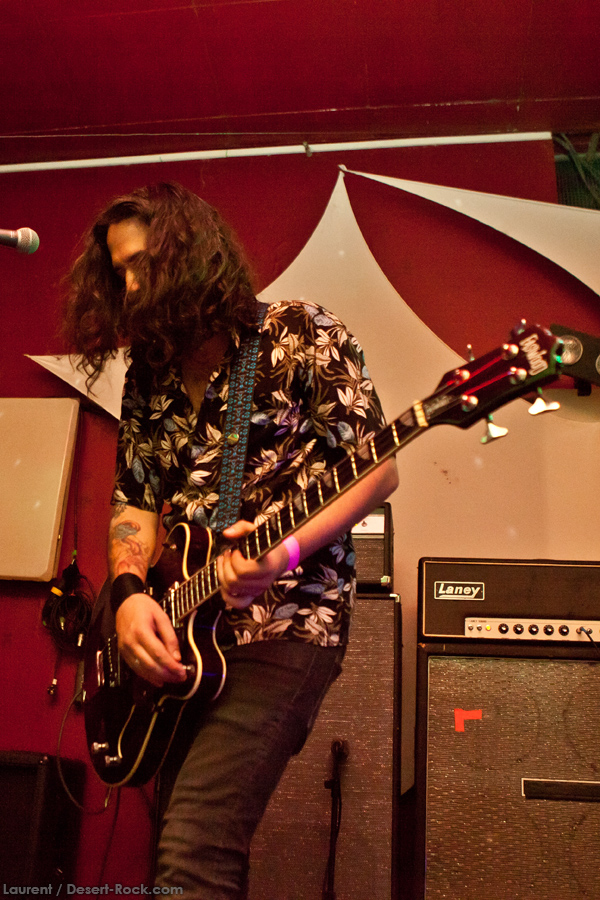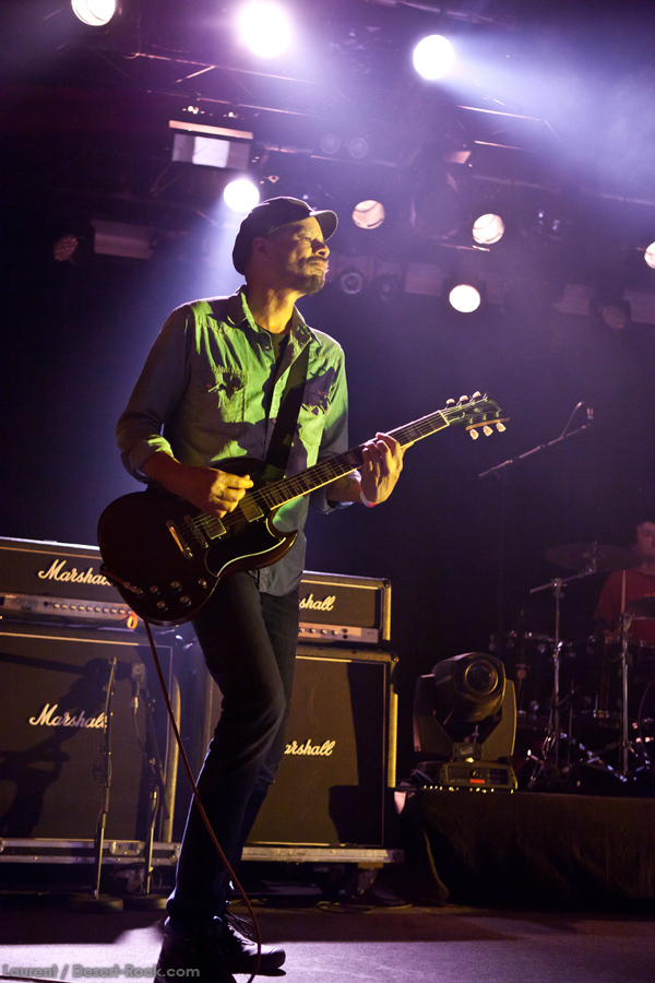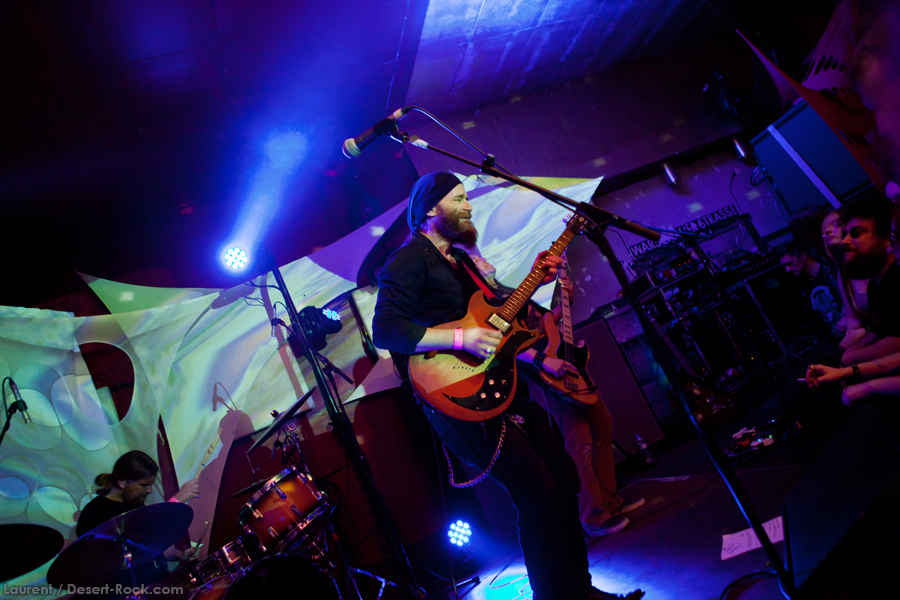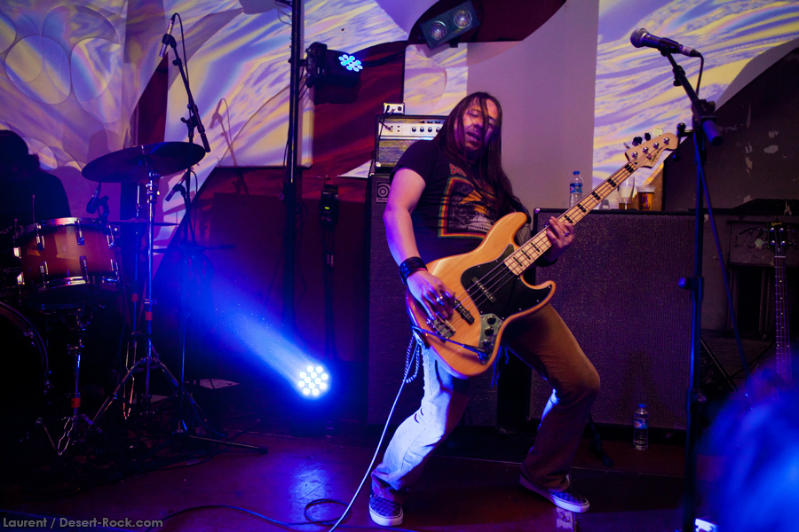 Présent depuis la veille sur le site du Desertfest, Brant Bjork était très attendu, et sa position de headliner de la journée est incontestable au vu de la notoriété démontrée du grand frisé ces derniers mois. Low profile jusqu’au bout des ongles, il débarque nonchalamment sur scène, un Martini à la main, qu’il dépose au sol devant ses retours, avant de s’engager avec son Low Desert Punk Band dans une impro instrumentale qui donne le ton de son set, impro se fondant en « Lazy Bones » enchaîné évidemment à l’indéboulonnable « Automatic Fantastic ». Plus qu’un vulgaire backing band, Bjork a trouvé une sacrée paire de cordistes avec le duo Bubba DuPree / Dave Dinsmore, qui l’épaulent avec efficacité et talent. On exprimera quelque réserve sur le nouveau batteur, Ryan Güt ; il faut dire que passer après Tony Tornay n’est pas facile, et le jeune batteur n’a pas le groove de son prédécesseur, même s’il fait le job. Le grand desert-rocker déroule un set de bon niveau, même si on sent le gaillard un peu en pilotage automatique de temps en temps, surtout quand on l’a déjà vu sur sa tournée précédente (d’autant plus que la set list n’est pas vraiment révolutionnée…) : tandis que le quatuor était impeccable de bout en bout il y a quelques mois, il vendange ici quelques titres qui perdent un peu en efficacité (« Too many chiefs… »). Mais on serait bien bégueule de ne pas apprécier la prestation du combo ce soir, qui déploie quand même une set list de classiques, qu’il étaye de quelques glorieuses impros instrus, et d’un nouveau titre en milieu de set. Soutenu par un light show efficace, et une évidente envie partagée de bien faire, le groupe joue sur du velours, surfant sur un coefficient sympathie qu’il n’a pas volé, ne serait-ce qu’au titre d’une carrière de besogneux, qui trouve son aboutissement légitime dans ces dernières tournées à succès. Perchés sur leur nuage, les zicos, heureux, festoieront une bonne part de la nuit, mettant à rude épreuve les détecteurs de fumée de leur loge jusqu’au bout de la nuit…