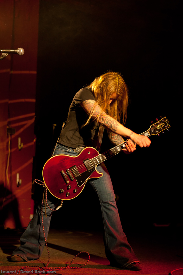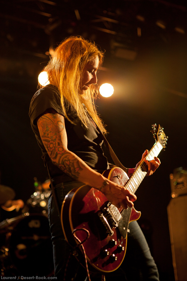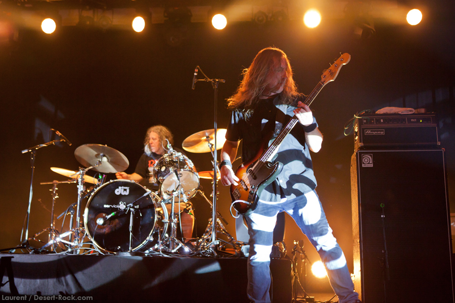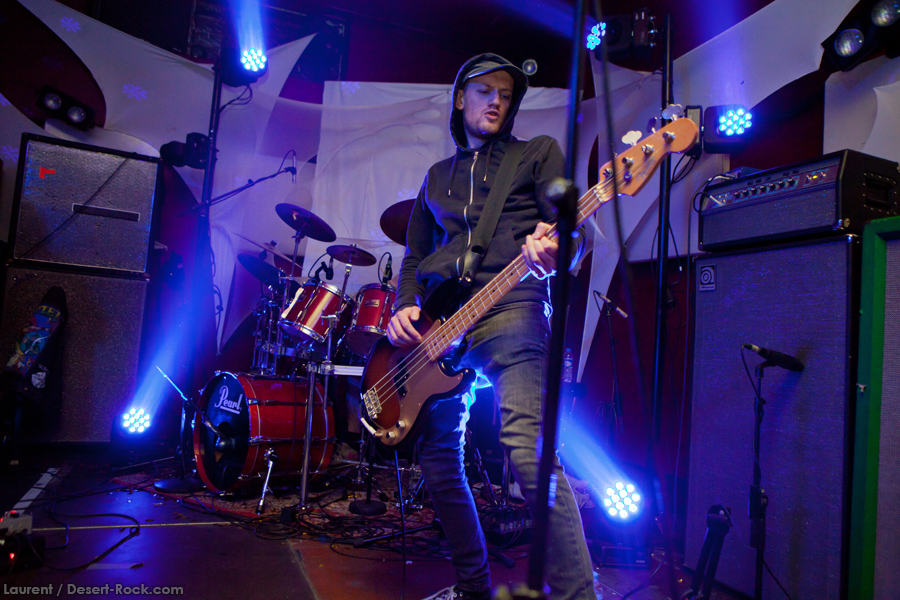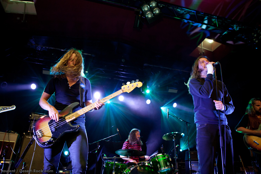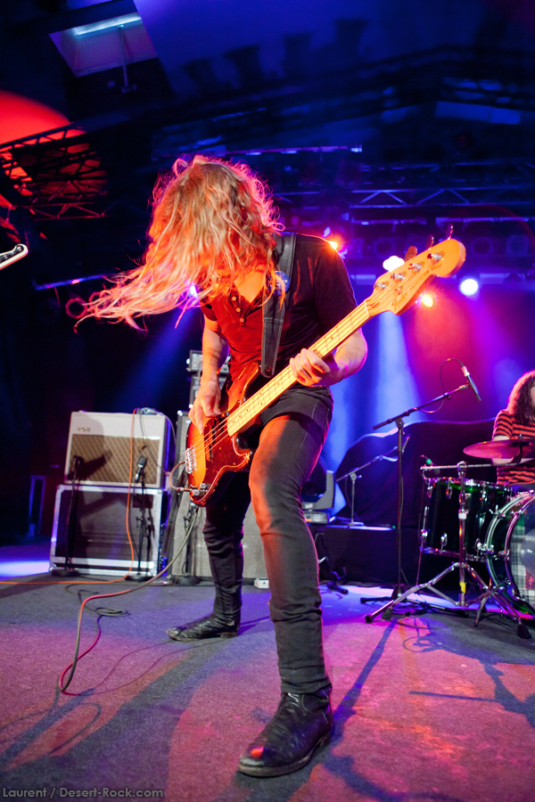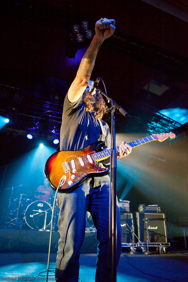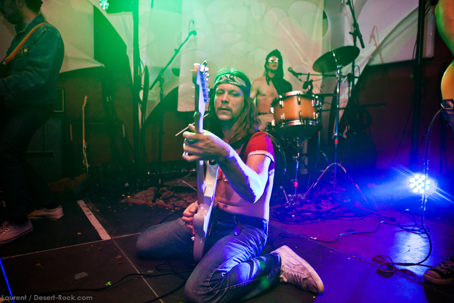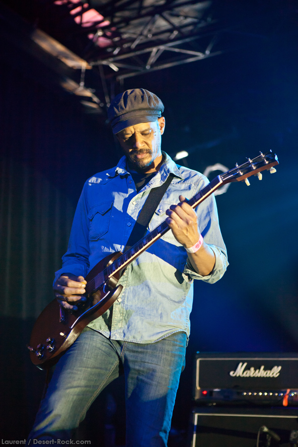 Présent depuis la veille sur le site du Desertfest, Brant Bjork était très attendu, et sa position de headliner de la journée est incontestable au vu de la notoriété démontrée du grand frisé ces derniers mois. Low profile jusqu’au bout des ongles, il débarque nonchalamment sur scène, un Martini à la main, qu’il dépose au sol devant ses retours, avant de s’engager avec son Low Desert Punk Band dans une impro instrumentale qui donne le ton de son set, impro se fondant en « Lazy Bones » enchaîné évidemment à l’indéboulonnable « Automatic Fantastic ». Plus qu’un vulgaire backing band, Bjork a trouvé une sacrée paire de cordistes avec le duo Bubba DuPree / Dave Dinsmore, qui l’épaulent avec efficacité et talent. On exprimera quelque réserve sur le nouveau batteur, Ryan Güt ; il faut dire que passer après Tony Tornay n’est pas facile, et le jeune batteur n’a pas le groove de son prédécesseur, même s’il fait le job. Le grand desert-rocker déroule un set de bon niveau, même si on sent le gaillard un peu en pilotage automatique de temps en temps, surtout quand on l’a déjà vu sur sa tournée précédente (d’autant plus que la set list n’est pas vraiment révolutionnée…) : tandis que le quatuor était impeccable de bout en bout il y a quelques mois, il vendange ici quelques titres qui perdent un peu en efficacité (« Too many chiefs… »). Mais on serait bien bégueule de ne pas apprécier la prestation du combo ce soir, qui déploie quand même une set list de classiques, qu’il étaye de quelques glorieuses impros instrus, et d’un nouveau titre en milieu de set. Soutenu par un light show efficace, et une évidente envie partagée de bien faire, le groupe joue sur du velours, surfant sur un coefficient sympathie qu’il n’a pas volé, ne serait-ce qu’au titre d’une carrière de besogneux, qui trouve son aboutissement légitime dans ces dernières tournées à succès. Perchés sur leur nuage, les zicos, heureux, festoieront une bonne part de la nuit, mettant à rude épreuve les détecteurs de fumée de leur loge jusqu’au bout de la nuit…